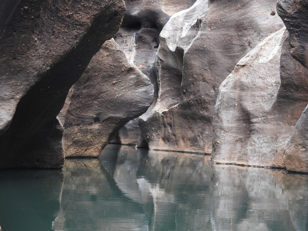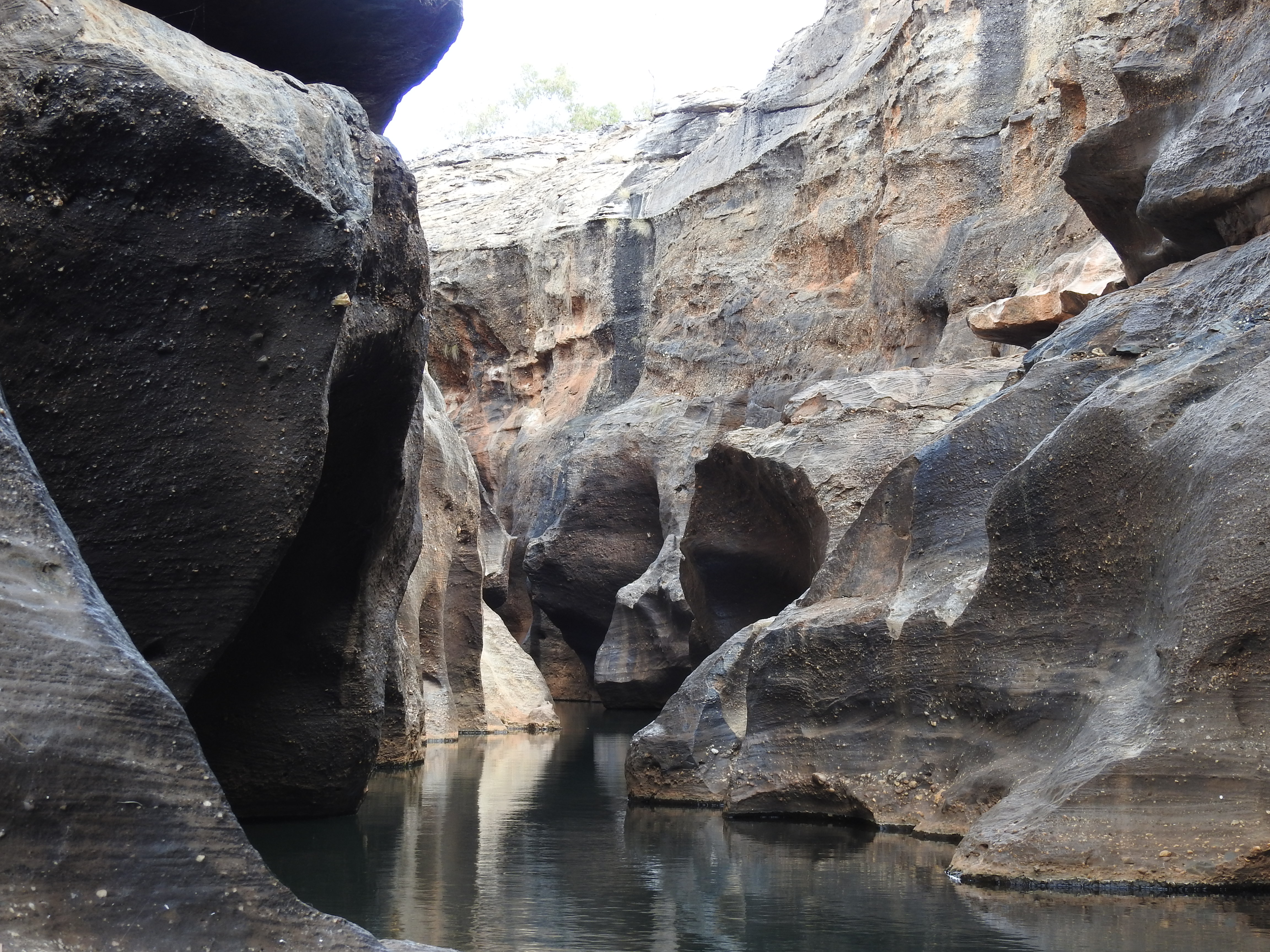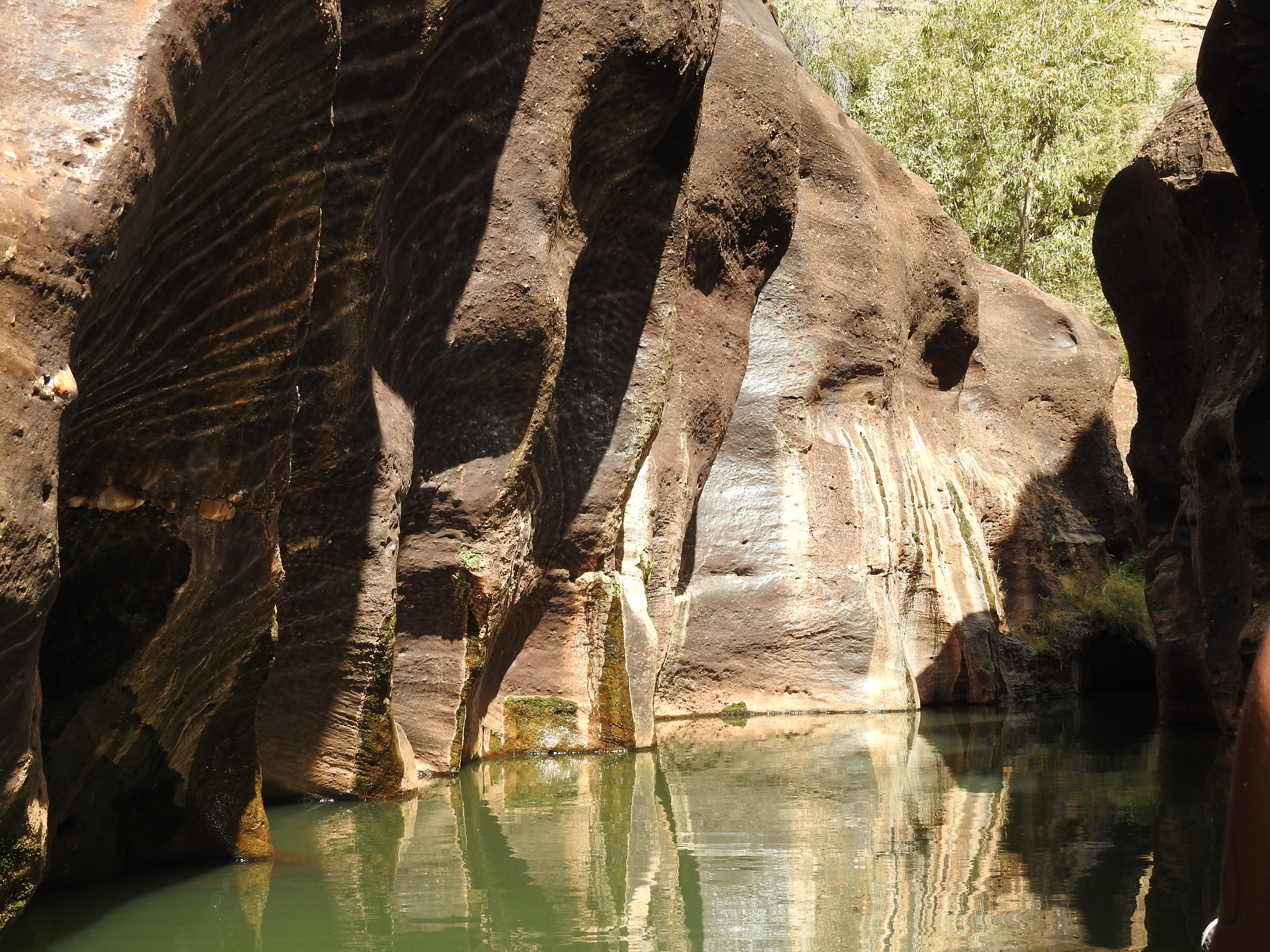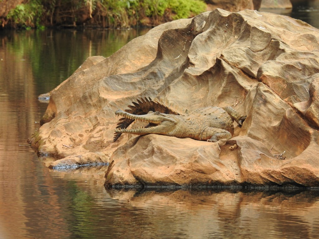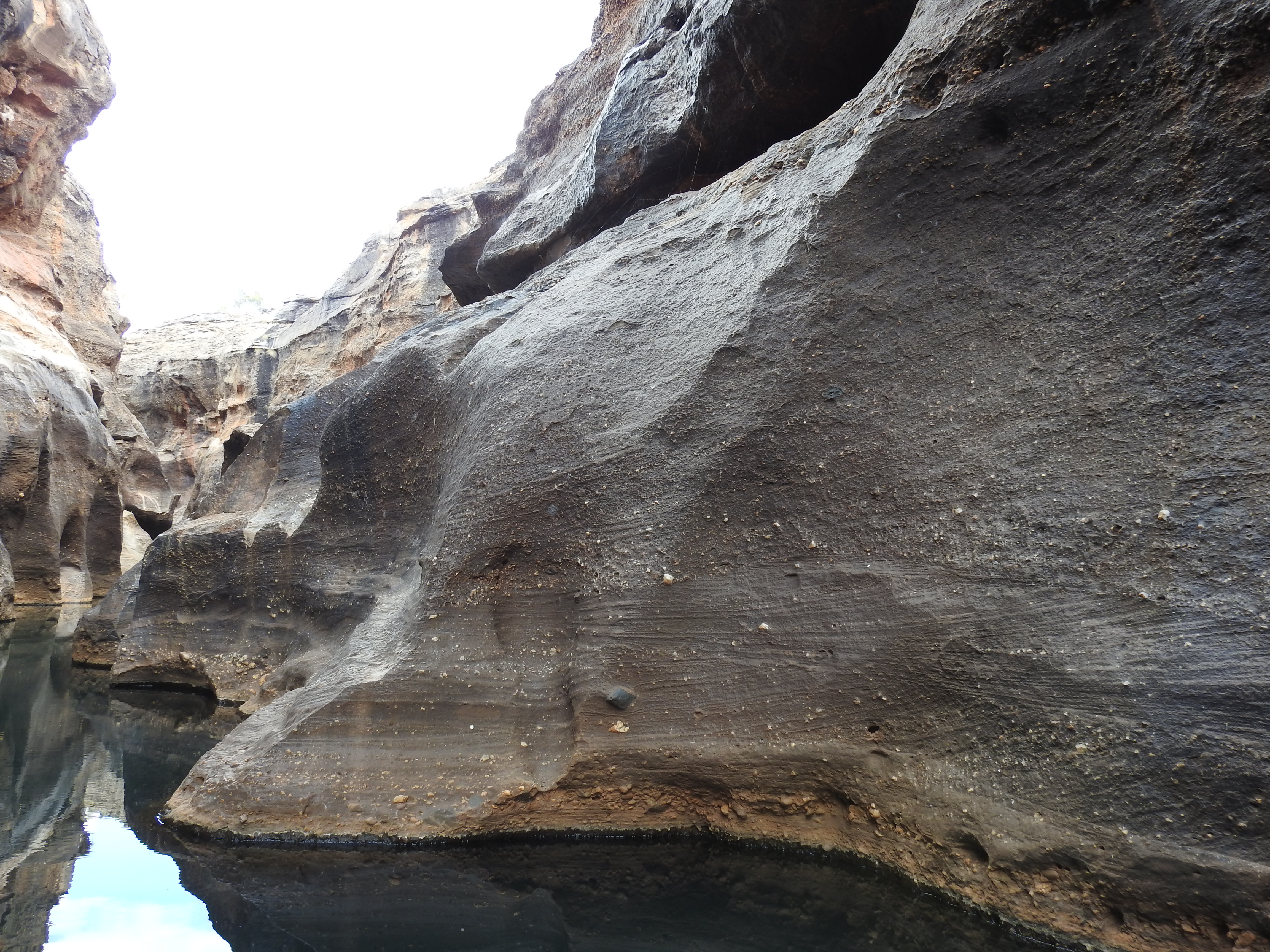 We start with a short talk on the history and then walk a short way to a floating pontoon with some narrow flat bottomed aluminium boats tied up. They have an electric motor on each end of them. Fourteen of us fit snugly on the boat and we need to do a bit of re-balancing to keep the weight distribution even. The electric motors are very quiet and we spot a couple of freshwater crocodiles sunning themselves before we enter the gorge proper. Stunning is the best word to describe it, nature at its best. The gorge is very narrow & gets narrower the further we progress up it. The rock is highly polished in places from the swirling water when the creek is in flood. In some sections there are bands of exposed rounded rocks from the sedimentary layers. There are lots of small fish swimming, but no water birds inside the gorge. The gorge twists and turns & each corner we turn seems more stunning than the last. As we reach the top of the gorge we need to stop & wait for the previous boat to come back out. The 2 boats are very narrow but the gorge is even narrower. We touch rock in lots of places with the boat as we pass through some very narrow sections. The trip back is just as spectacular and we enjoy every twist & turn.