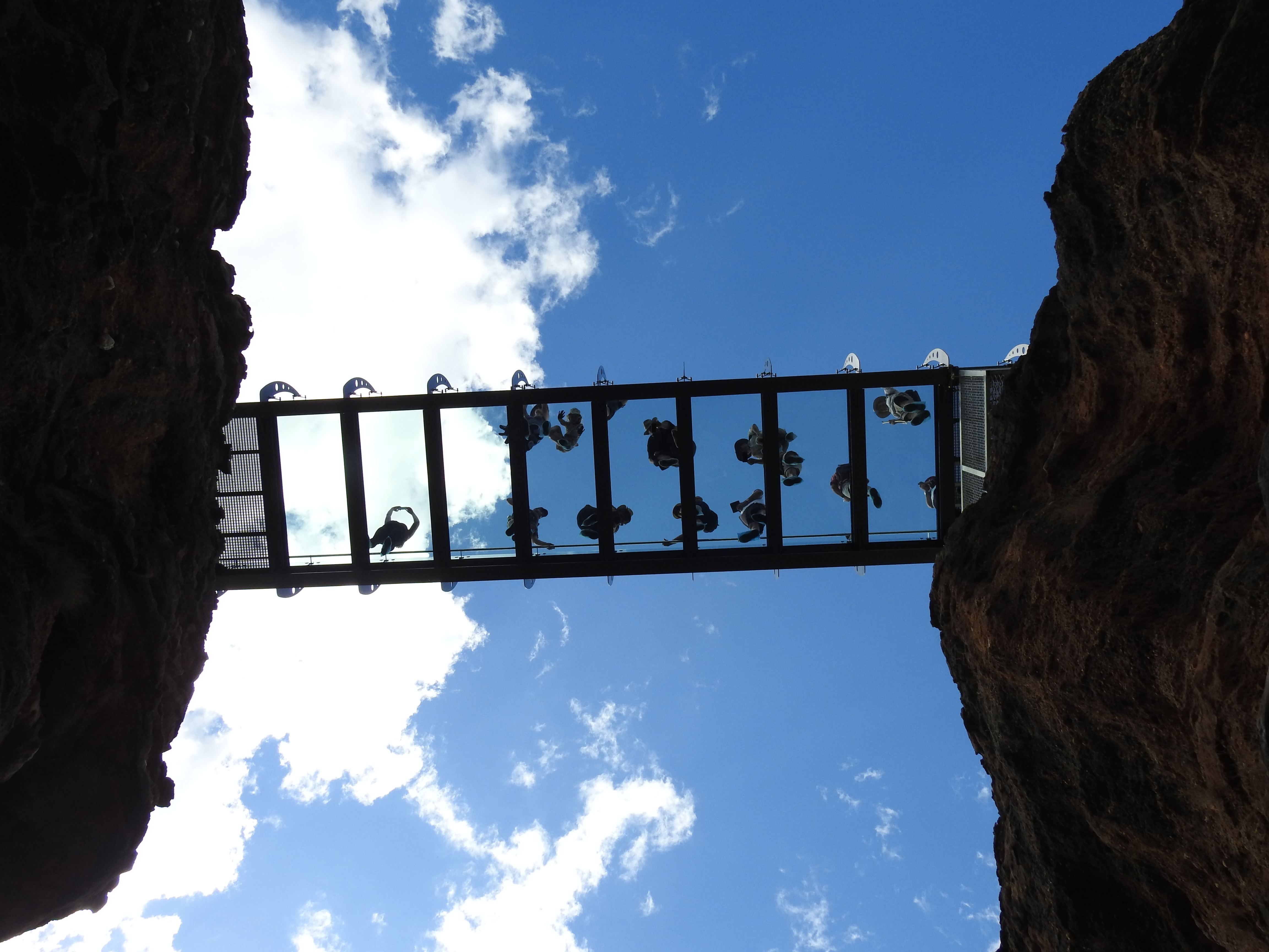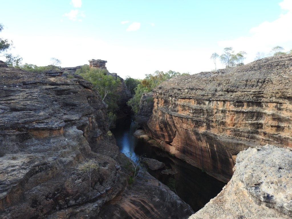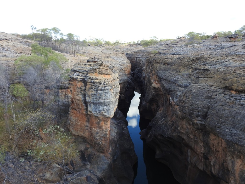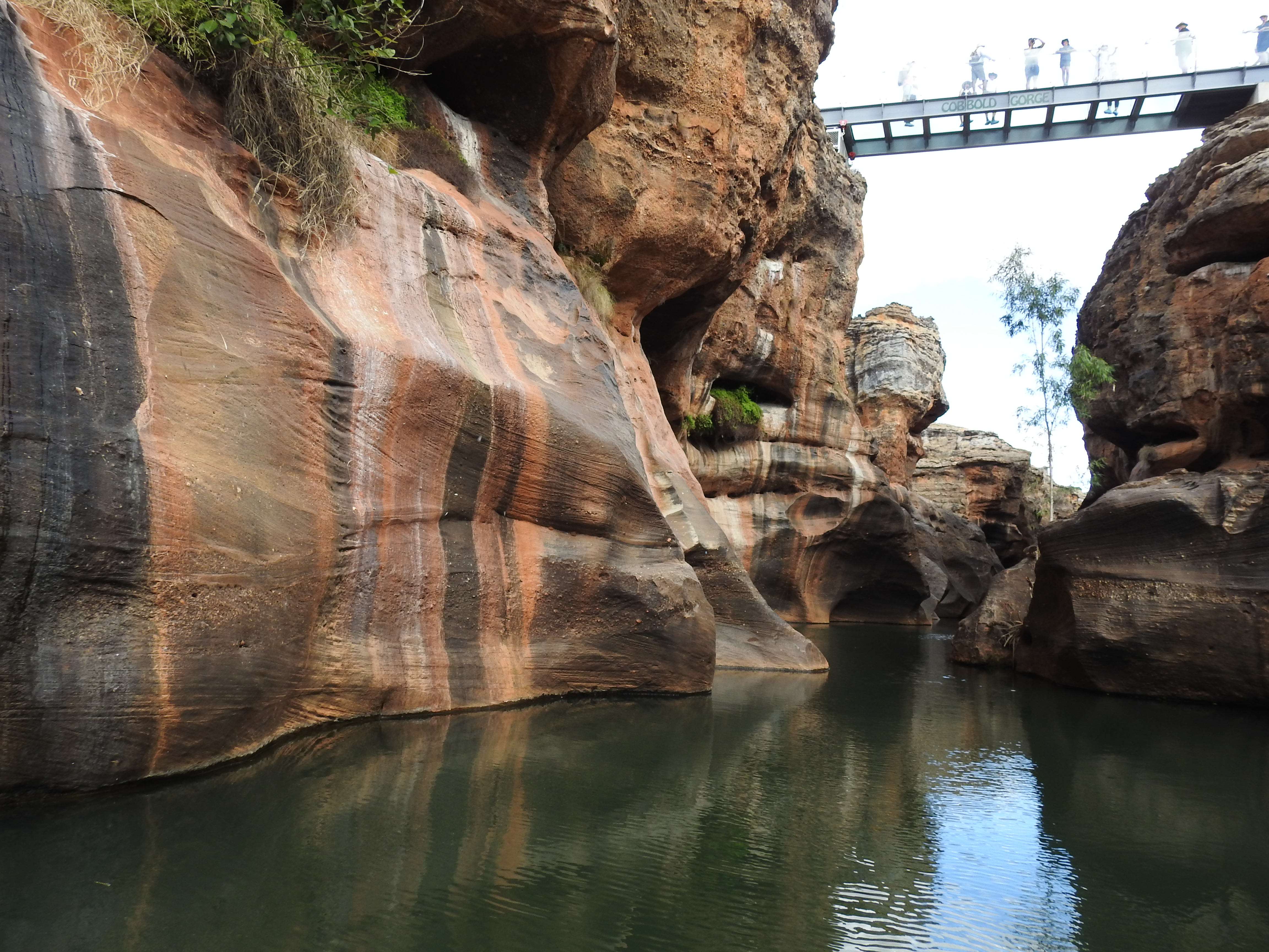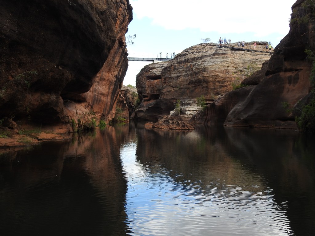 After we disembark we start a bush walk and our guide explains some bush tucker food, the different plant & foods that can be eaten plus the different trees and names of them. The walk is very nice & our guide stops & tells the story of Corbett, a man that died not far from here with an aboriginal spear in him more than 150 years ago. His grave is not far away through the bush. We climb up onto the sandstone escarpment and marvel at the beauty that surround us. Our path takes us next to an amazing glass bridge over the gorge. (The only glass bottomed bridge that exists in Australia). We are all given covers to put over our shoes so that we don’t scratch the glass. The views along the gorge are stunning. Our path takes us back down a narrow split in the sandstone before we emerge from the bush not far from the big shed & the buses.