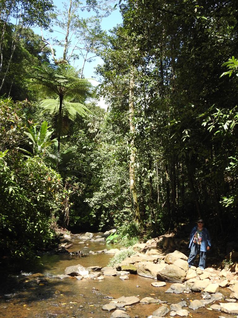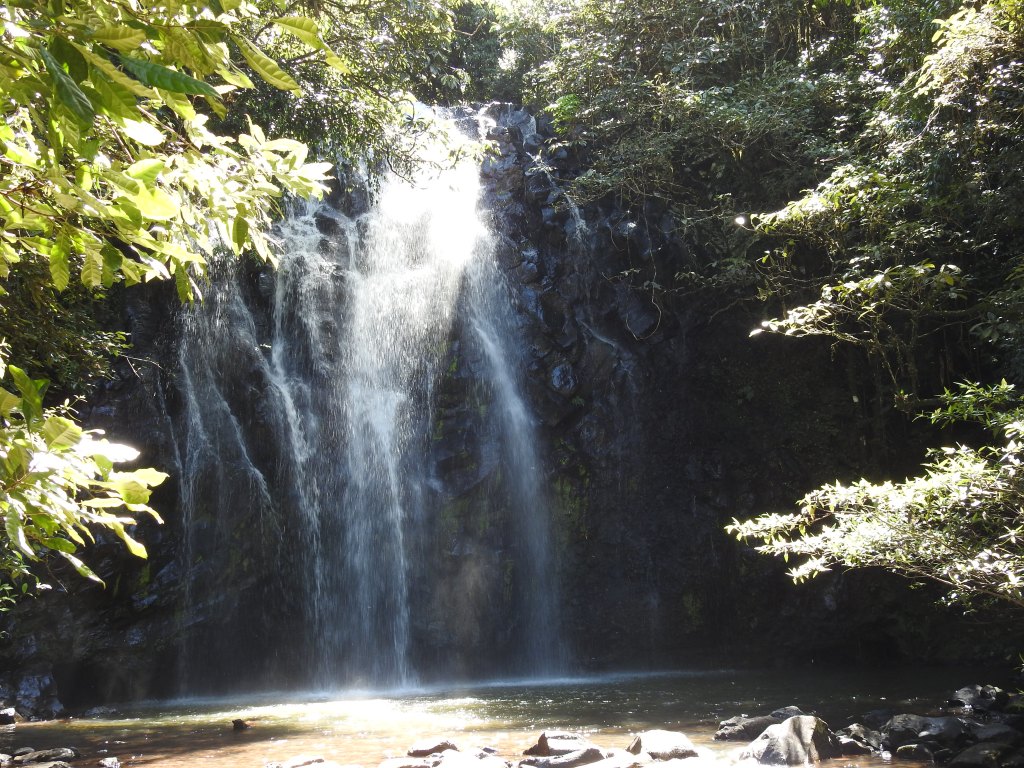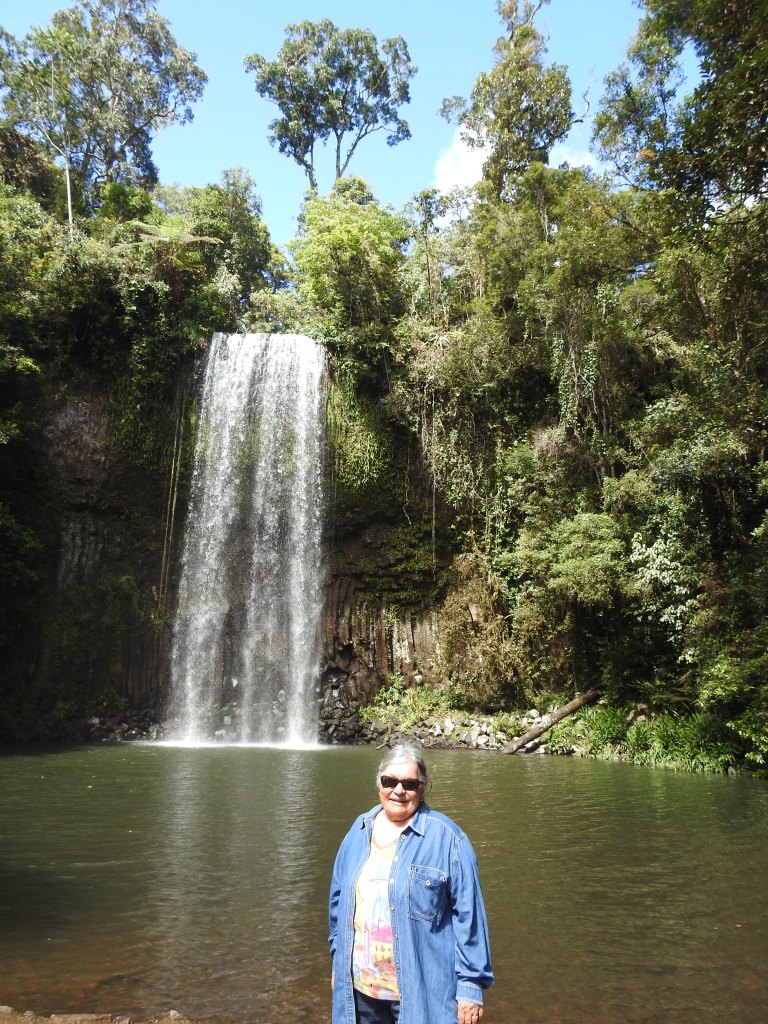 We woke up 8.20am this morning, later than usual. The warm doona was welcome during the night. It is a cool morning. We booked in for another night, outside the reception there is a beautifully coloured & very large Golden orb spider welcoming us. This caravan park has ducks, chooks, brush turkeys & goats running all over the place, they even have an alpaca & pony in an enclosure for kids & all to enjoy. After breakfast our first visit is to Malanda Falls, only about 400 meters from our van, and right next to the caravan park. We walked through real rainforest then down some steps & we saw this amazing waterfall. It looks like the town has made the waterhole under the falls into a swimming pool – very nice indeed. This has wetted our appetite to see more so we went on a waterfall trail.