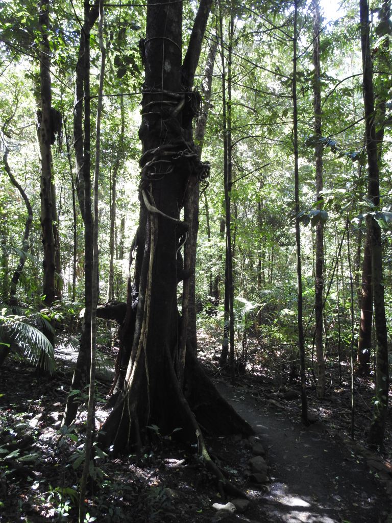 Our first stop is at Millaa Millaa Falls, a really beautiful high fall with a nice big swimming hole under it. We admire the falls with a few other tourists, the cars in the carpark are varied with not one Queensland number plate. Next is only 8km down the road, the Zillie Falls. The walk in from the carpark is only short, but we only get a view of the top half of the falls as the track down to the base is very muddy and rough and not worth the trouble according to a couple that went down the track. Onward to Elinjaa Falls another 2km down the road and this has a paved track down with good steps and the falls are really worth the effort, a really beautiful display as it tumbles over the rocks.