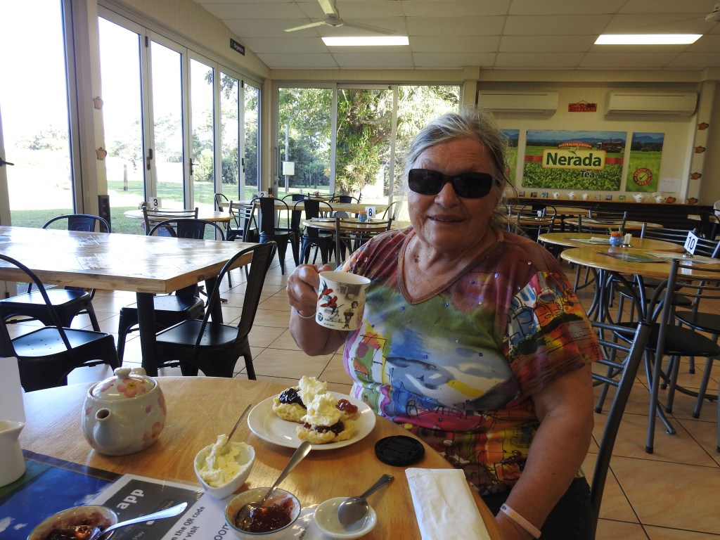 As we come into Malanda we turn off to the Nerada Tea Plantation, Australia’s largest, and drive the 10km out through lush dairy farms. The plantation has more than 360 hectares of tea fields, producing around 6.6 million kilos of fresh tea leaves each year. We order tea & scones but are alerted to some tree kangaroos that have been spotted in a row of trees next to the teahouse. We have now seen our first tree kangaroos, around 10 metres up. They are called a Lumholtz tree kangaroo and are the size of a small wallaby. Amazingly they hop between branches feeding on the leaves of the trees. The tea and scones with jam & cream were very tasty & again full bellies. No dinner tonight. The gentle sound of the Malanda Falls lulls us to sleep. Another great day to be grateful to be alive.