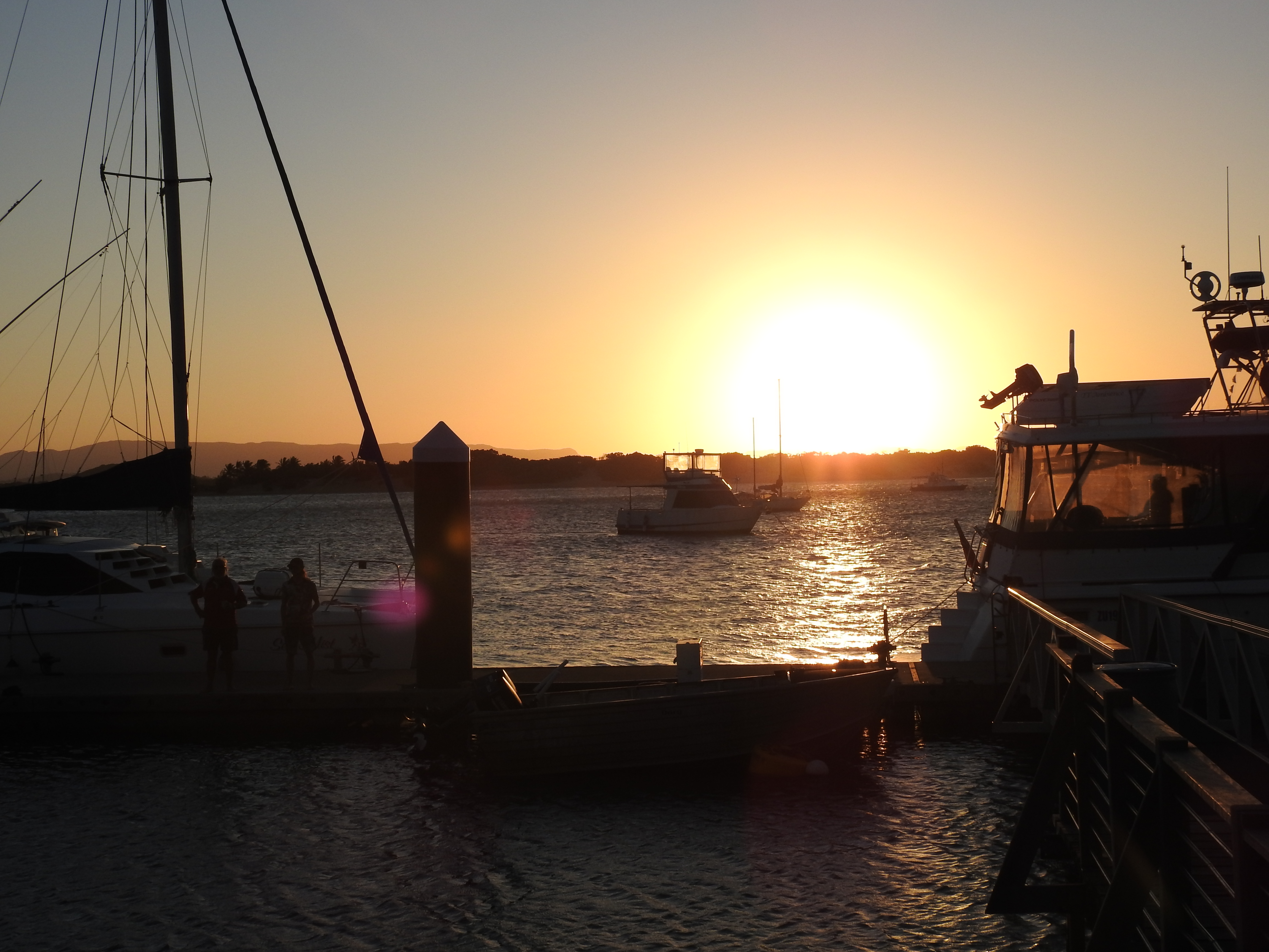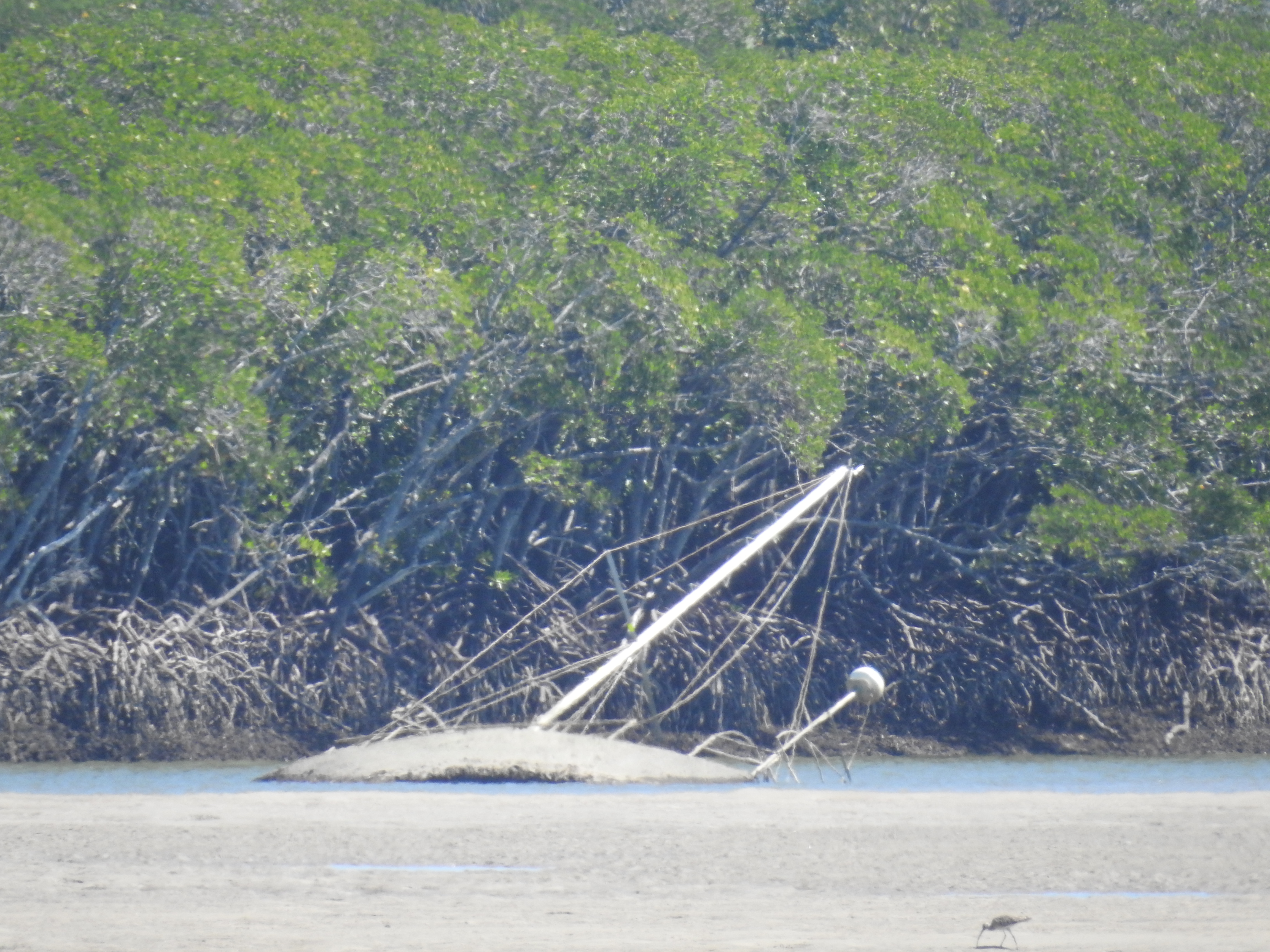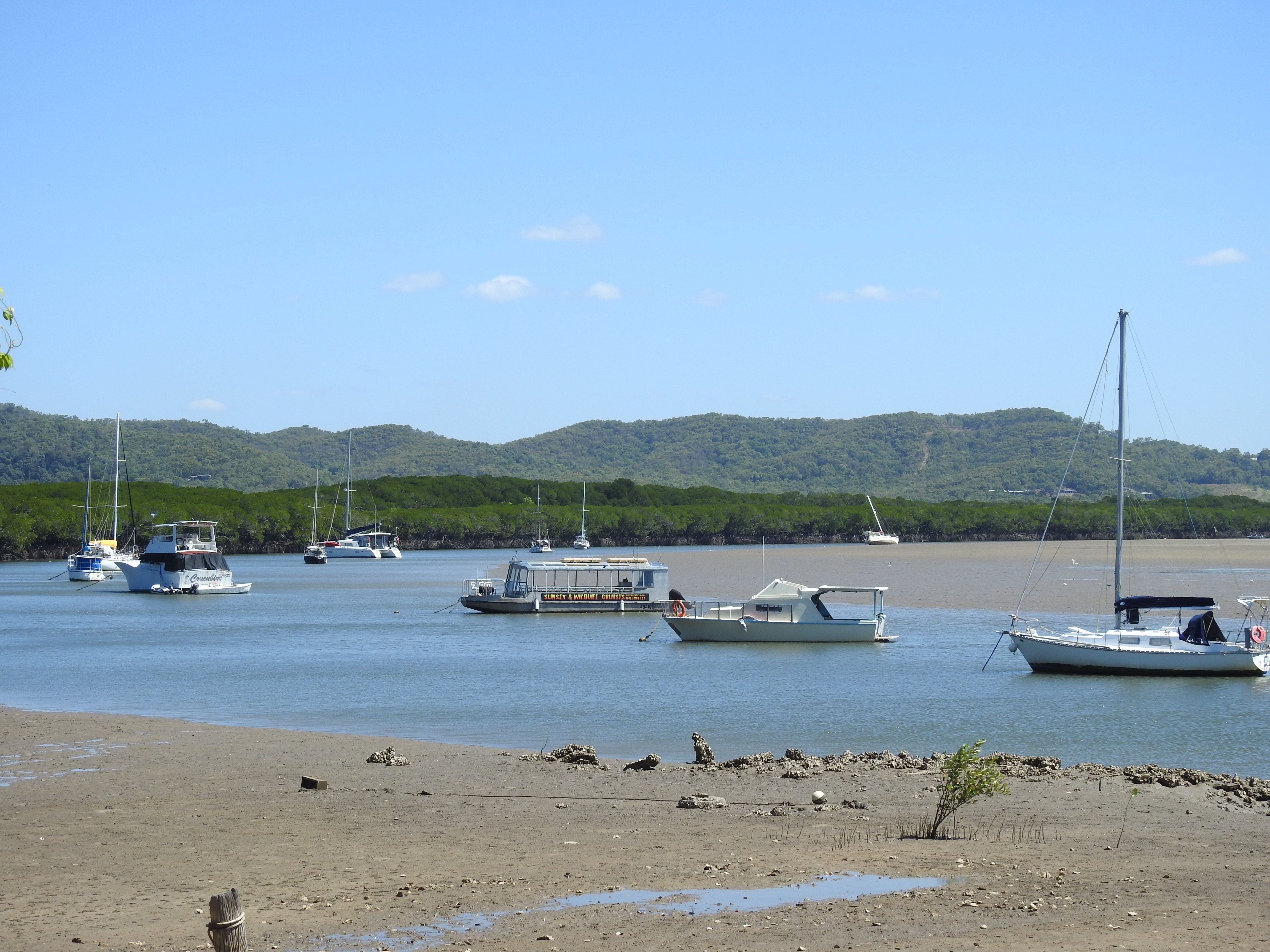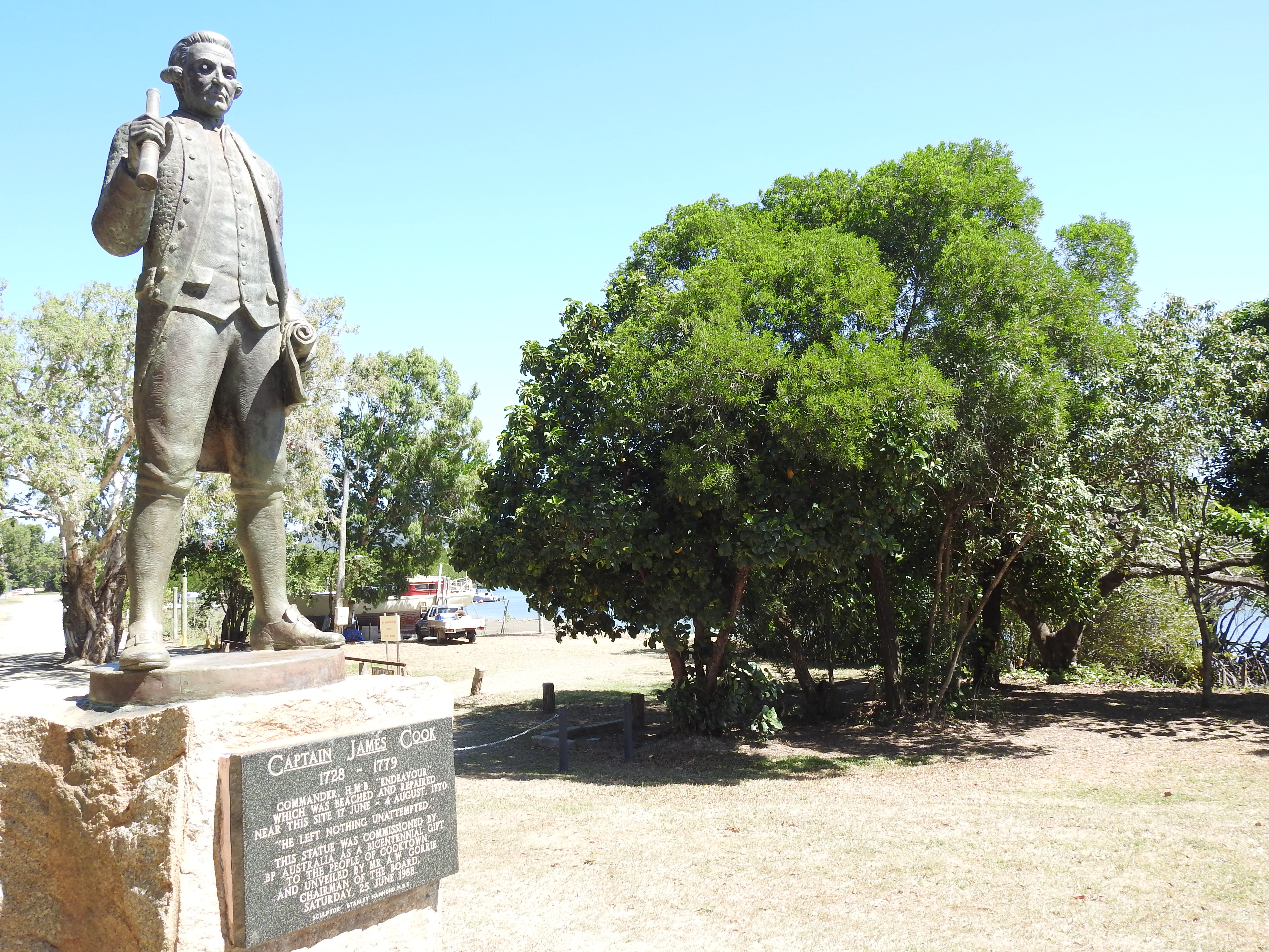 It was lunchtime so we bought some buns from the bakery and some prawns down at the fisherman’s wharf and went down to the waterfront. We were sitting near Cook’s statue looking over the Endeavour River and the boats moored there, one had sunk & a few stranded on the sandbar at low tide.