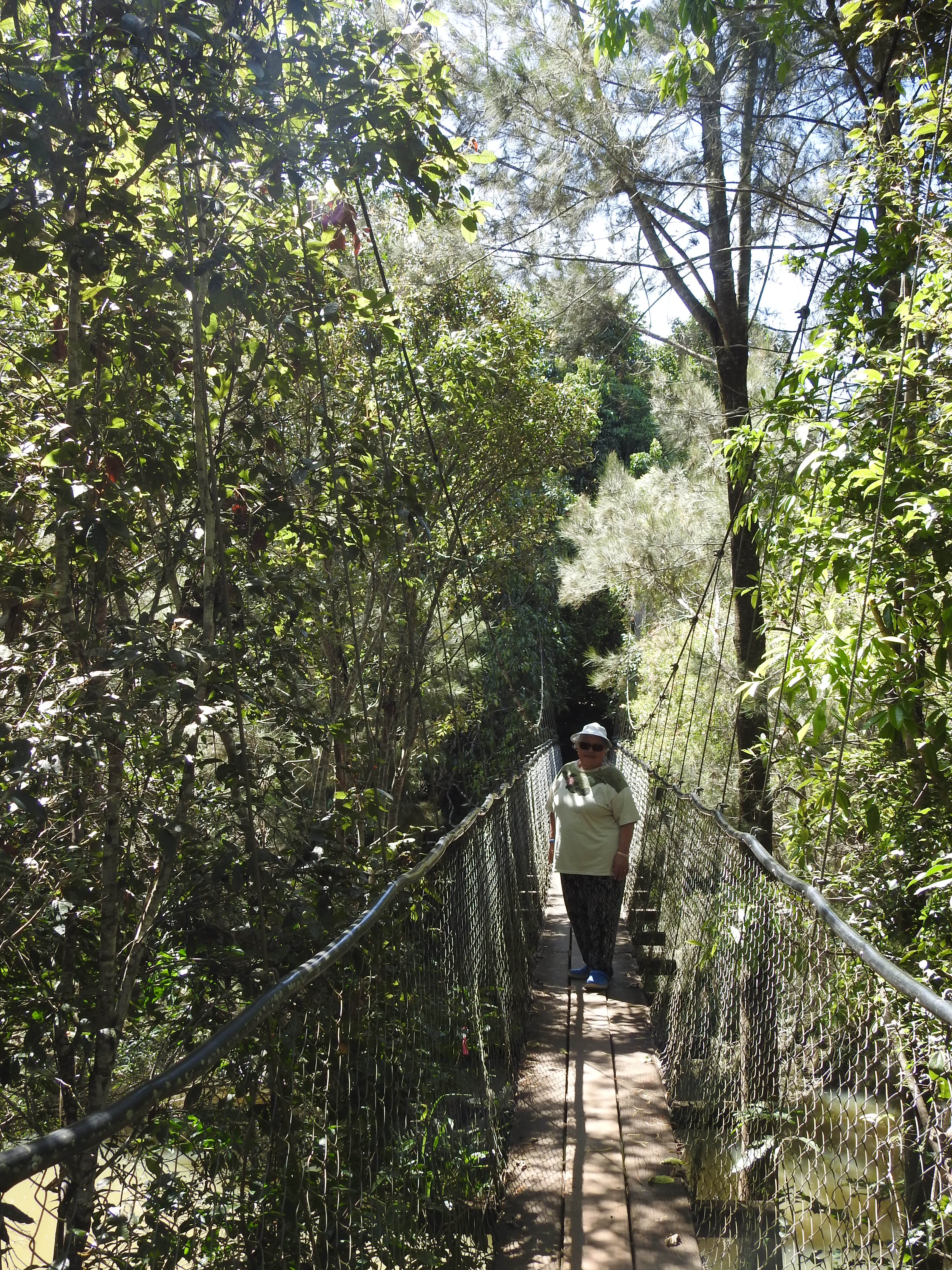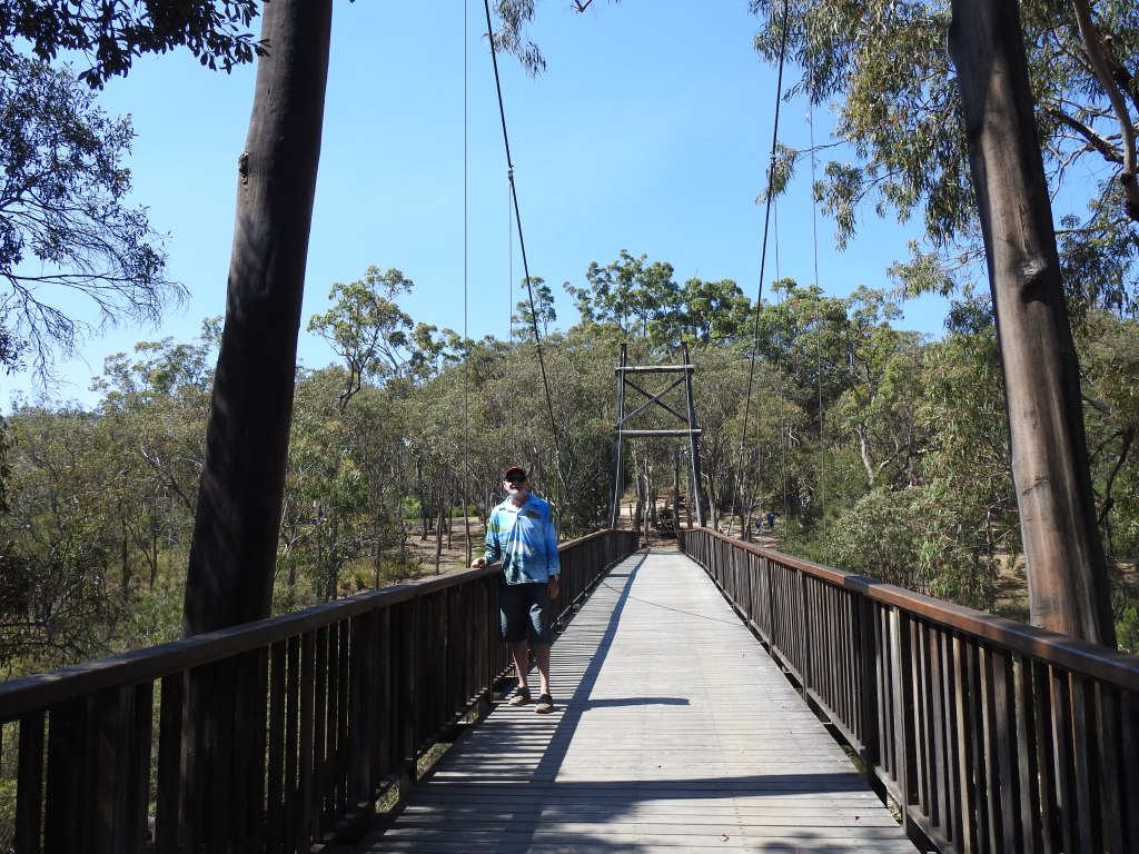 At the end of the street is Peterson Creek & there is a platypus walk along the creek & a viewing hide. The creek bank has been revegetated over the years and there is a 15 minute walk (QLD time, the time we know is a lot longer than theirs) to a small suspension bridge that we take. There are small birds everywhere and we spot some elusive platypus. The walk is very quiet and beautiful, you forget you are next to a town & near a busy road.