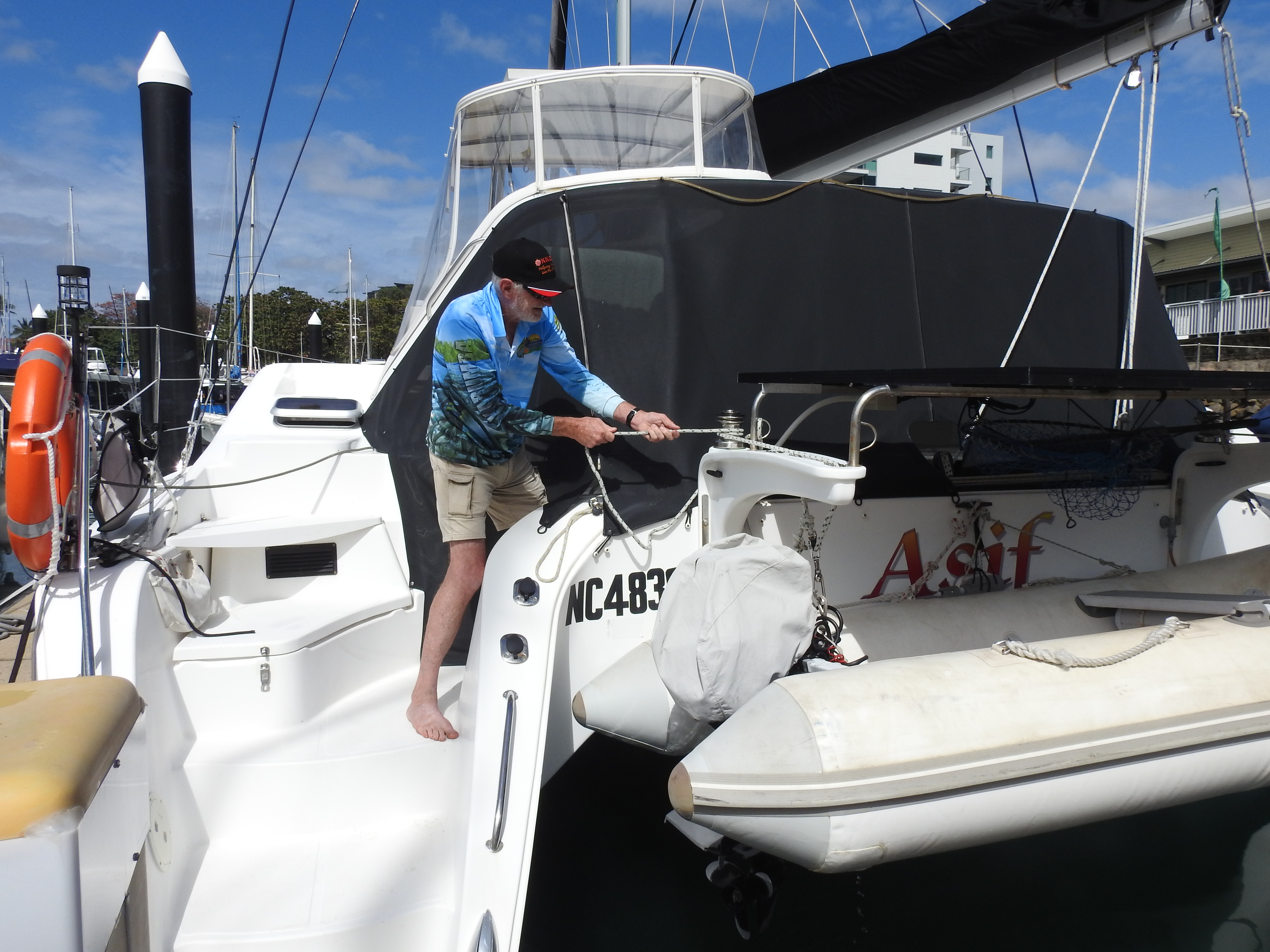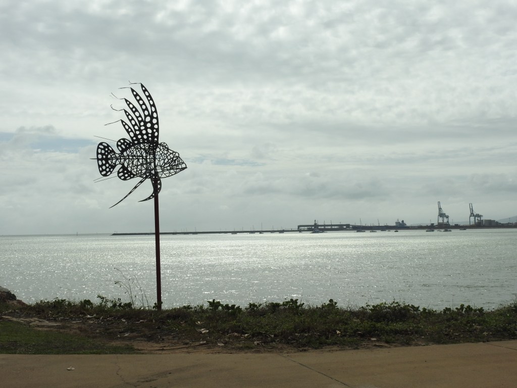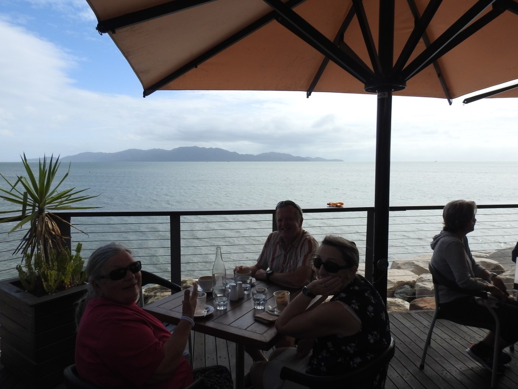 Up bright & early as the car is booked in for a service at 8am in Townsville city. Our friends drive in & pick us up from the mechanics then take us down to the marina. They want to check over their catamaran moored at the marina after all the rain to see if it leaked during the downpour. A hatch leaked onto a bed so off with the sheets to take home & wash. We walk along the Strand at Townsville along the beachfront looking over to Magnetic Island, there are lots of people out walking & jogging. We drop into a café for coffee on the seafront looking out at Magnetic Island, it is a nice view & the coffee is good. I also have eggs benedict with salmon for breakfast, very tasty.