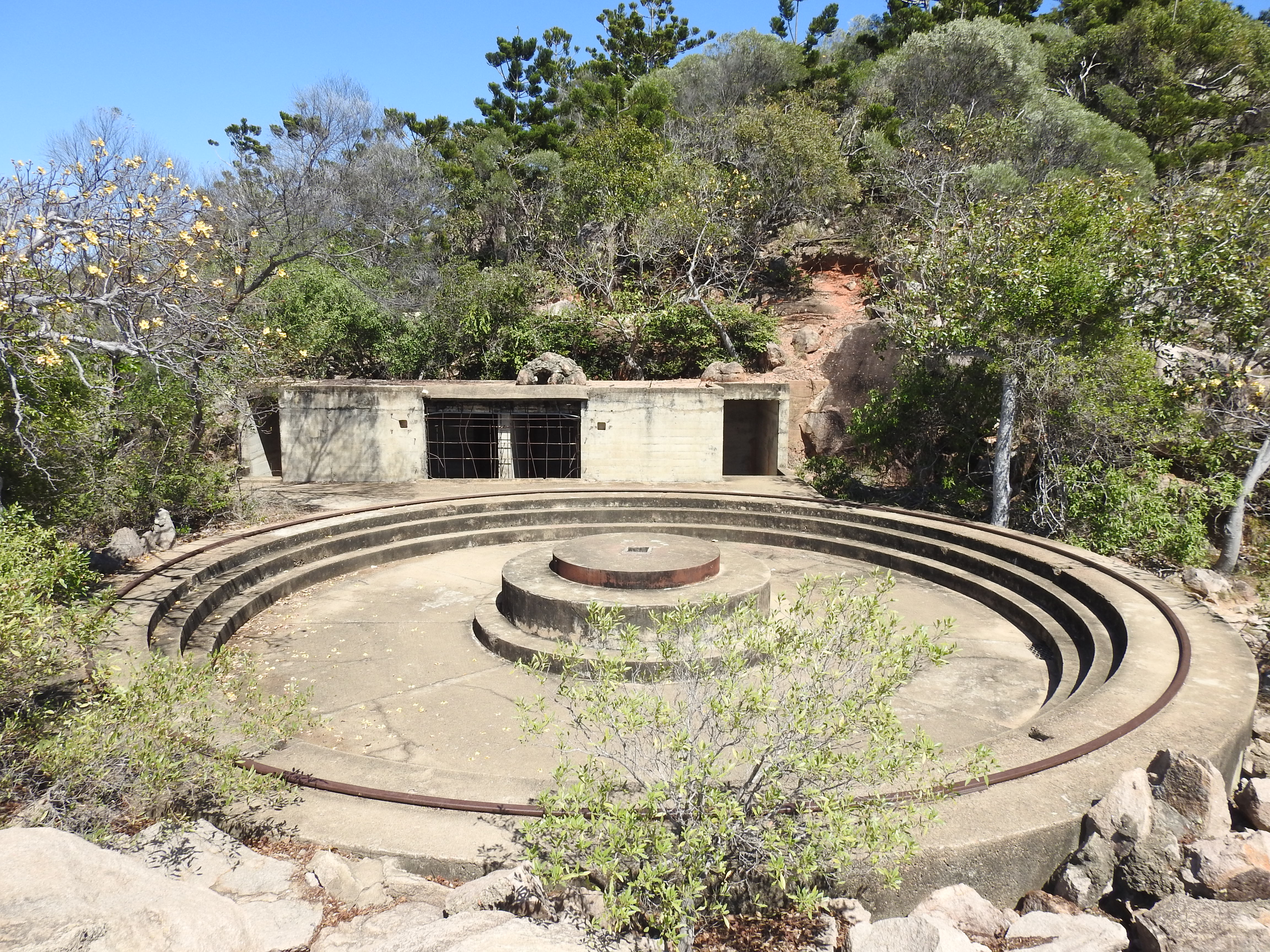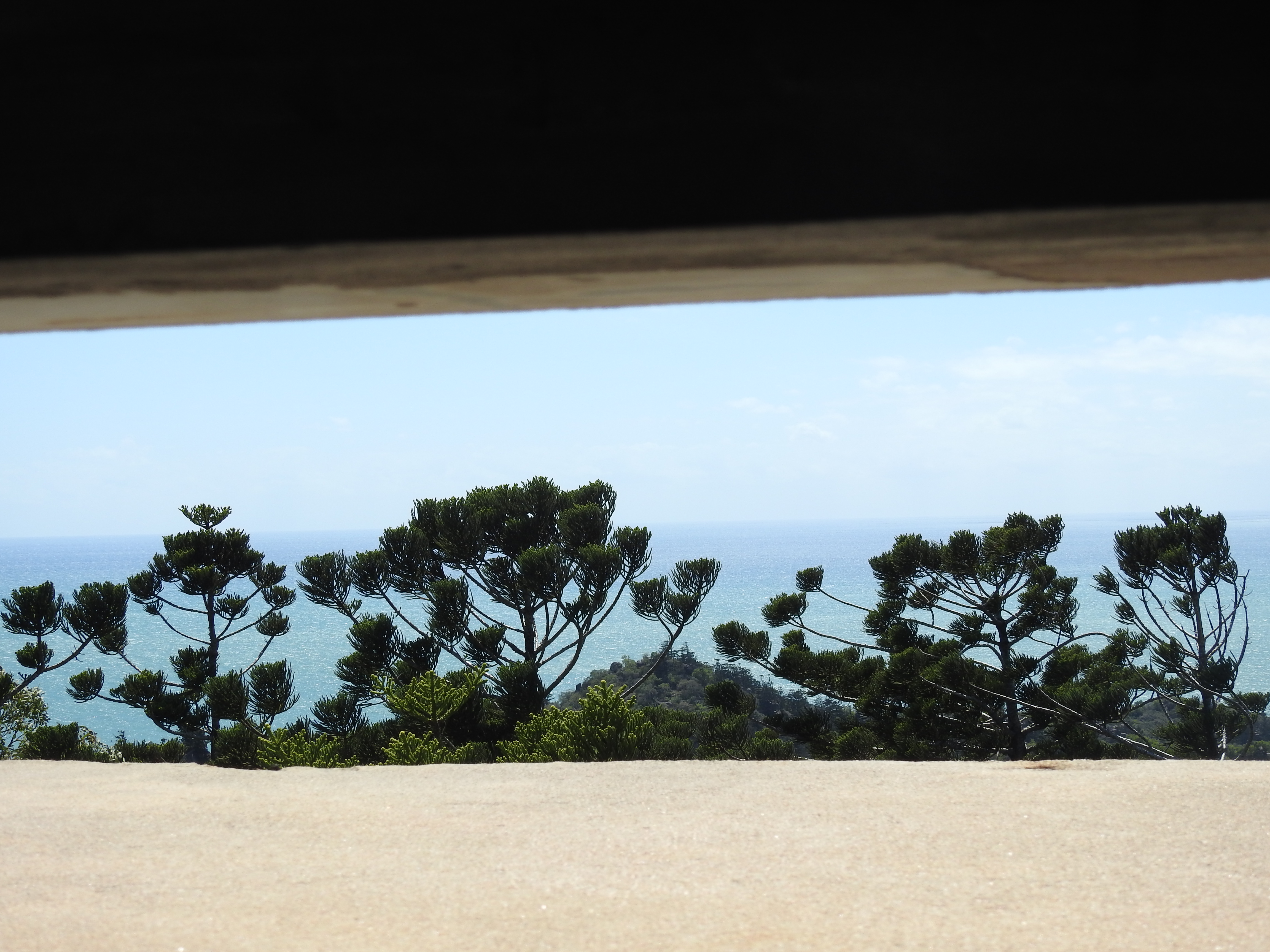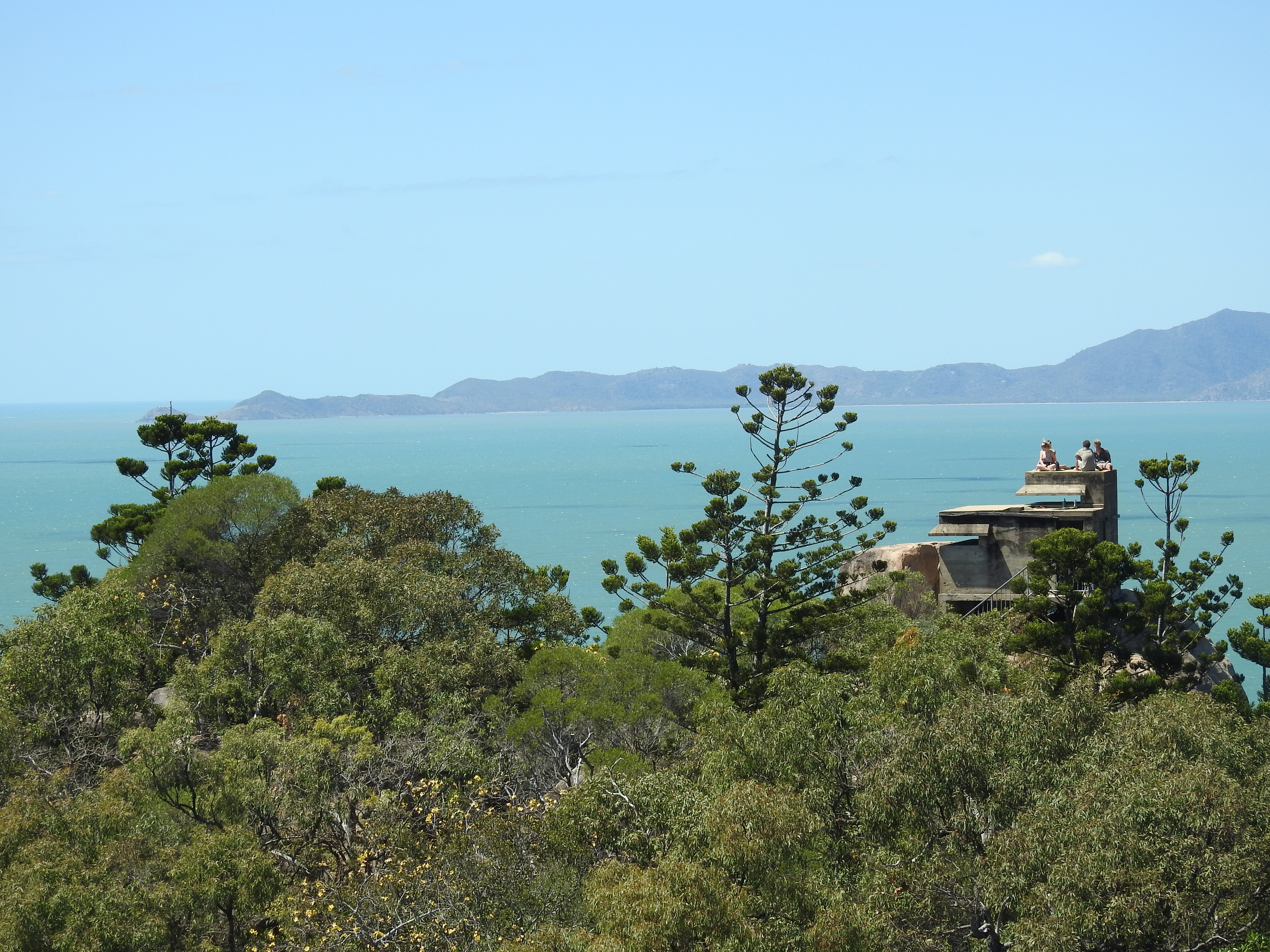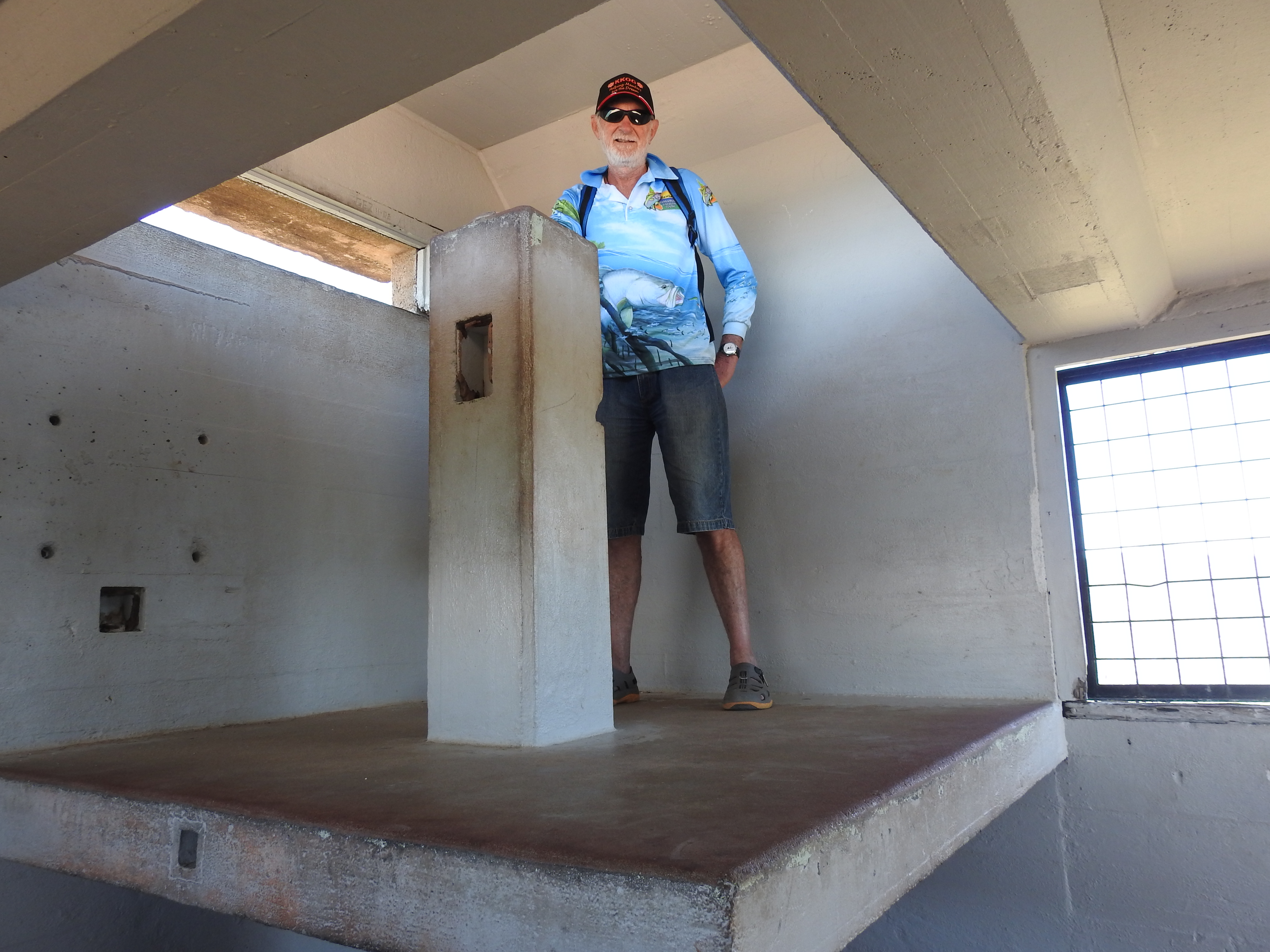 The two gun emplacements have great views over the sea with the range-finder site even better views over this beautiful island. Now the going gets steep & we walk up many rough stone steps to the base of the concrete command post. Now a steep ladder to get to the top of the command post and more sensational views over this beautiful island. It is very windy and we get buffeted. A sailing boat heading to Townsville is making heavy going of it against the big seas. Tereza has done very well walking all this way & climbing the ladders with her dodgy knees.