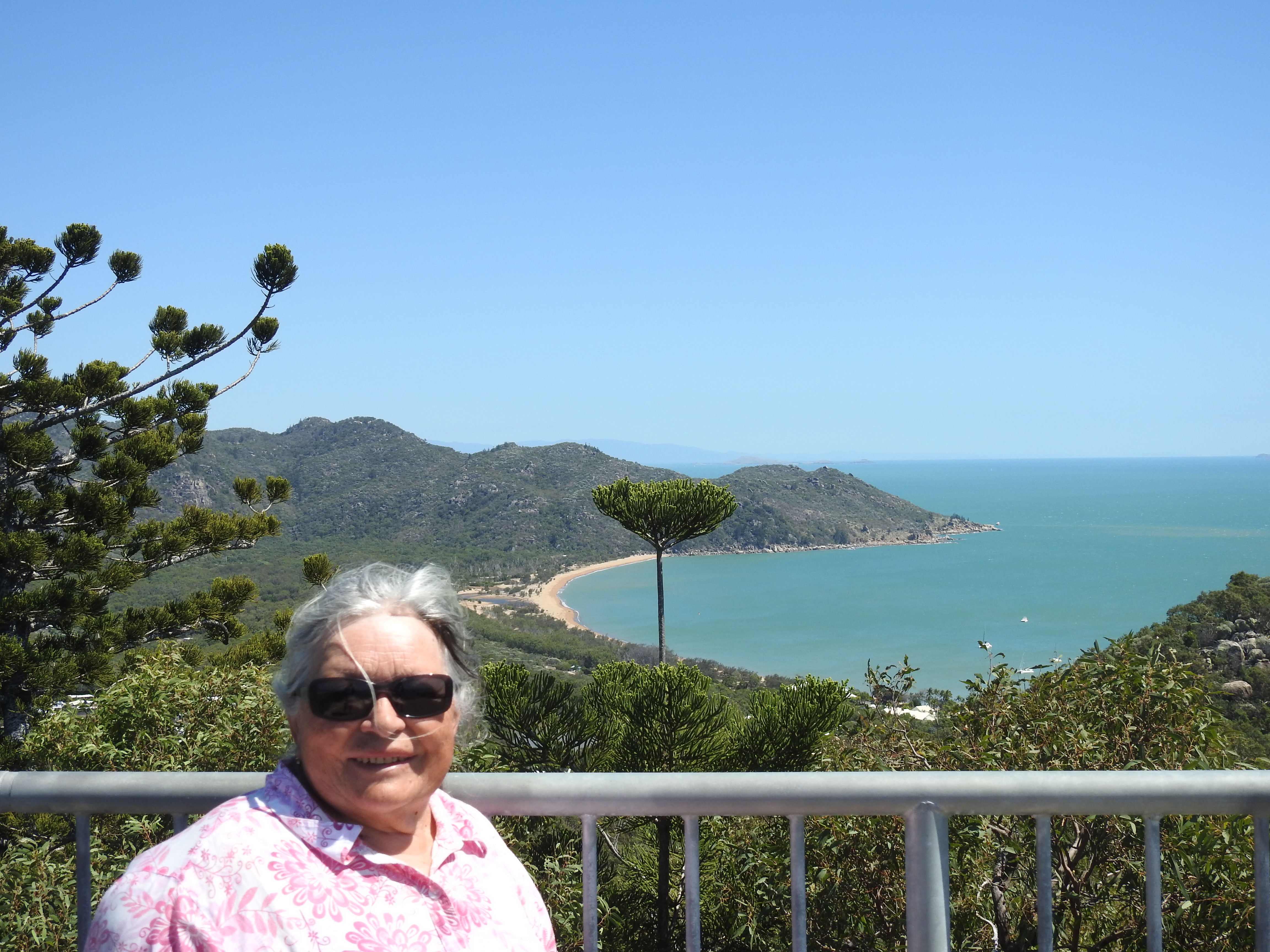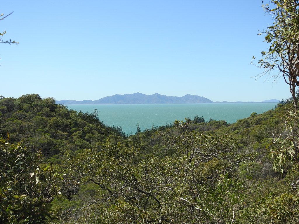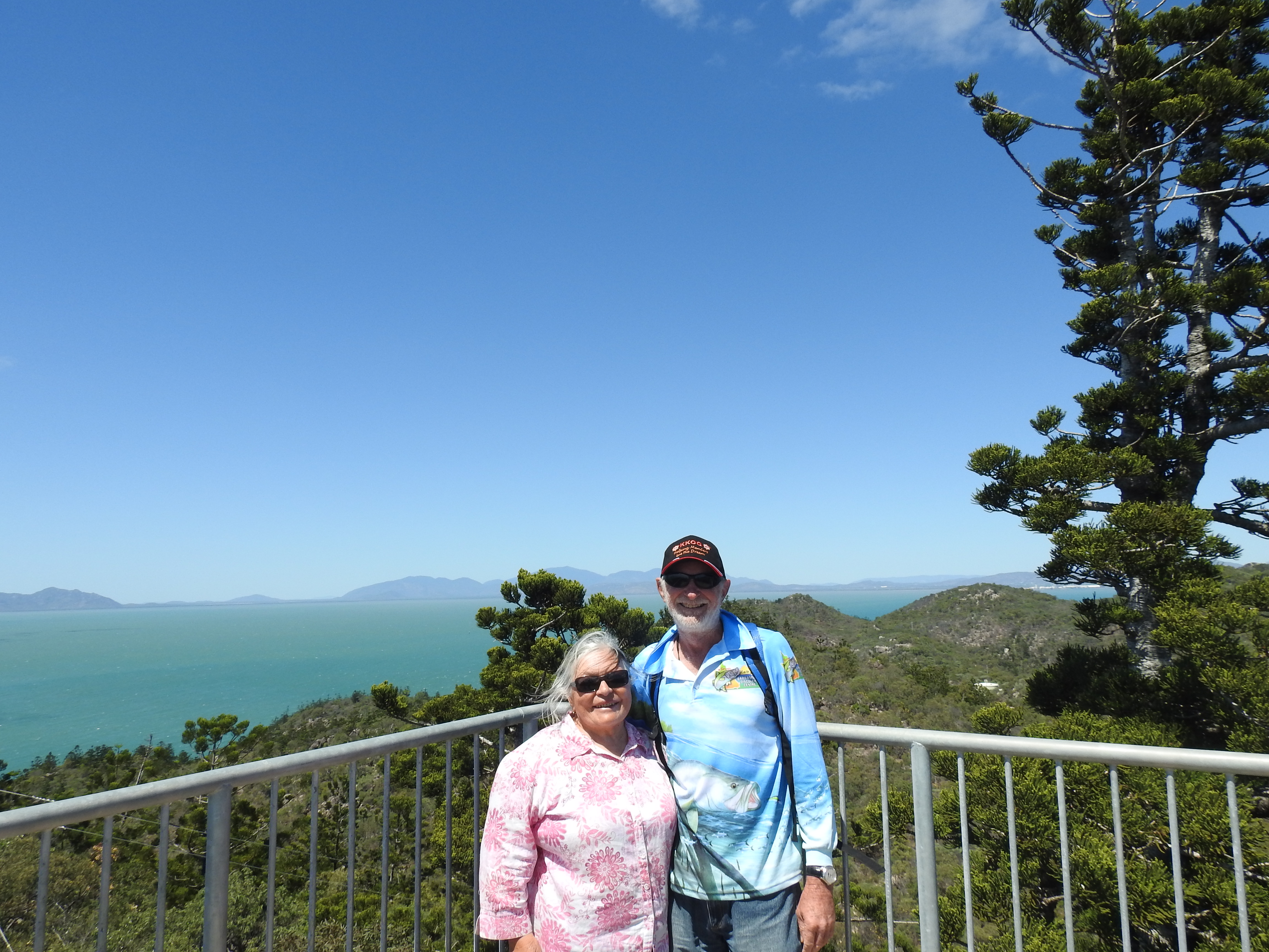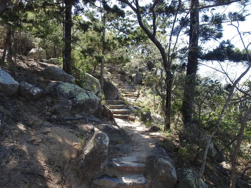 The two gun emplacements have great views over the sea with the range-finder site even better views over this beautiful island. Now the going gets steep & we walk up many rough stone steps to the base of the concrete command post. Now a steep ladder to get to the top of the command post and more sensational views over this beautiful island. It is very windy and we get buffeted. A sailing boat heading to Townsville is making heavy going of it against the big seas. Tereza has done very well walking all this way & climbing the ladders with her dodgy knees.