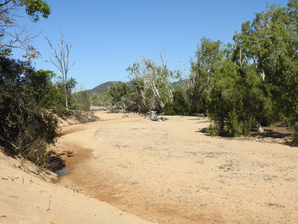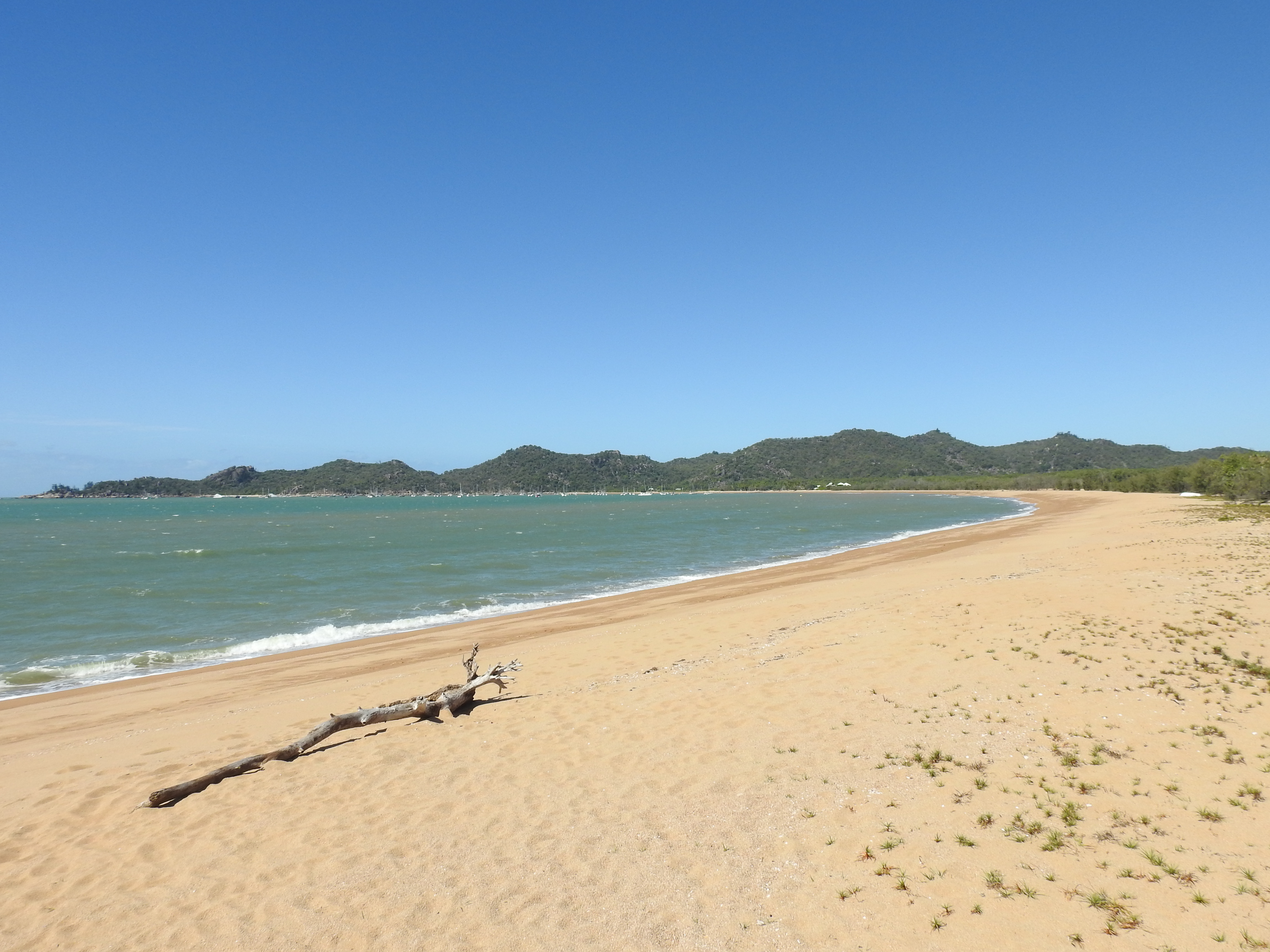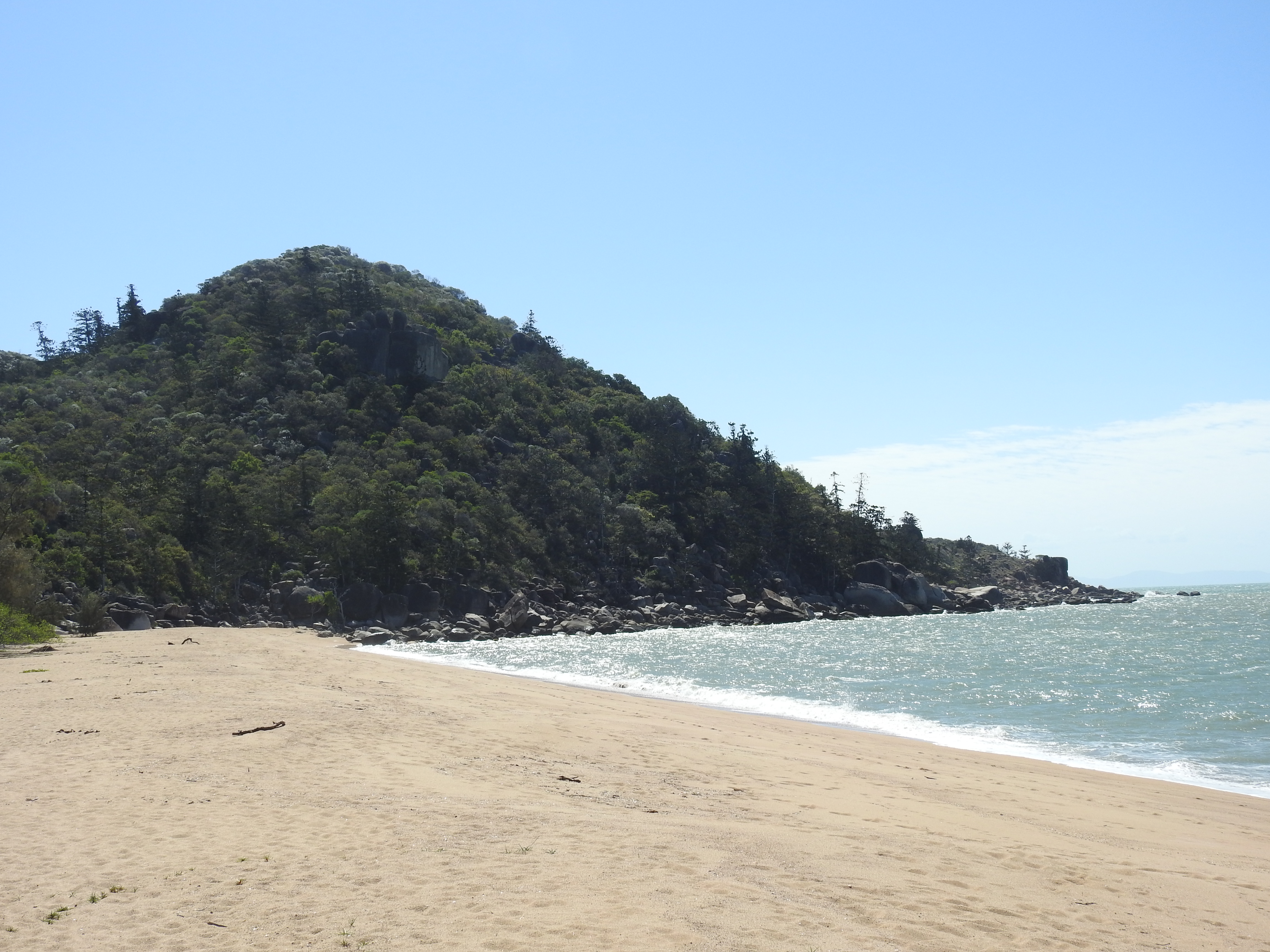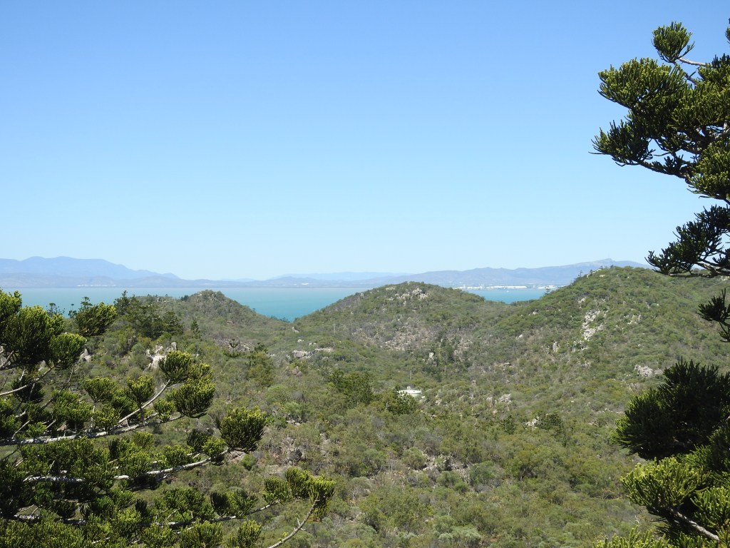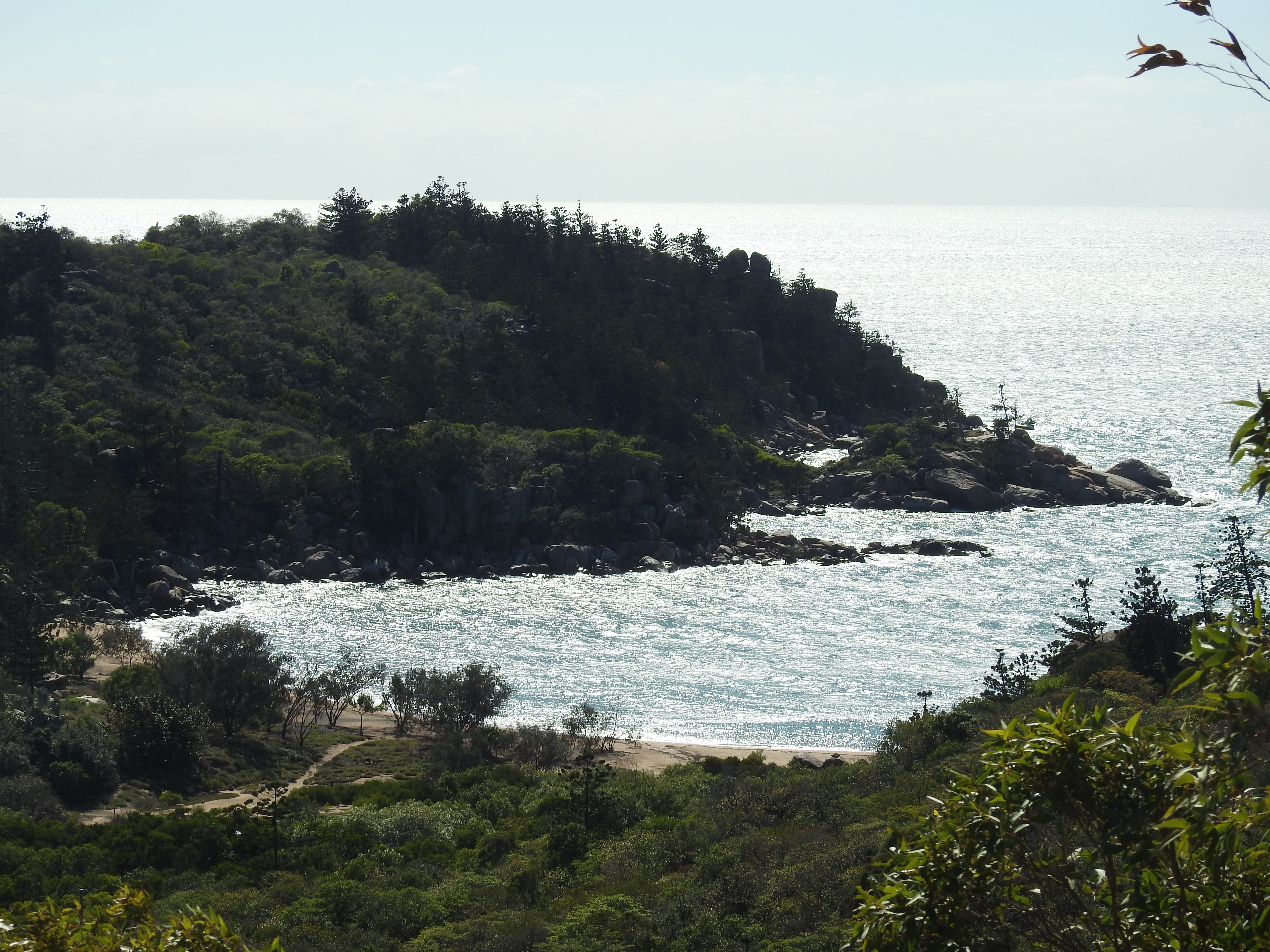 The two gun emplacements have great views over the sea with the range-finder site even better views over this beautiful island. Now the going gets steep & we walk up many rough stone steps to the base of the concrete command post. Now a steep ladder to get to the top of the command post and more sensational views over this beautiful island. It is very windy and we get buffeted. A sailing boat heading to Townsville is making heavy going of it against the big seas. Tereza has done very well walking all this way & climbing the ladders with her dodgy knees.