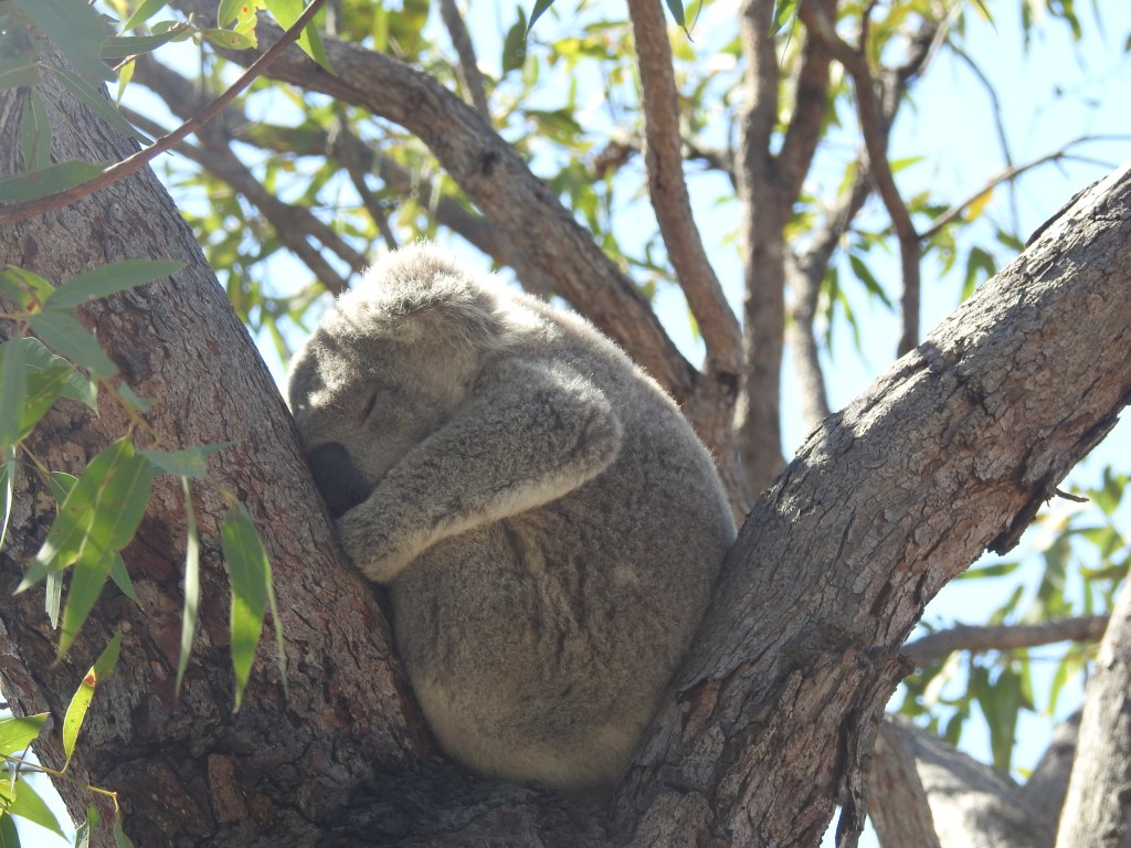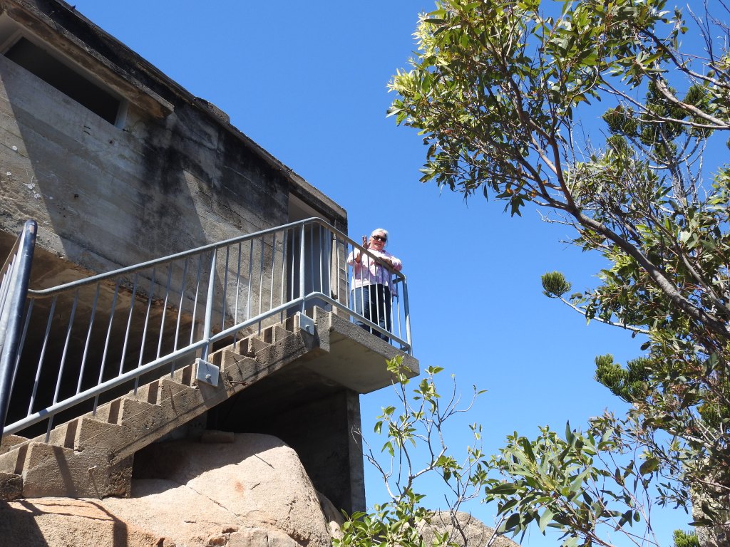 Next is the Communications Post on a knoll about 100 metres away, more ladders & even more amazing views. Even more wind on the open top platform. Tereza gets a phone call from her surgeon here with some very good news regarding the tests Tereza had before we left home. It is such a relief. We decided to have morning tea at this place & enjoy the beautiful view. The 2km walk back down is a lot easier & we stop to see the koalas again, they are still asleep in the same place.