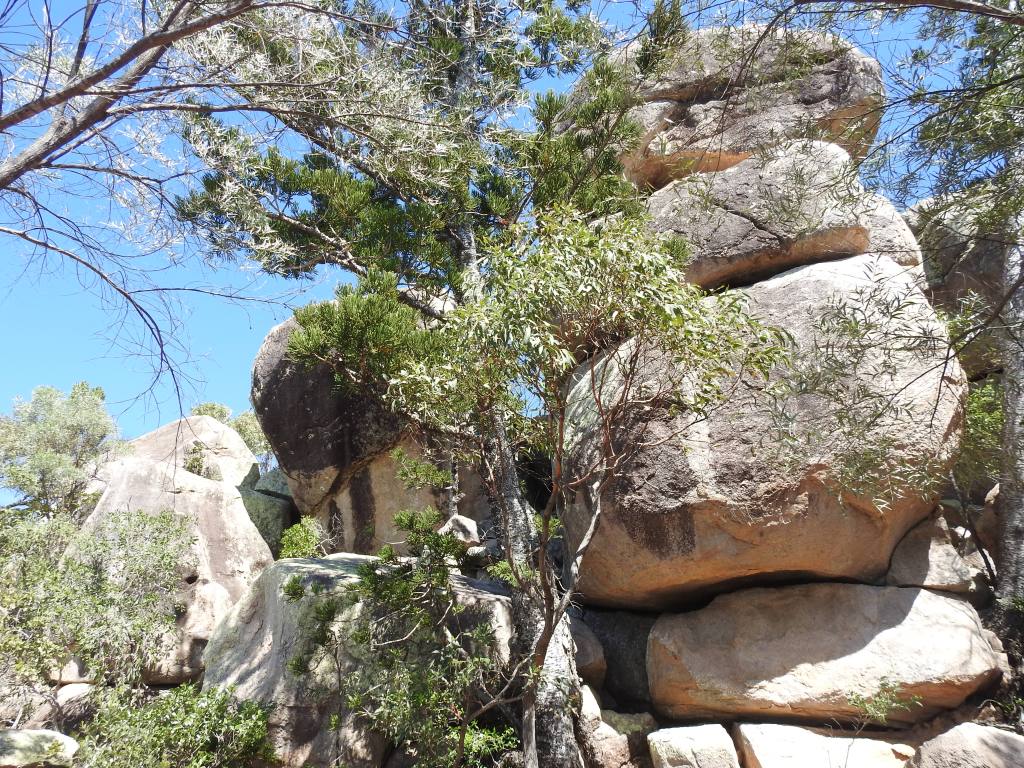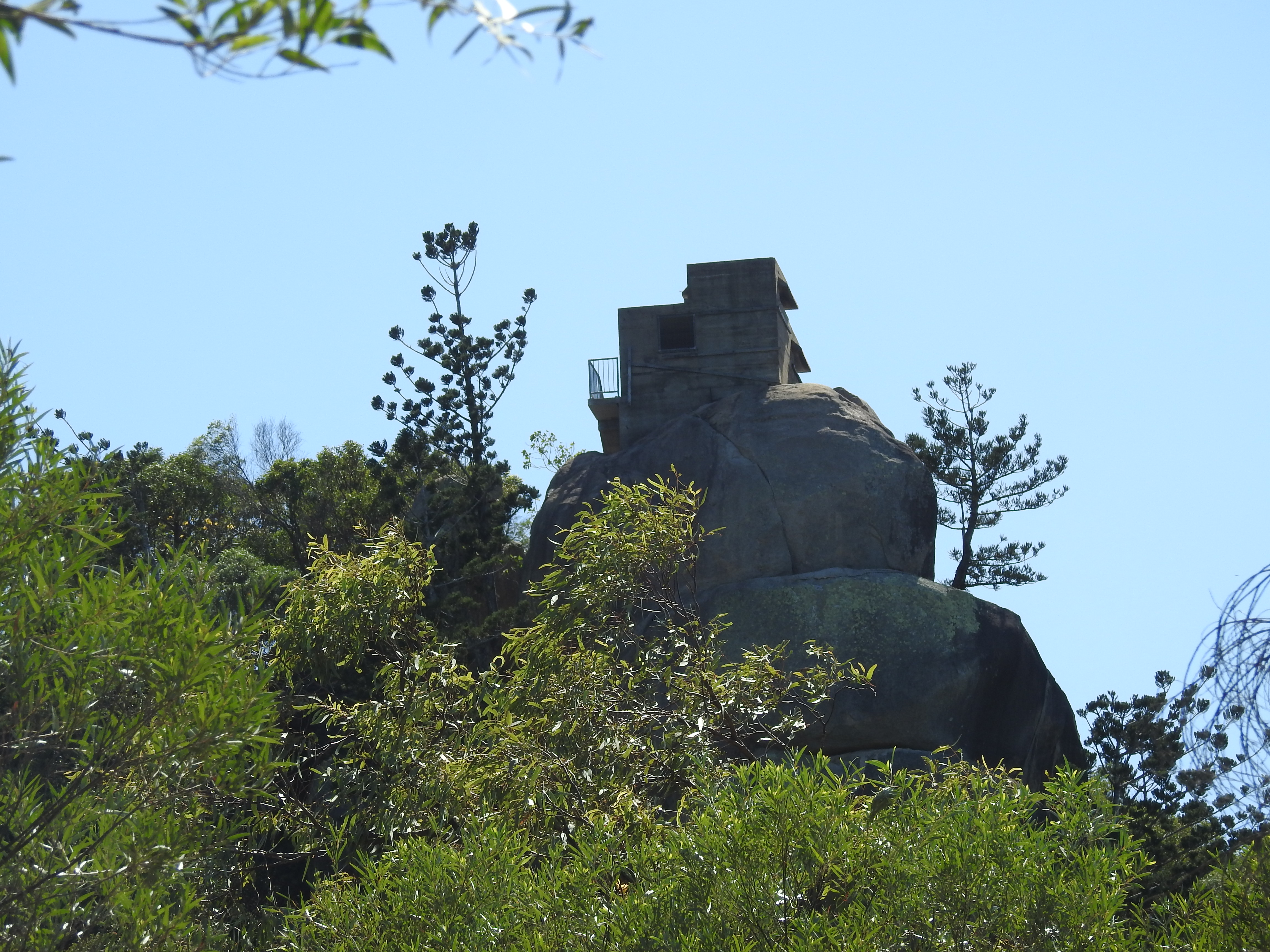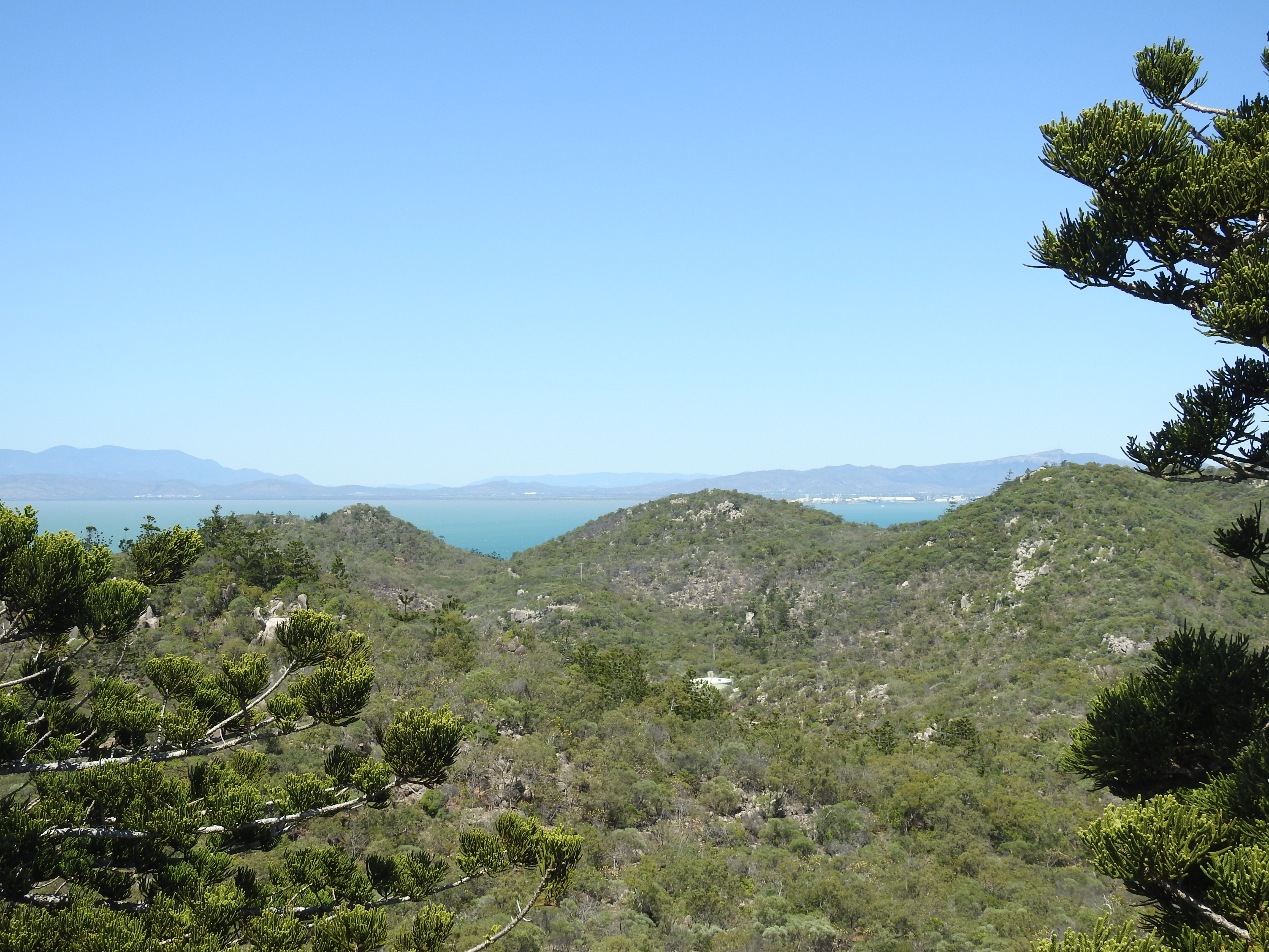 This morning we decide to walk to the forts built during World War 2 on the mountains overlooking the approaches to Townsville Harbour. This is a 2km walk mostly uphill over some roads then lots of steps. The scenery is amazing with massive granite boulders of all shapes & sizes jumbled together with fig trees clinging to them. The trees are a mix of yellow flowering kapok, gums, hoop pines & figs clinging on to life amongst the jumble of rocks. We come across two small koalas nestled asleep in some trees, undisturbed by our camera clicking. We continuing upwards.