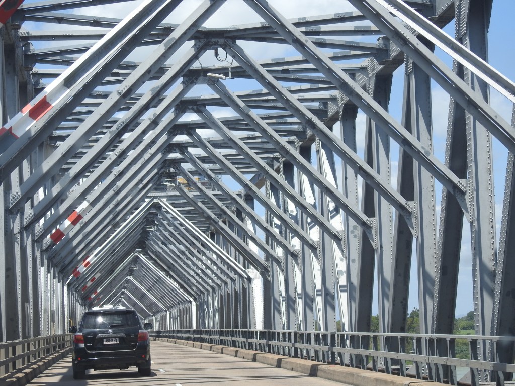 The road south is reasonably flat & we pass some poor countryside with sparse scattering of trees. Big mountains in the distance look great. As we approach Ayr the flat land is full of cane farms. The bridge over the Burdekin River just south of Ayr is a marvel of engineering. It looks very well structured & symmetrical it is an interesting structure spanning across this vast riverbed that is mainly sand. There is lots more cane farms nearly all the way to Bowen, with scattered mango plantations, but becoming more plentiful as we get closer to Bowen. There are also a lot of tomatoes growing in different stages – some ripe, some green & others just in flower.