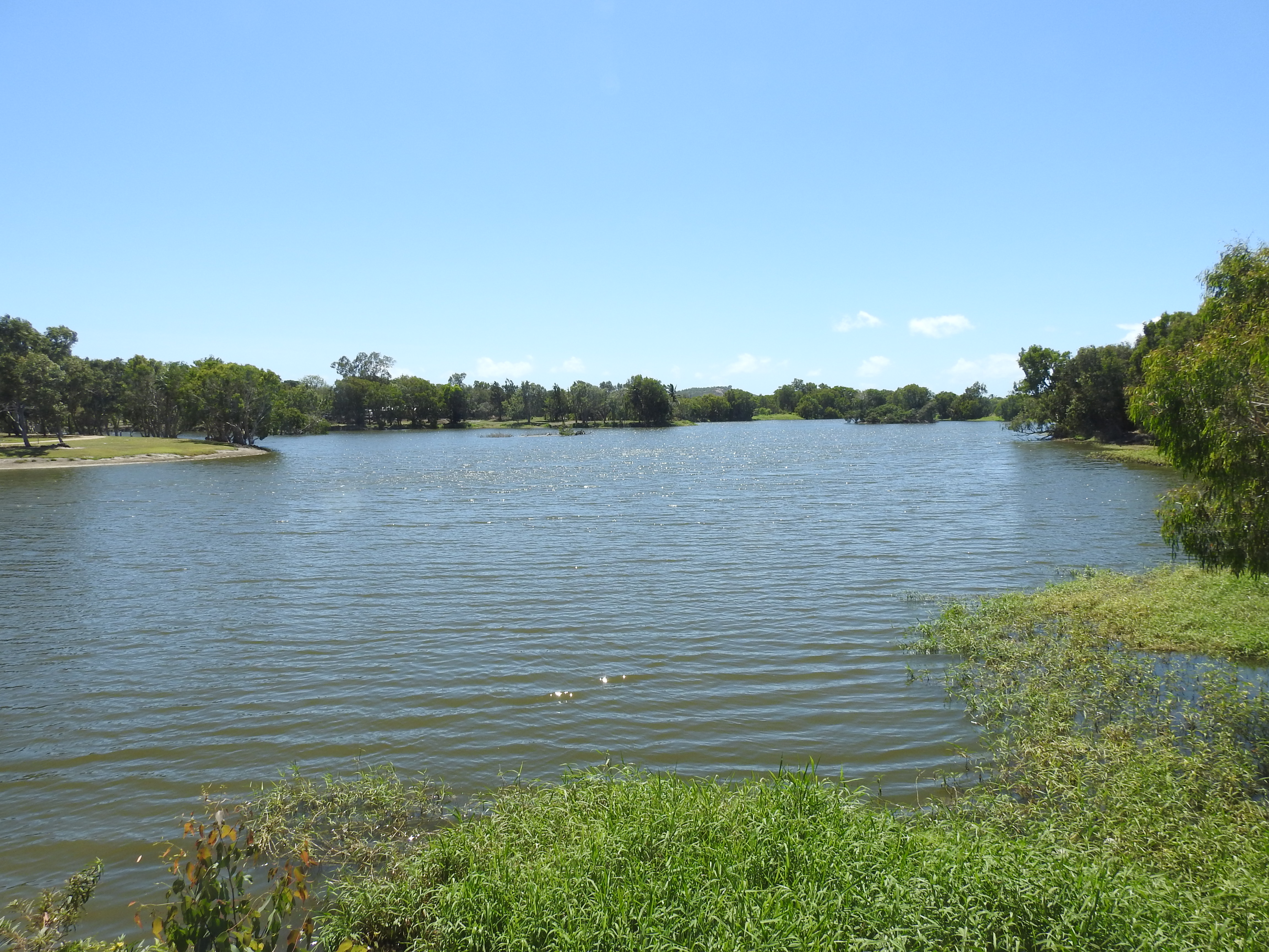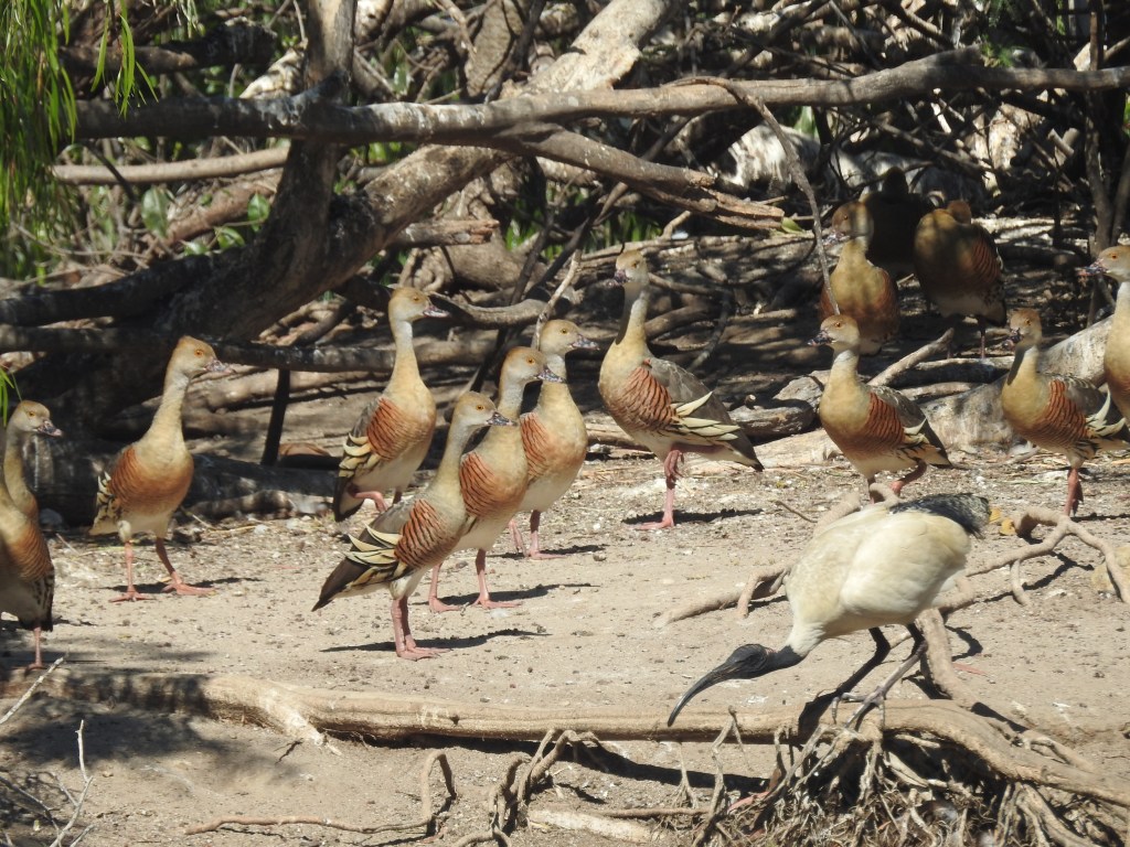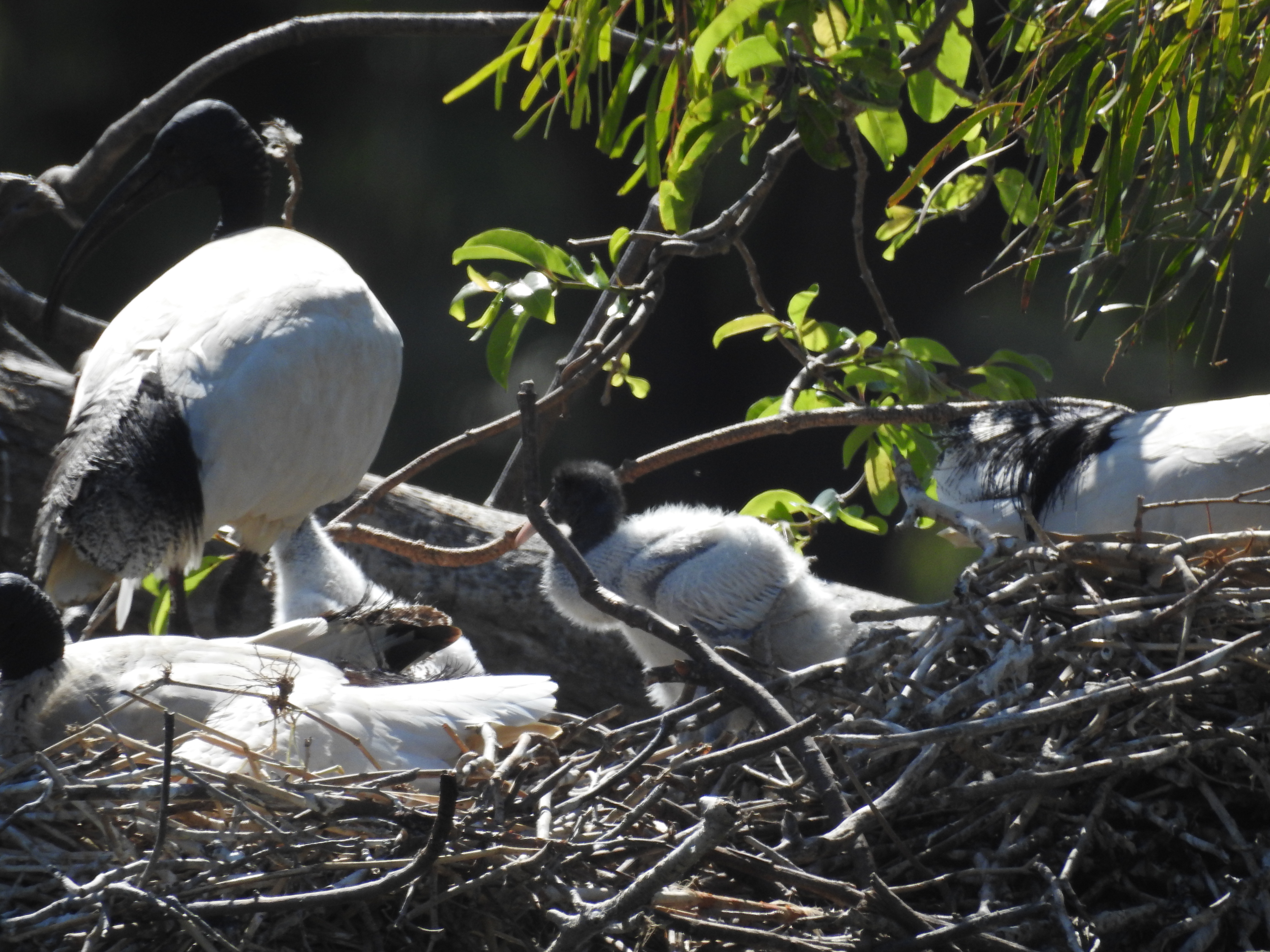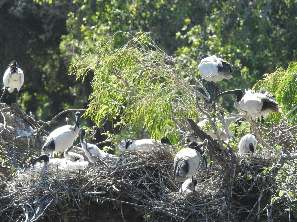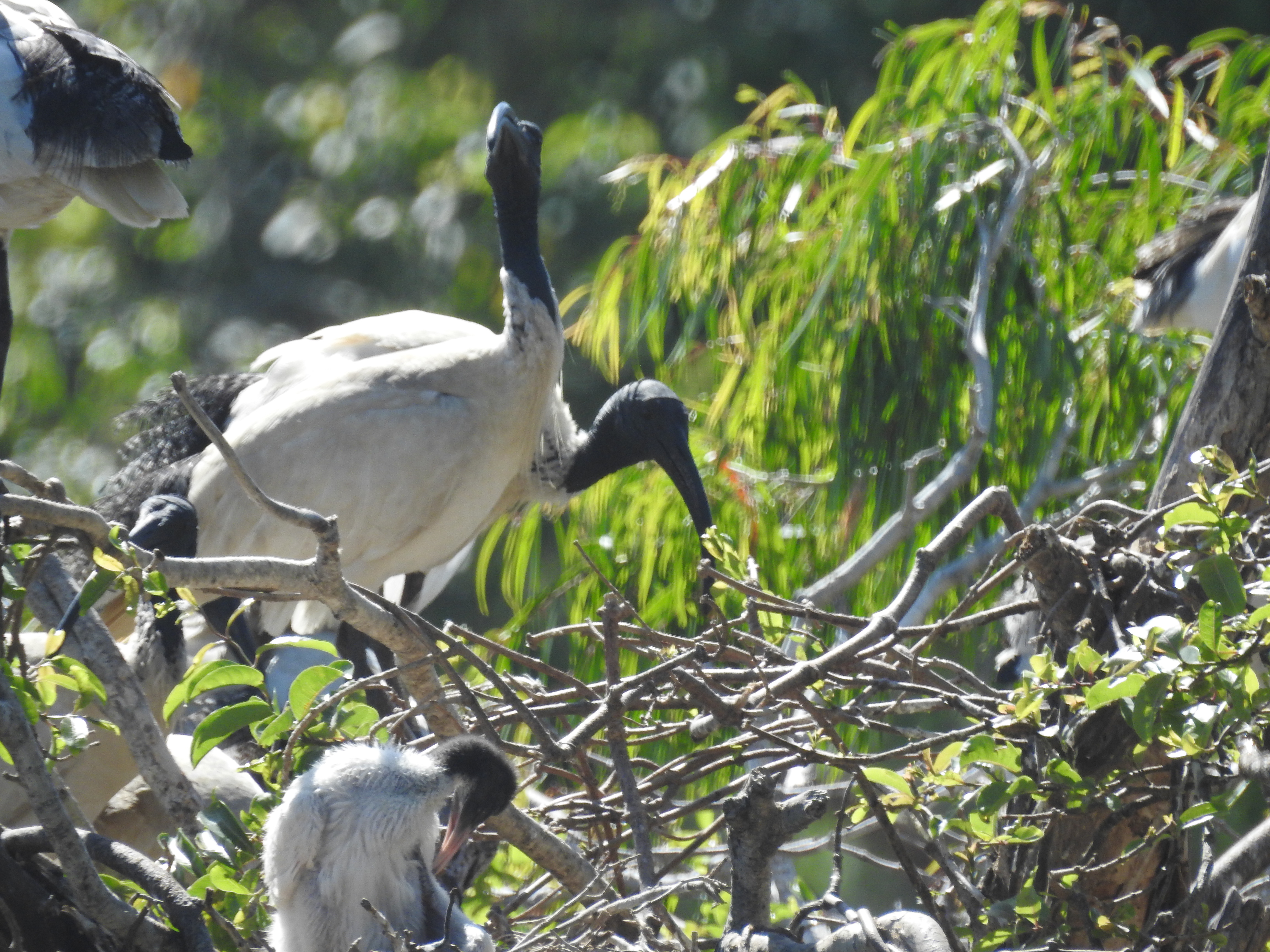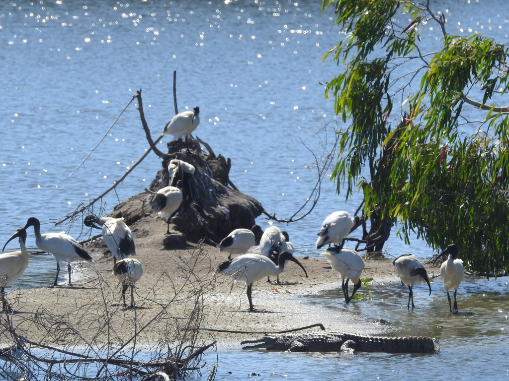 This morning we visit Mullers Lagoon, right in the middle of Bowen. We drive all the way around the lagoon looking for a parking area, but don’t find any. We finally park just down from the shopping centre. This lagoon is a very large man-made lagoon with nice pathways plus seats, bridges & BBQ areas. There are a number of small islands in the lagoon that are the breeding sites for some ibis & also whistling ducks. The trees on the islands are full of ibis and the nests in the trees have small ibis chicks in them clamouring to be fed. During our photo taking we neglected to see one very important thing, it is only once we downloaded the photos onto the computer we saw a crocodile basking in the sun next to some ibis. We did walk close to the edge of the lagoon a few times.