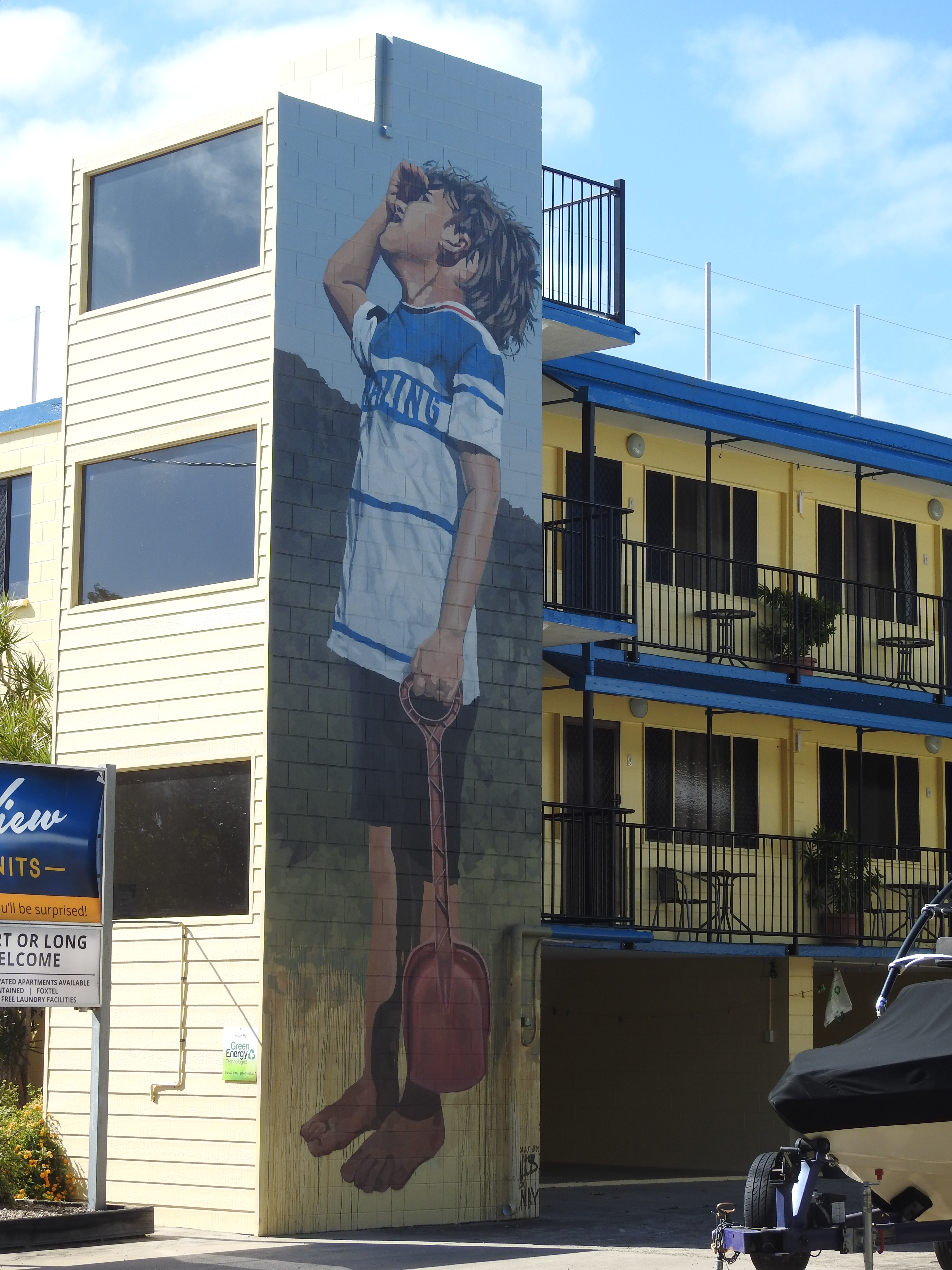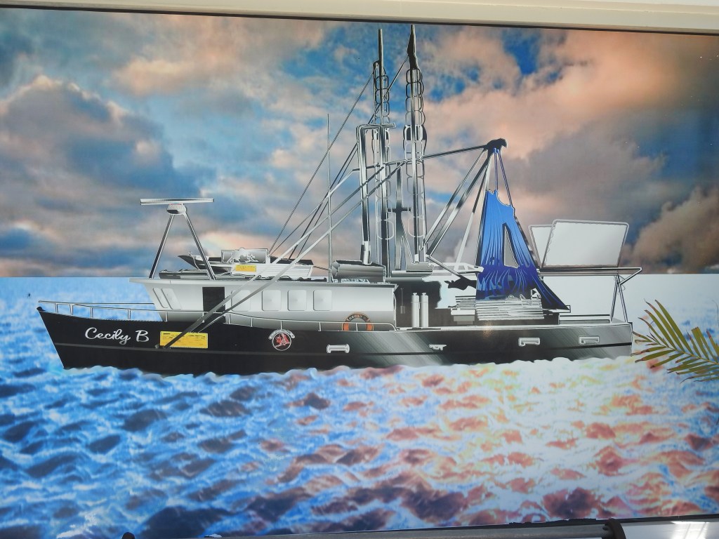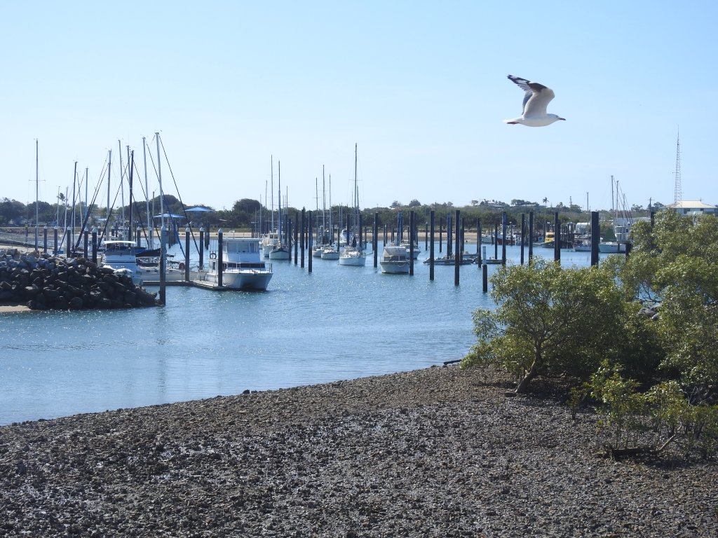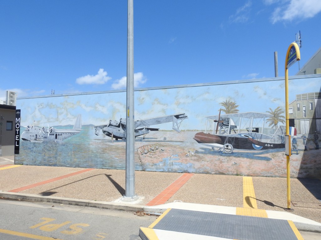 We then walk around the streets of Bowen and admire the painted murals on the walls, do a bit of window shopping & admire some of the old restored buildings. There is not much shopping activity going on in Bowen. Only one men’s, one women’s & one shoe shop, there was anything to tempt us. Hotels & alcohol stores are plentiful. Off to the Fisherman’s Co-Op for lunch again, on the shaded back deck again overlooking the fishing fleet. While we were in eating, outside an excavator dragged a sunken sailing boat out of the adjoining small boat harbour, it was full of water & had to be pumped out before retrieval.