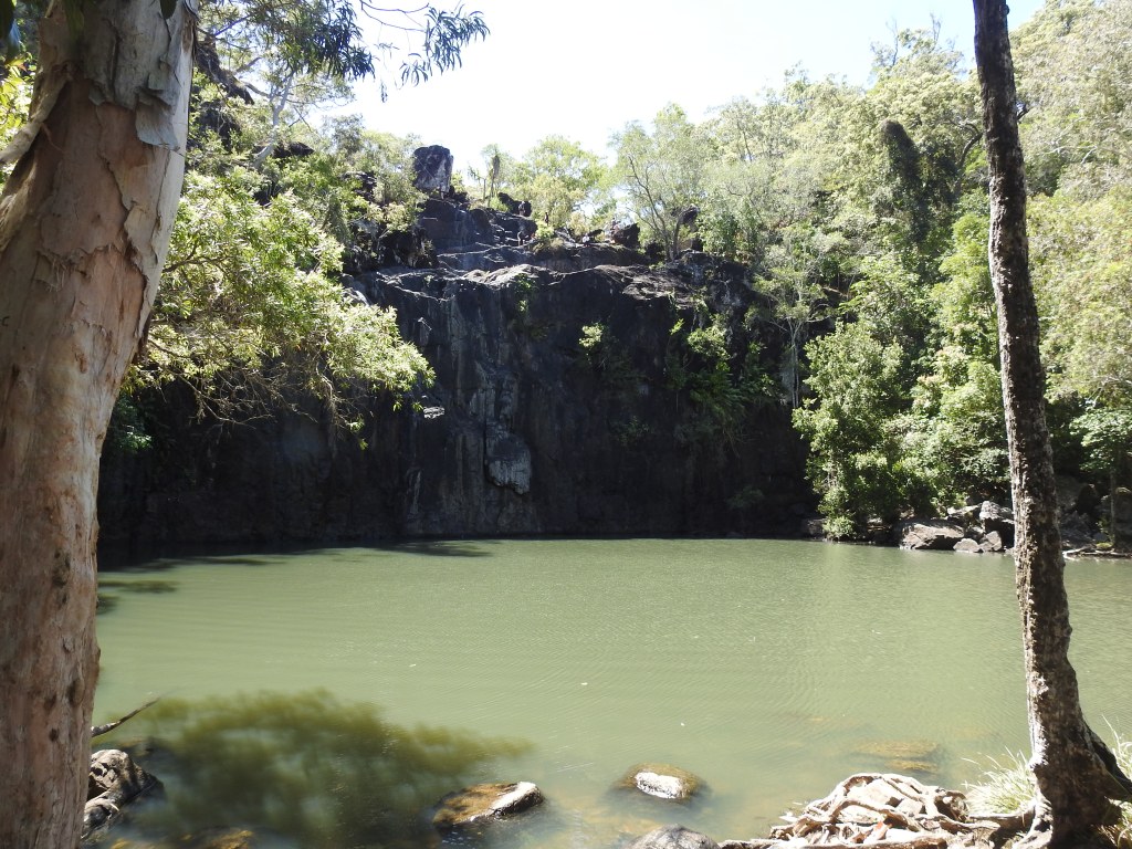 The drive to Cedar Creek Falls takes only around 20 minutes through cane farms then cattle farms then bush. The car park is full & overflowing back down the road, we are lucky that someone is just leaving. The falls are not that far from the carpark & they are not falling, it is the dry season, so no rain. The large pool at the base of the falls looks a little stagnant & no-one is in swimming. A few people are at the top of the falls, one person is throwing large rocks over the edge to hear the splash. There are warning signs about not jumping from the top all around, there have been deaths & serious injury.