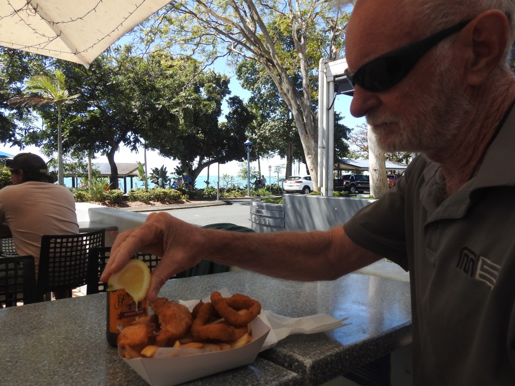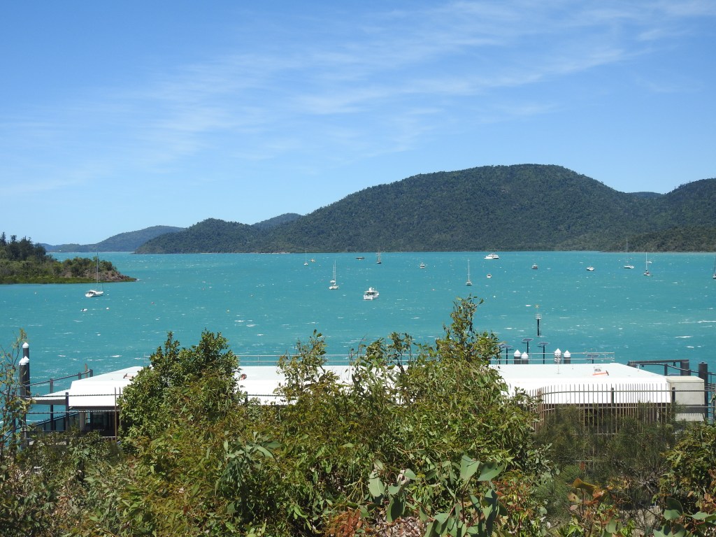Shute Harbour is very windy as well, we notice a yacht that has been blown onto rocks next to the road. We stop at the Lion’s Lookout overlooking the ferry terminal & the wind is whipping down the harbour so we get back into our warm car. Airlie Beach is very busy, it is school holiday time & there are lots of people around. We are fortunate to get a carpark in the main street then we go looking for a seafood place for lunch. There is one not too far away & it is fairly busy, we have around a 20 minute wait for our seafood. The view is pleasant, looking out over the park to the bay that is packed with sailing boats sitting on water that is such an amazing blue colour. There is a nice path along the beachfront & we have a short walk along it, there are lots of people. On the beachfront is a really large public lagoon that is free to use & caters for all ages, it is a great facility to have. There are lots of people sitting around on the grass under the swaying palm trees.