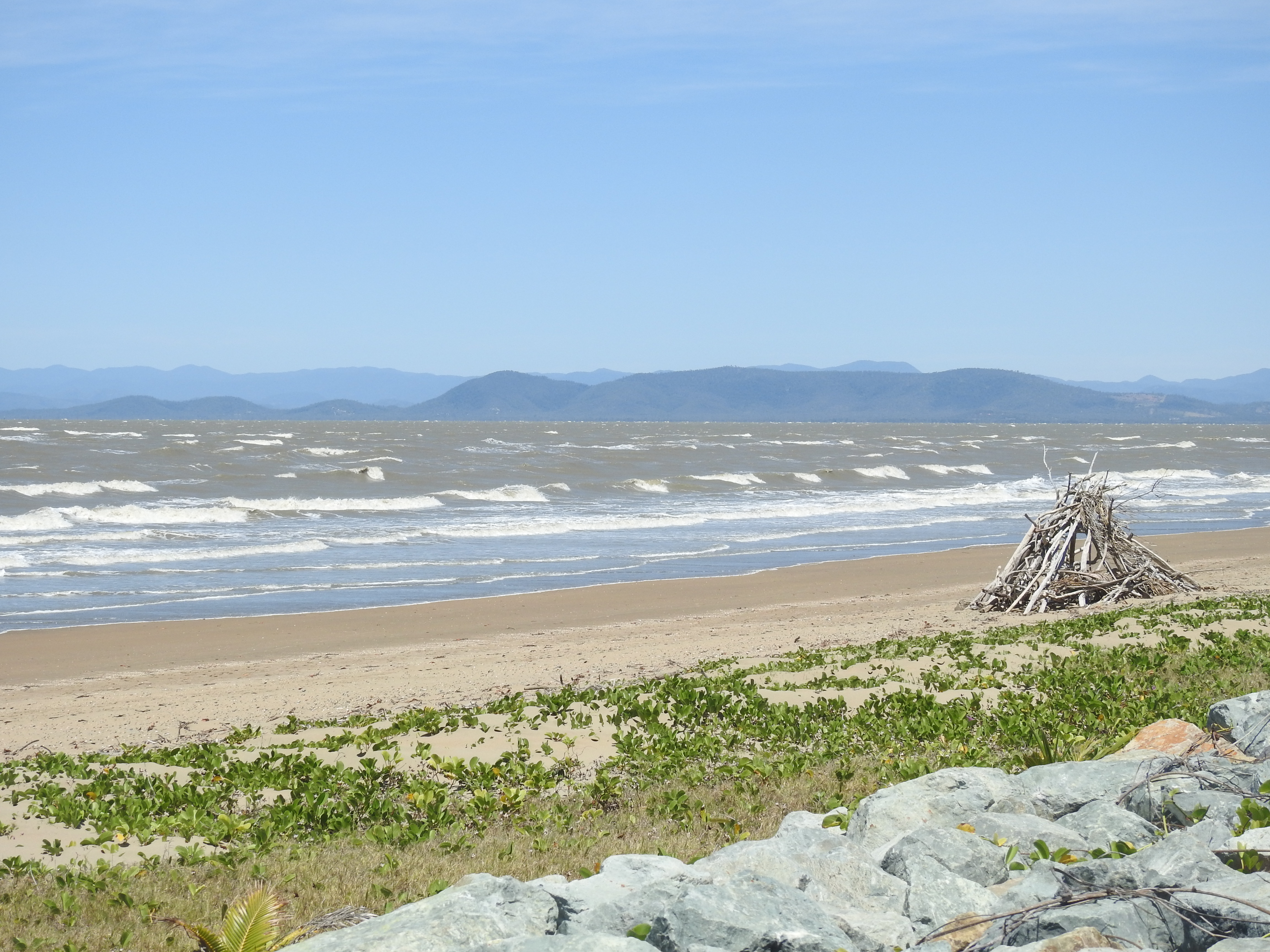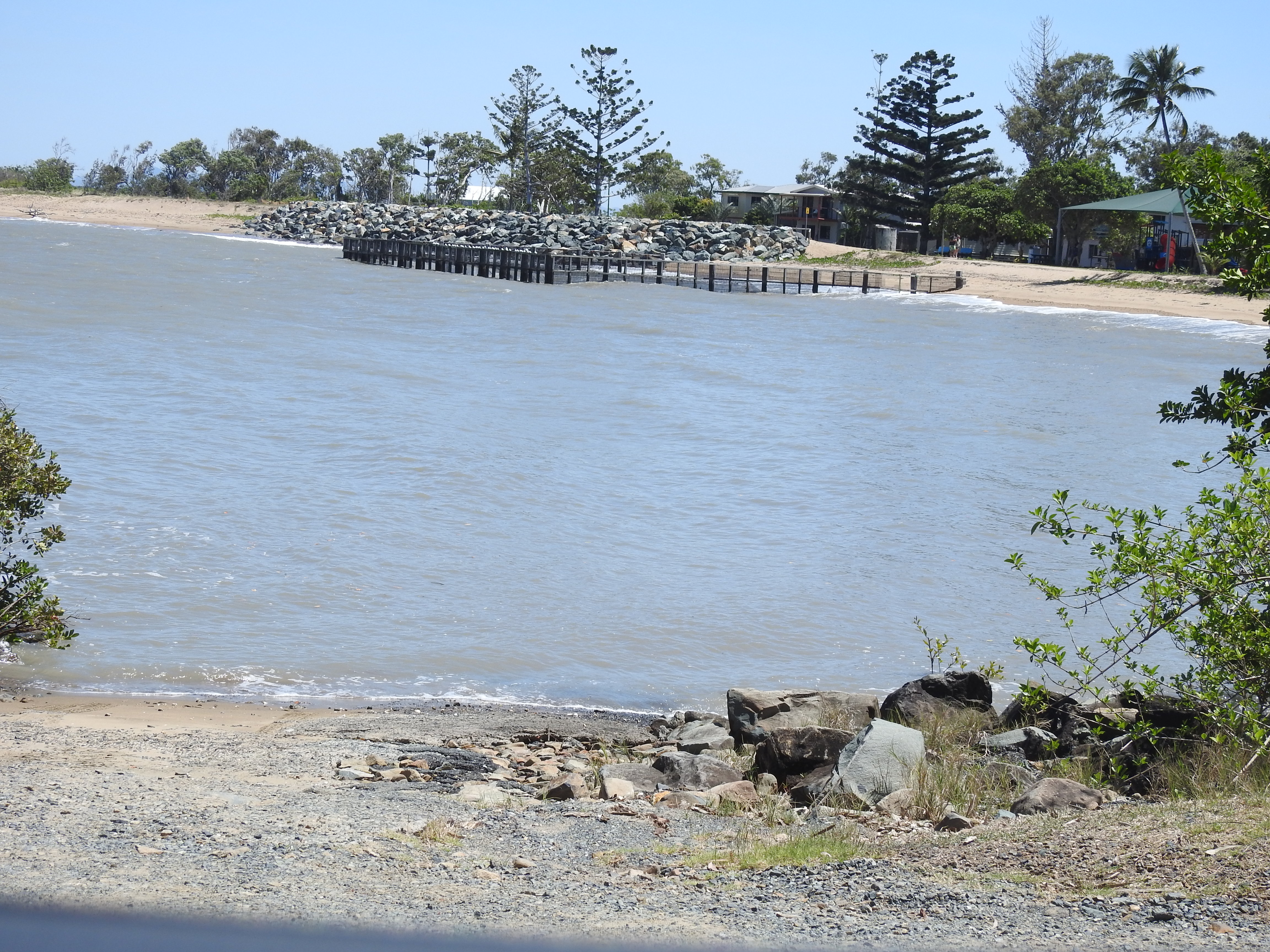 Shute Harbour is very windy as well, we notice a yacht that has been blown onto rocks next to the road. We stop at the Lion’s Lookout overlooking the ferry terminal & the wind is whipping down the harbour so we get back into our warm car. Airlie Beach is very busy, it is school holiday time & there are lots of people around. We are fortunate to get a carpark in the main street then we go looking for a seafood place for lunch. There is one not too far away & it is fairly busy, we have around a 20 minute wait for our seafood. The view is pleasant, looking out over the park to the bay that is packed with sailing boats sitting on water that is such an amazing blue colour. There is a nice path along the beachfront & we have a short walk along it, there are lots of people. On the beachfront is a really large public lagoon that is free to use & caters for all ages, it is a great facility to have. There are lots of people sitting around on the grass under the swaying palm trees.