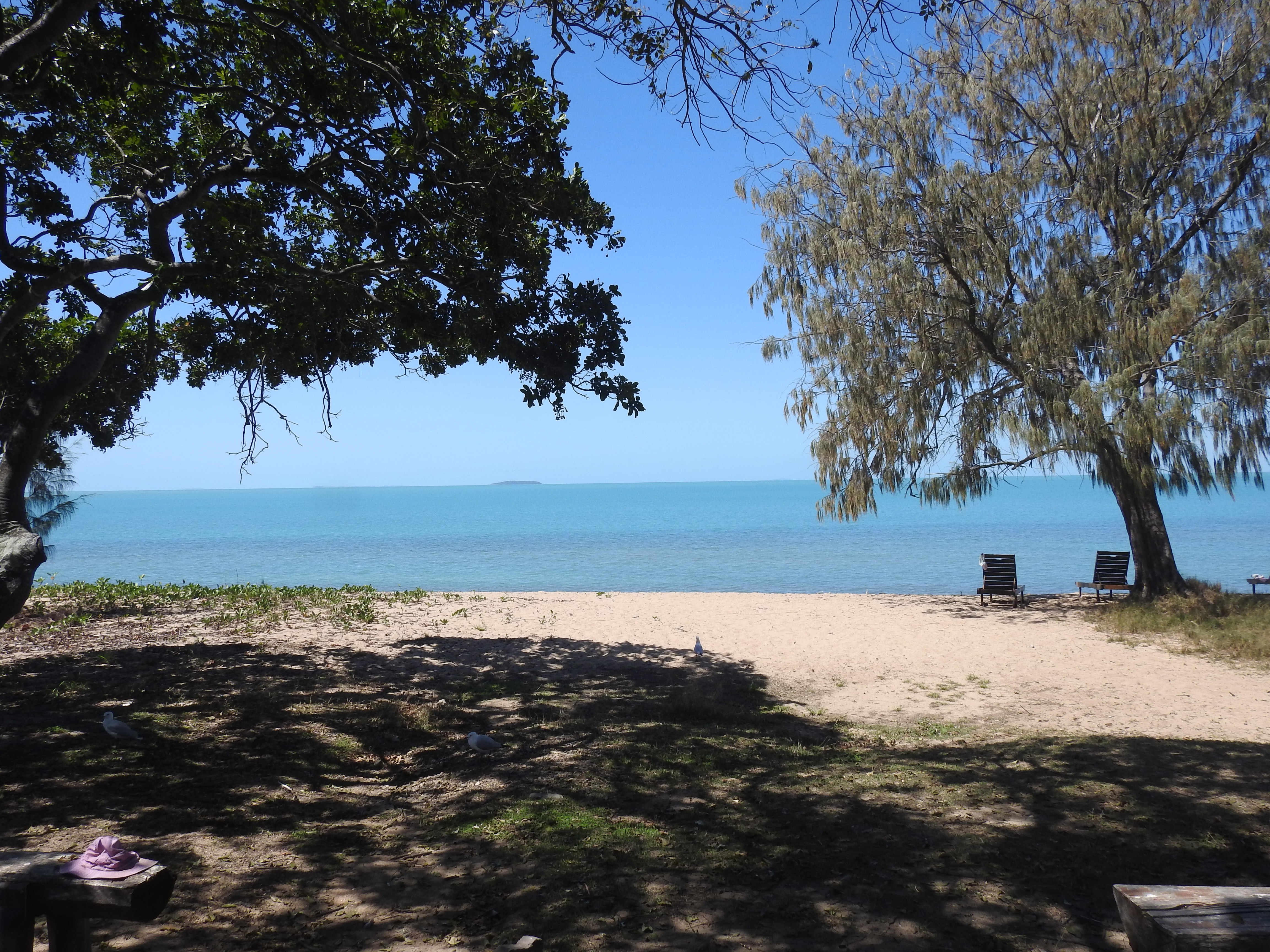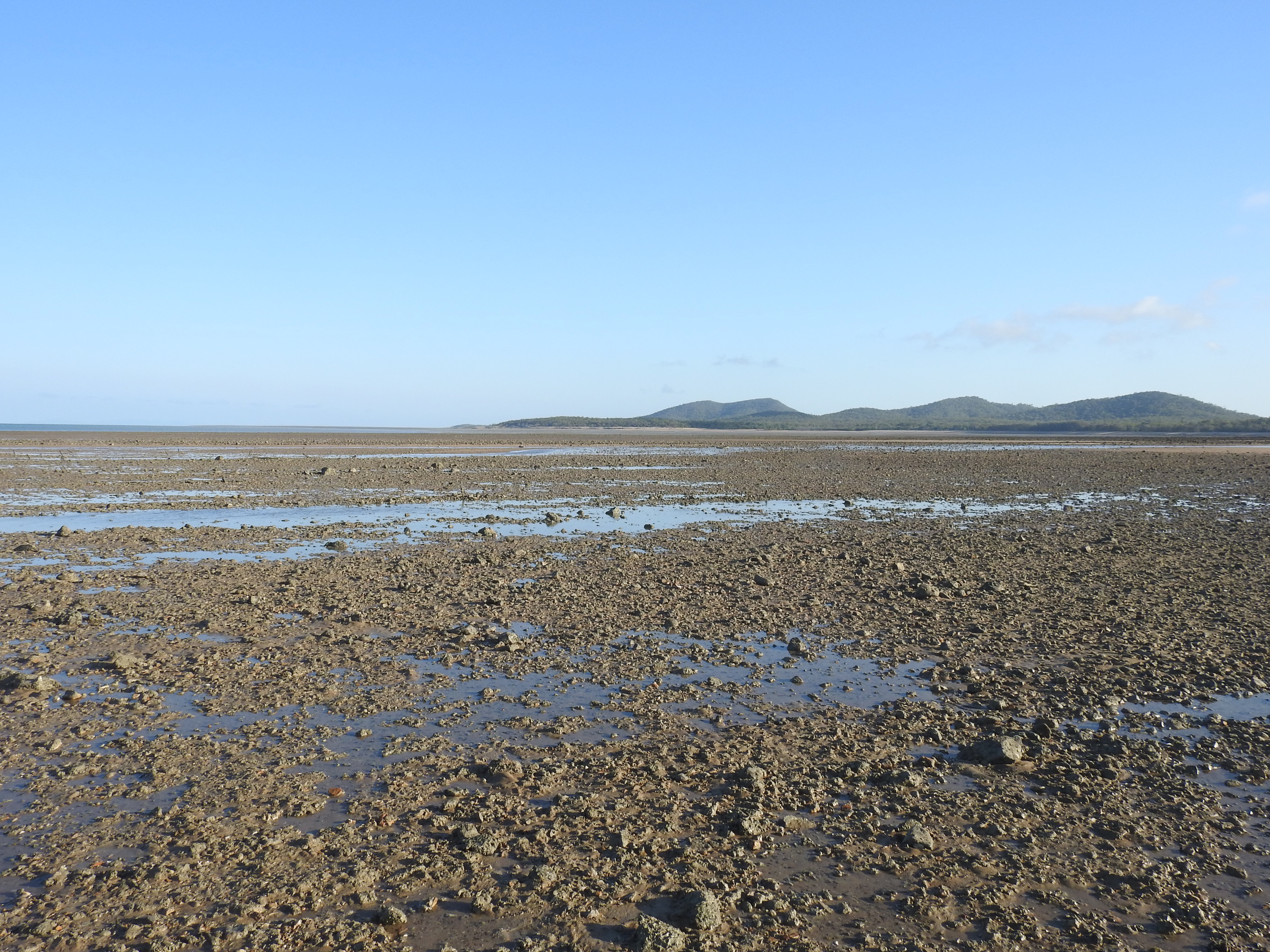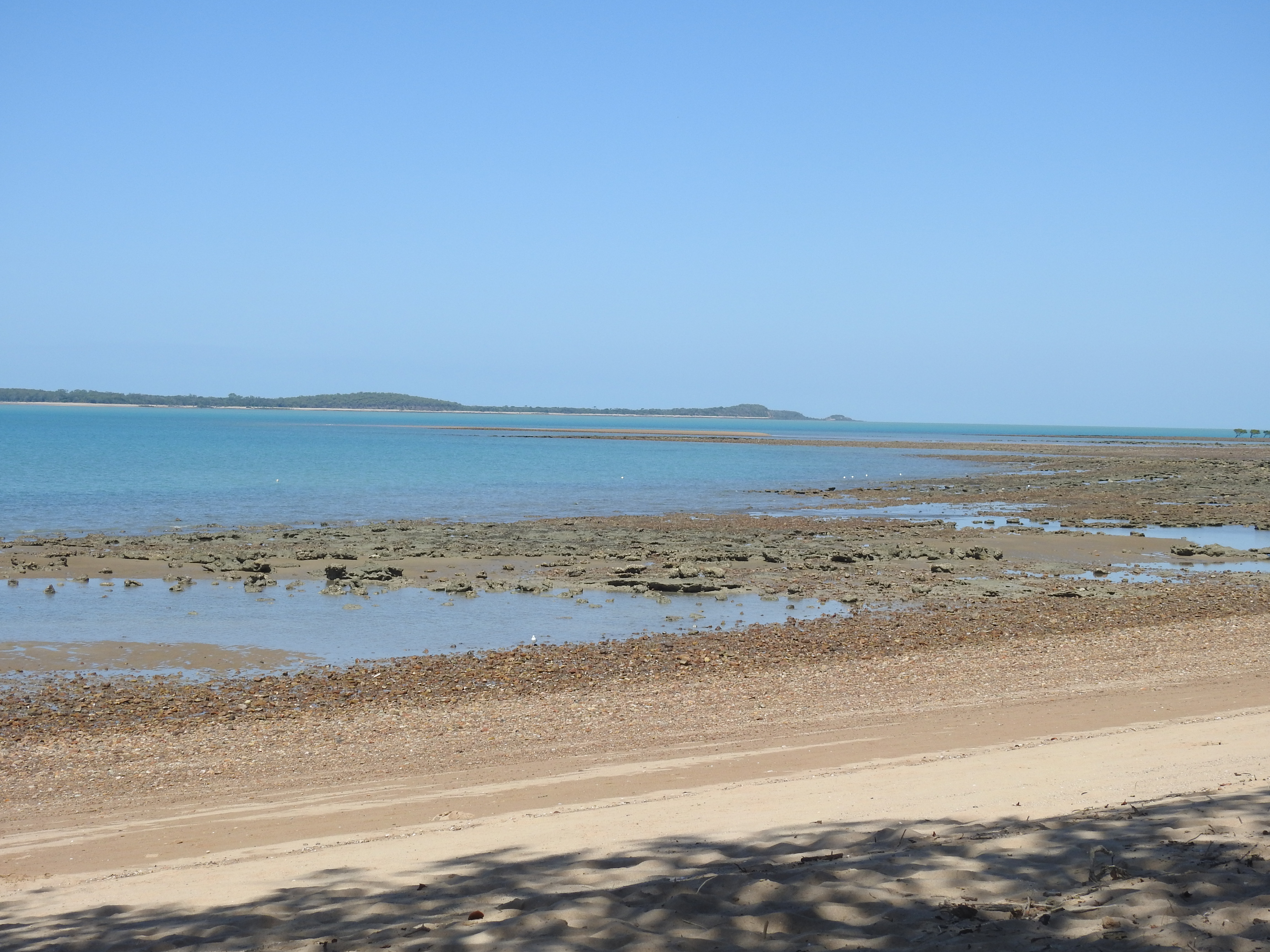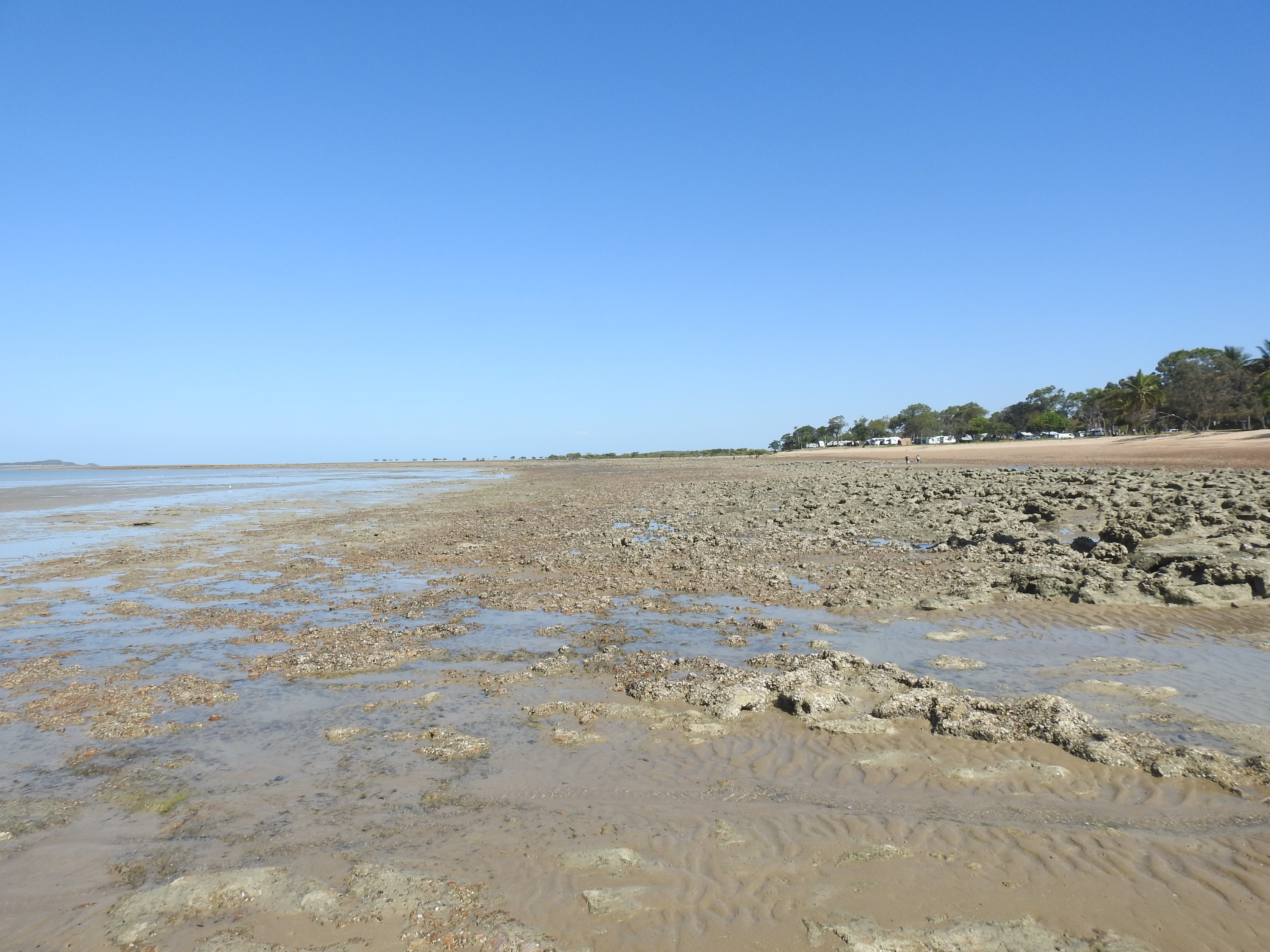 Clairview is squeezed between the highway, railway line & the sea in a narrow strip of beachfront. Our site is beachfront & we reverse in & set up before heading over to the onsite bistro for lunch. We find a table & chairs in the shade out the front with views of the ocean only interrupted by the swaying coconut palm trees. We order a seafood basket, a Corona & Ginger beer. We are surprised to see dugongs grazing on the sea grass out the front, but they are so very quick in popping up for a quick breath & down they dive again to eat. We stay watching the dugongs then watch as the water rapidly recedes as the tide departs. The tide here has more than a 6 metre range & the edge of the water is around a kilometre out from shore. Ron goes for a walk on the sand but quickly starts getting bogged in the underlying mud so then heads onto the rocks & heads out towards the island. I start getting worried as I see him disappearing into the distance, I am concerned about the tide coming back in. No problems, brains engage & he turns & starts walking back in as the tide turns, it takes a while as it is a long way out.