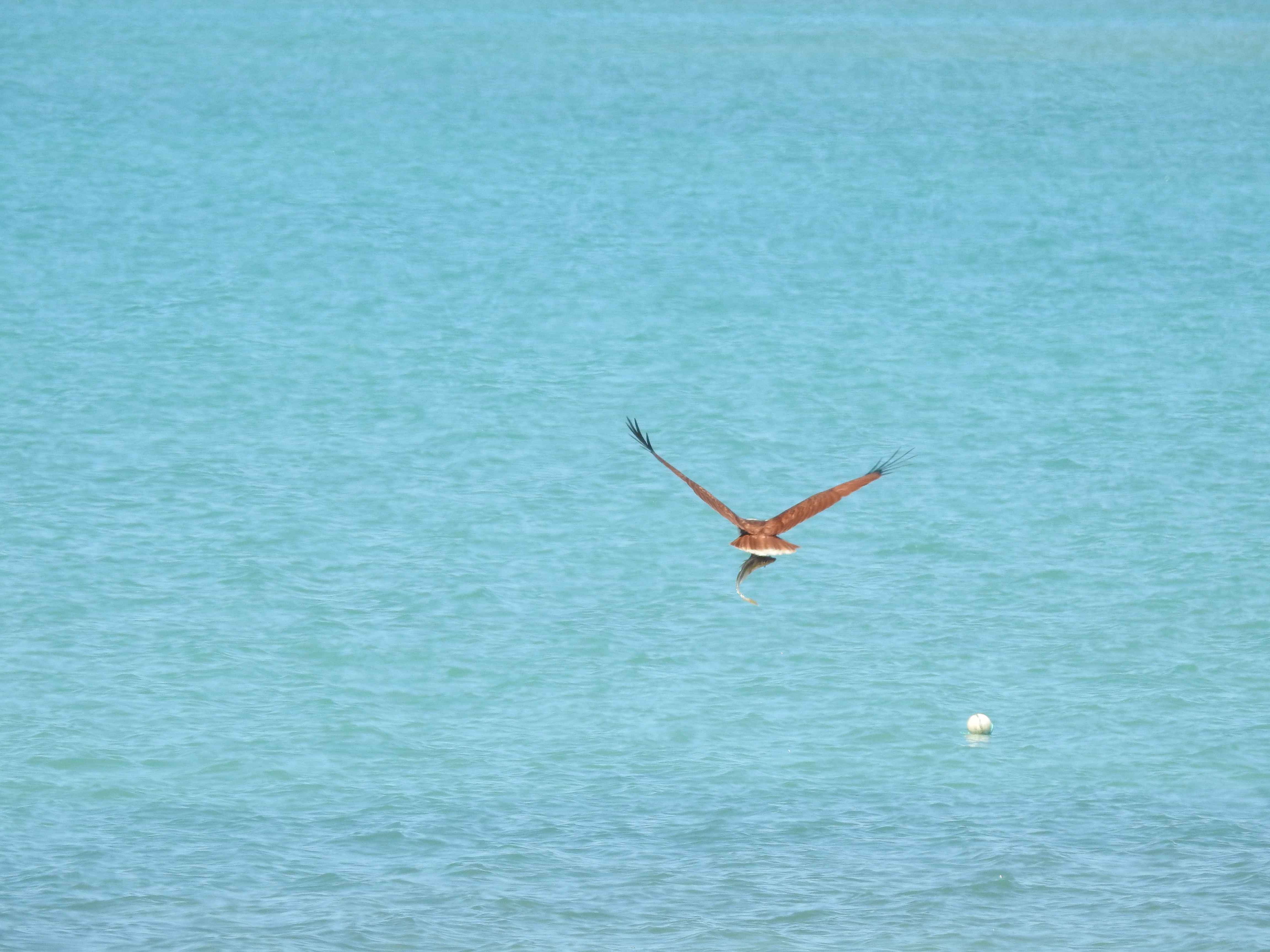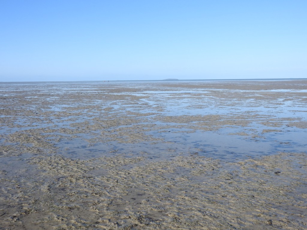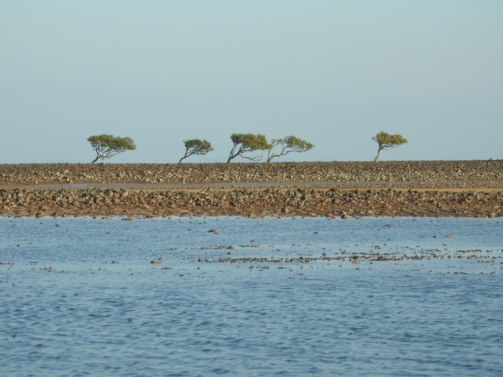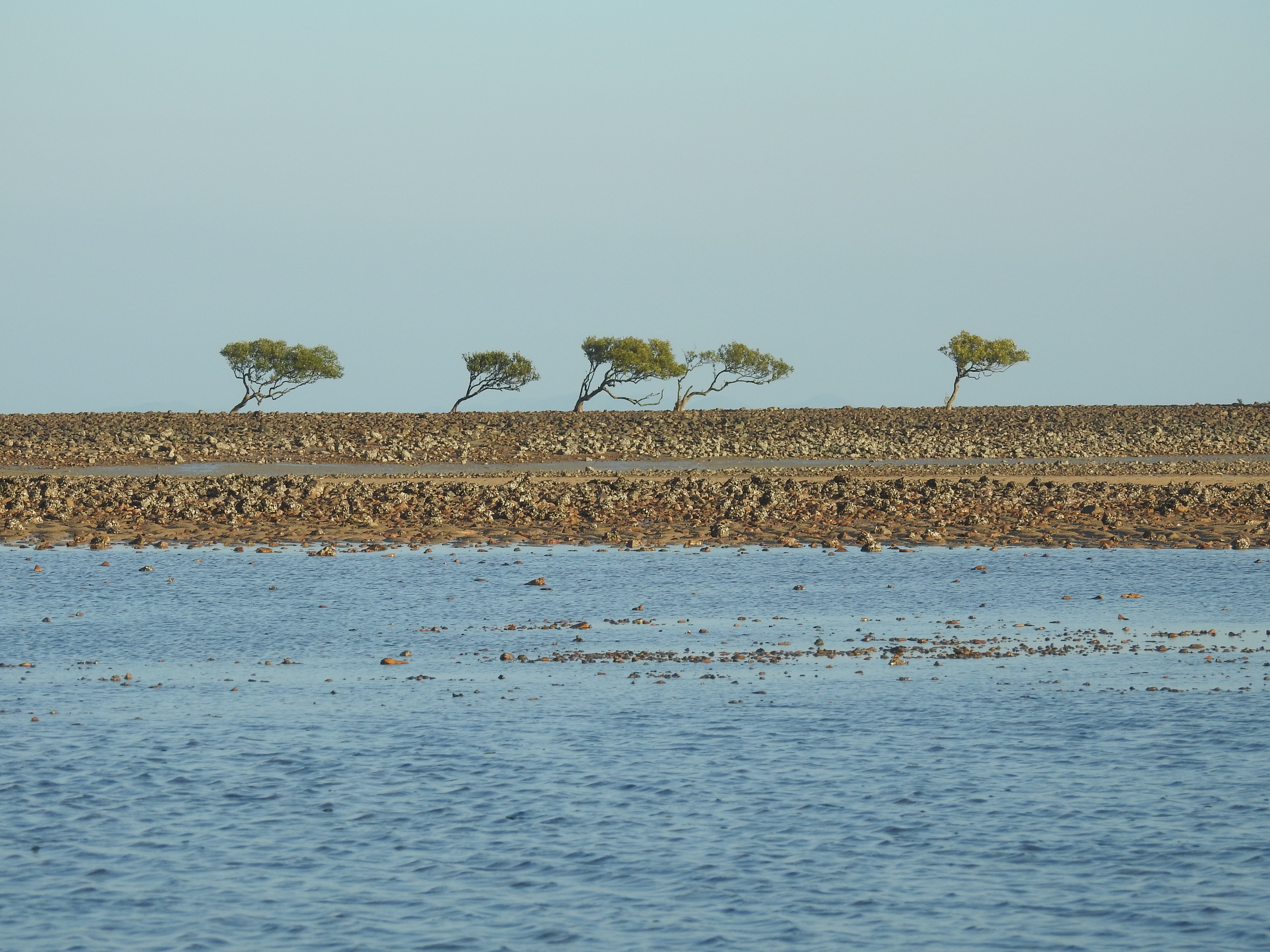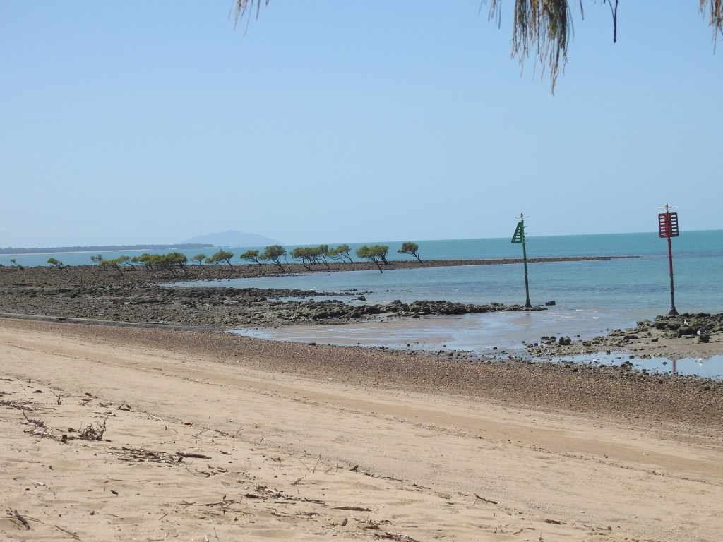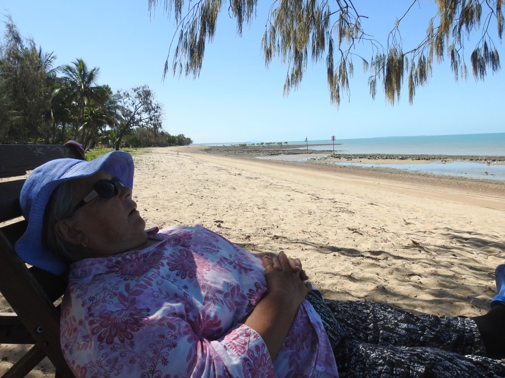 Clairview is squeezed between the highway, railway line & the sea in a narrow strip of beachfront. Our site is beachfront & we reverse in & set up before heading over to the onsite bistro for lunch. We find a table & chairs in the shade out the front with views of the ocean only interrupted by the swaying coconut palm trees. We order a seafood basket, a Corona & Ginger beer. We are surprised to see dugongs grazing on the sea grass out the front, but they are so very quick in popping up for a quick breath & down they dive again to eat. We stay watching the dugongs then watch as the water rapidly recedes as the tide departs. The tide here has more than a 6 metre range & the edge of the water is around a kilometre out from shore. Ron goes for a walk on the sand but quickly starts getting bogged in the underlying mud so then heads onto the rocks & heads out towards the island. I start getting worried as I see him disappearing into the distance, I am concerned about the tide coming back in. No problems, brains engage & he turns & starts walking back in as the tide turns, it takes a while as it is a long way out.