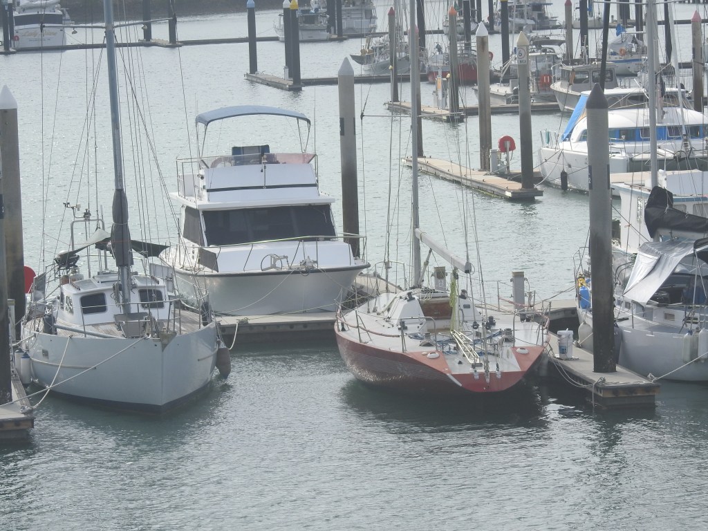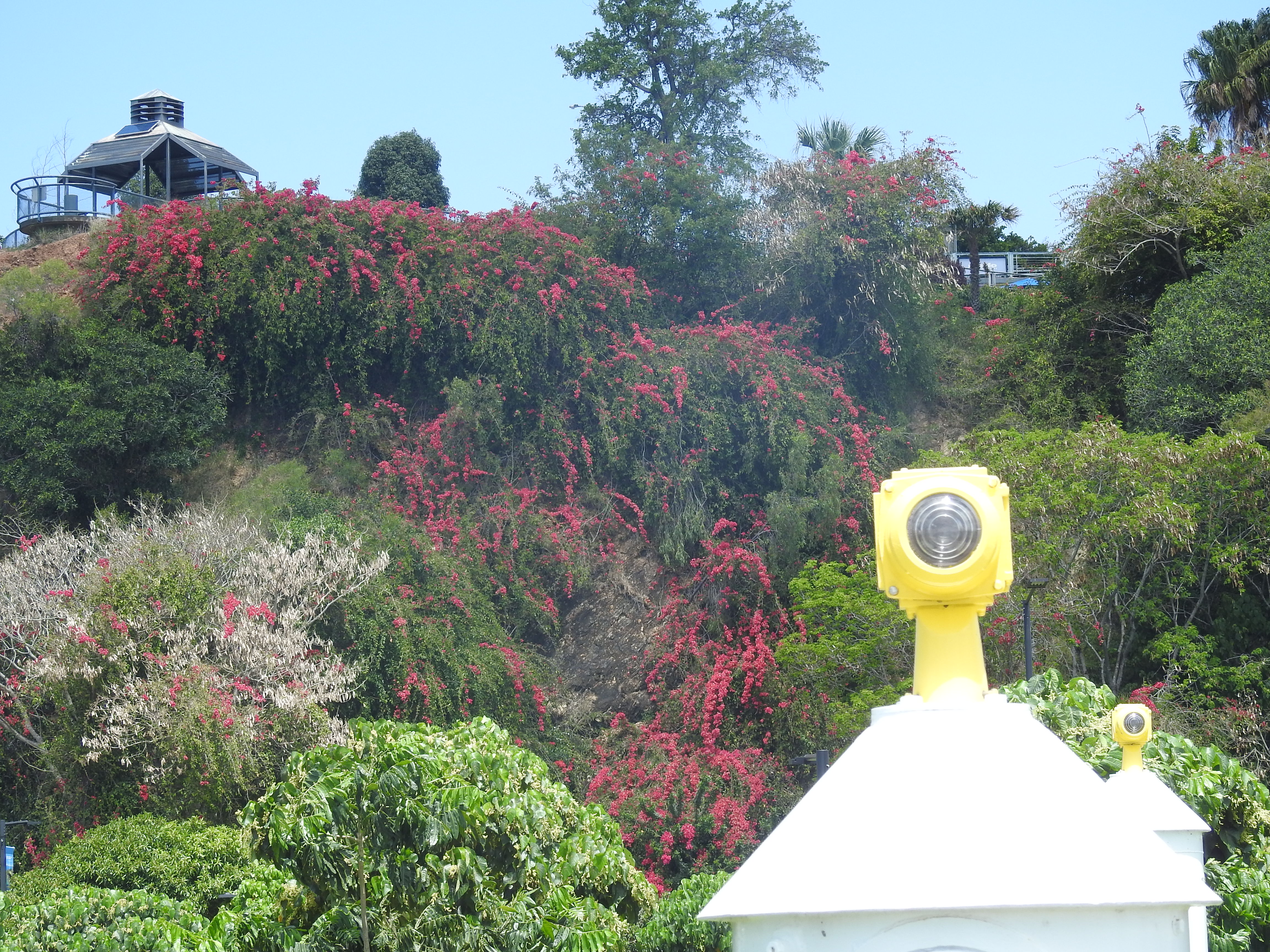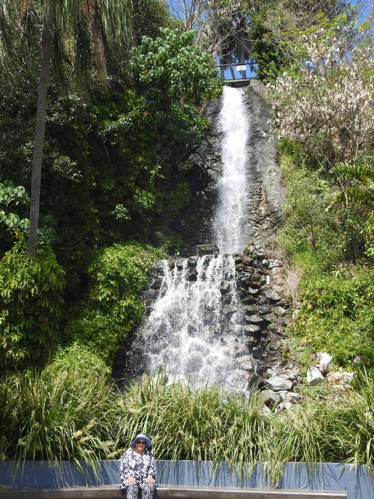 We drive around to the lookout on Auckland Hill, this has great views back down on to the marina, Spinnaker Park & the nearby docks on the harbour shores. Next we take the short trip down the hill to James Cook Park & have a walk around this rejuvenated dock area. The new cruise ship terminal looks great as does the surrounding foreshore parkland with beautiful sitting & BBQ shelters plus a lovely path along the foreshore. The park also has scattered remnants of the port, such as old lighthouses & lead lights. The Rotary Club has built a waterfall from the lookout on Auckland Hill down into the park & it is very nicely set off by the cascading red bougainvillea. While we are in the park we sit & watch as some tug boats pull a fully laden coal ship away from the dock & guide it on its way out the harbour. It is the same ship we saw this morning when we were on the barge, it was low tide then, it is near high tide now & the ship needs all the water it can get under its keel, they apparently draw 16 metres fully laden.