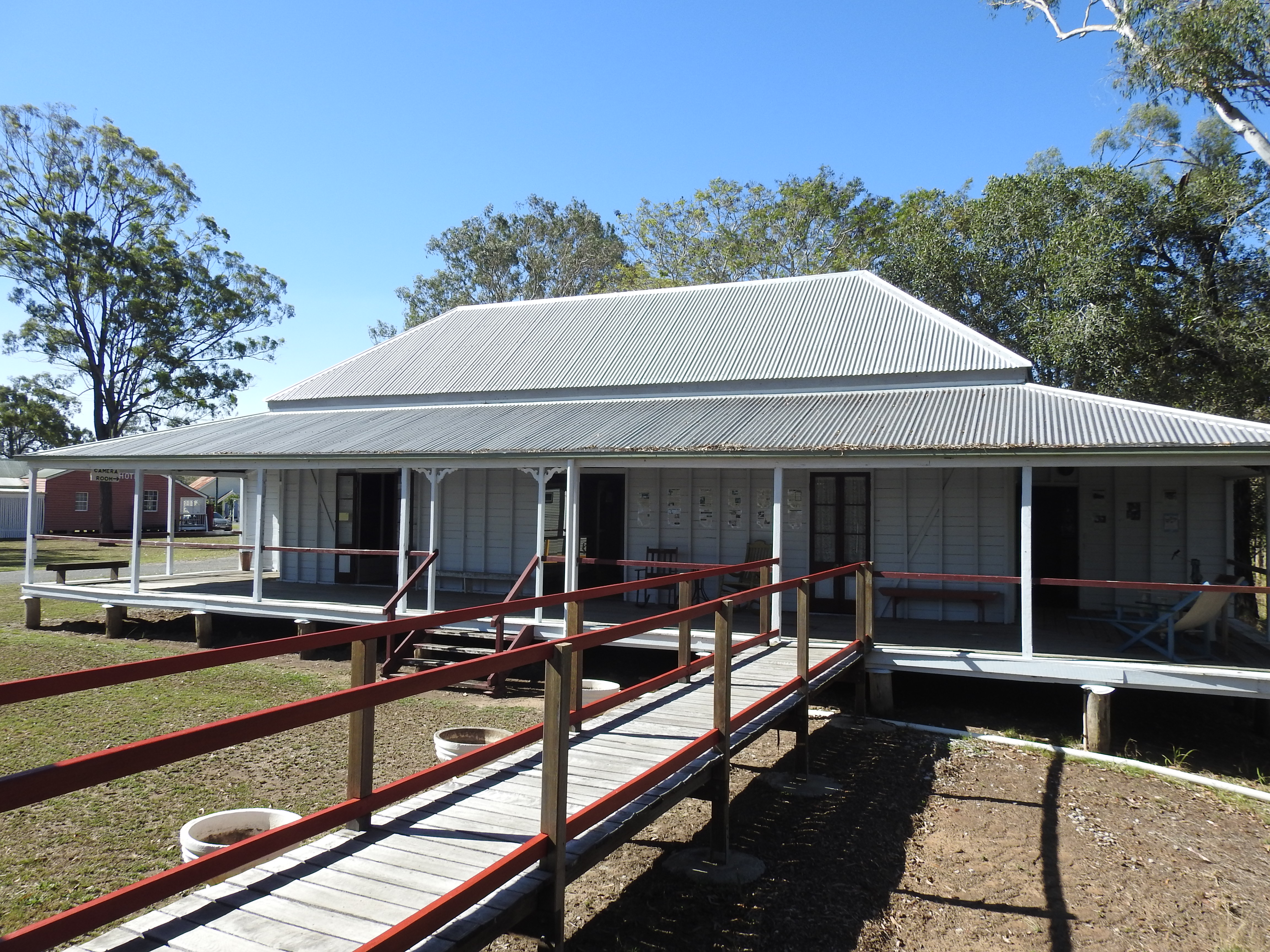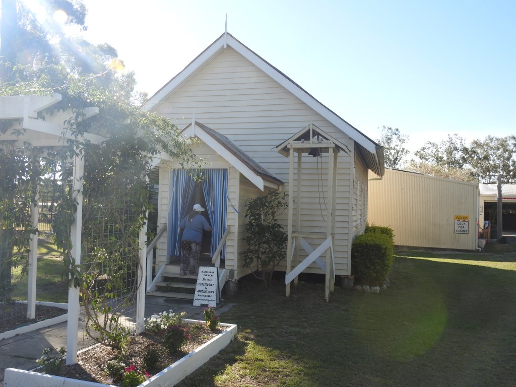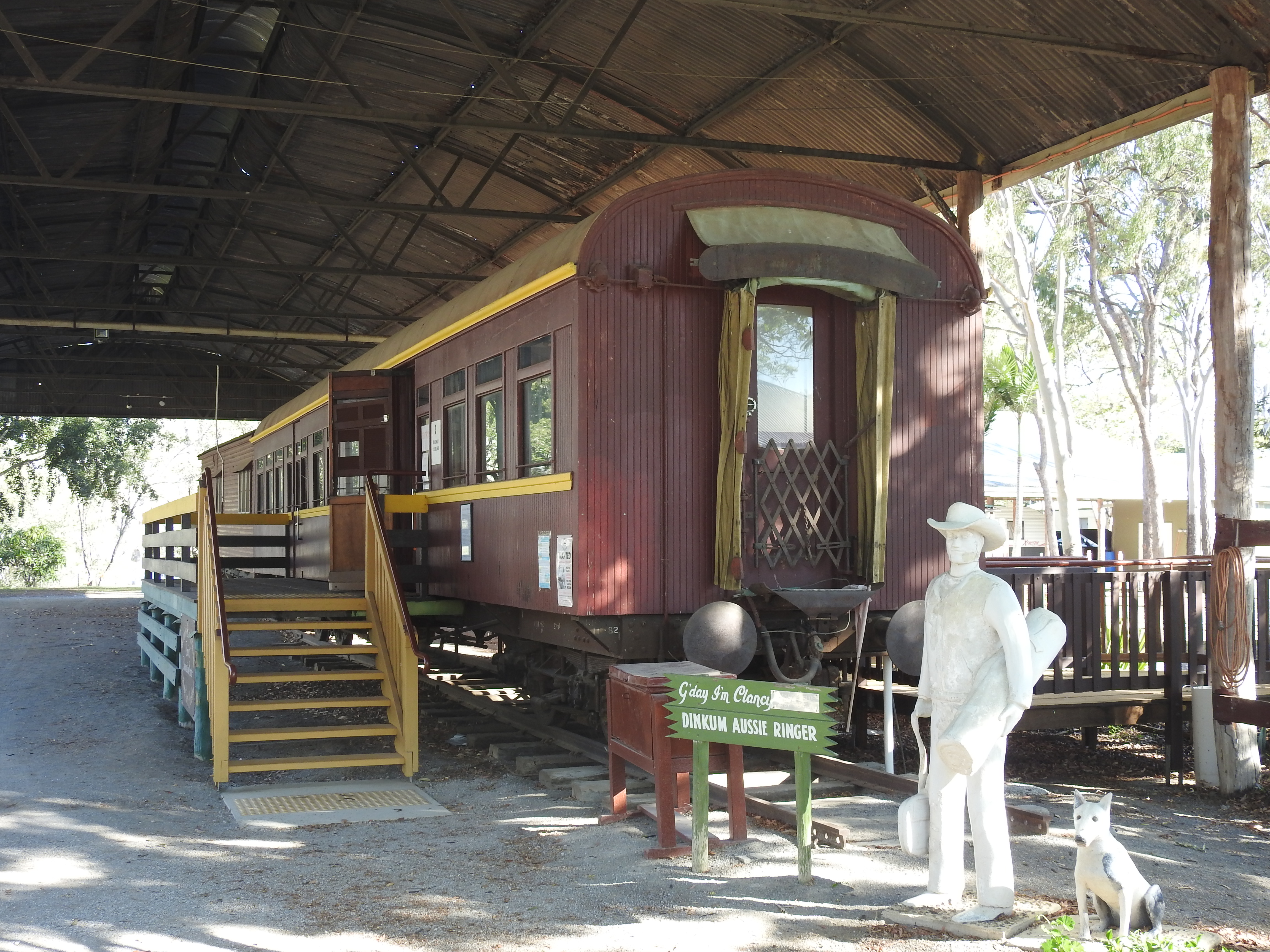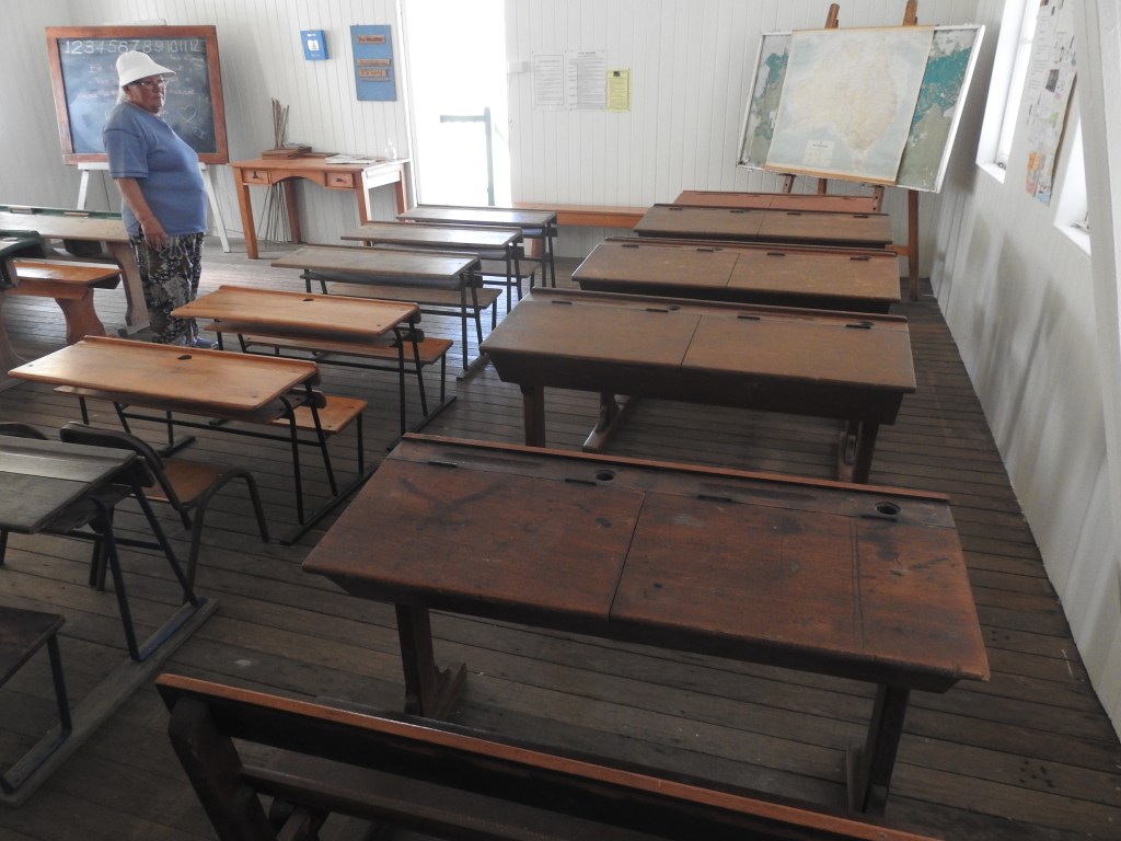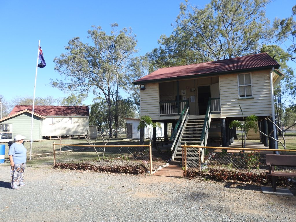 We set up then walk to the Calliope River Historical Village next door, this village consists of lots of old historical buildings that have been moved here from their previous locations, restored, furnished & open for display with a story on each building. The entry & food kiosk is the old Yarwun Railway Station building. We spend a good 2 hours walking around, looking at every building & the displays inside & reading the stories of each, it is very interesting. There is also a good collection of farm machinery & railway history. Inside the small Wright Cottage is an interesting display & we are surprised to find a possum resting on a shelf in a room suckling a young possum. There is even an old Freemason Hall completely furnished as it was left & the old school is also very interesting, Tereza & I reminisced about our memories of the desks with inkwells. The old Hazeldean Church is beautifully simple with an exquisite pulpit made by a farmhand of the time. We finished at 4pm just as the volunteers were packing up & leaving. Back at our van we relaxed with cheese, bikkies & a glass of red before walking down to the old bridge on the old Bruce Highway over the Calliope River. This old bridge is built on top of the old ford & you can still see the old rocks cemented in place to make the ford easier to cross. There are lots of people fishing for barramundi from this bridge as the tide comes in. It is remarkable watching the river flowing downstream over the rocks under the bridge then seeing at the next rockbar downstream the river flowing upstream with the tide. After a while the river is roaring over the rocks under the bridge as it floods upriver. The sunset is beautiful over the river & we walk back to our camp. The moon & stars are lovely & we have a nice cooling breeze blowing from the coast. Another great day.