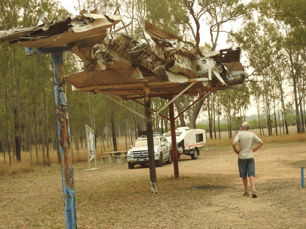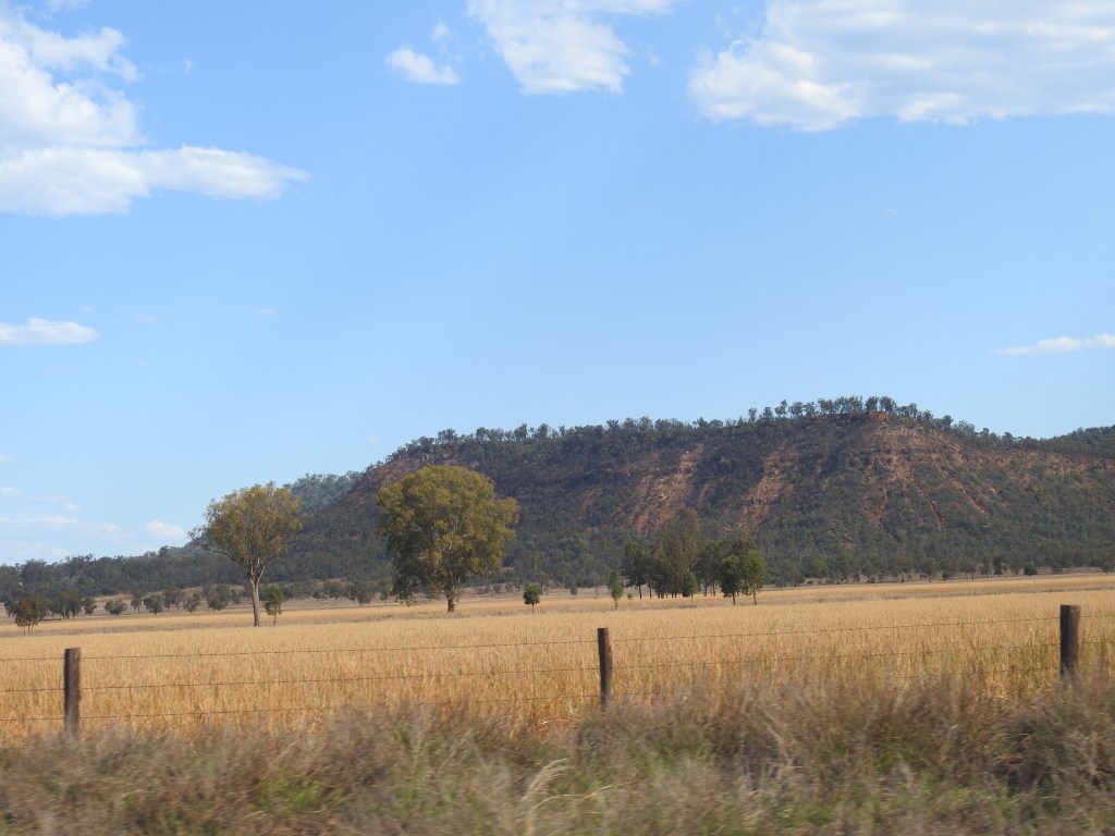 We were away from Biloela around 11am & the drive west is pleasant through the flat farm lands. There are some big paddocks freshly ploughed for cotton & some paddocks full of sticky looking plants that are planted in even rows, we don’t know what it is. The roads are long & straight but very bouncy, there must be lots of big trucks travelling over these roads. We travel at around 90km/hour. There are big storms brewing but we seem to pass under them before they start storming.