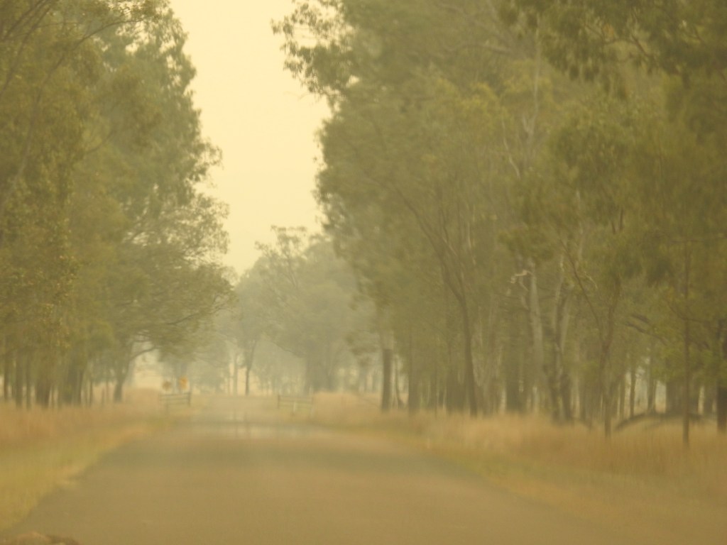 Rolleston is our turning point southwards & is a small rural crossroads town with not much going for it (in our point of view). More long flat roads with bounces, however, these are becoming less the further south we go. The mountains start to get bigger & there is lots of smoke around from burning off on some of the farms. The temperature is now 36 Centigrade. Around 80km south of Rolleston we turn off towards Carnarvon Gorge, a further 40 km in. To our surprise the road is bitumen, eleven years ago it was dirt. We are now driving through unfenced farms & after we pass a few ploughed cotton fields we come into cattle country with some cattle wandering down the centre of the road. The smoke gets thicker & we wonder if the National Park is burning.