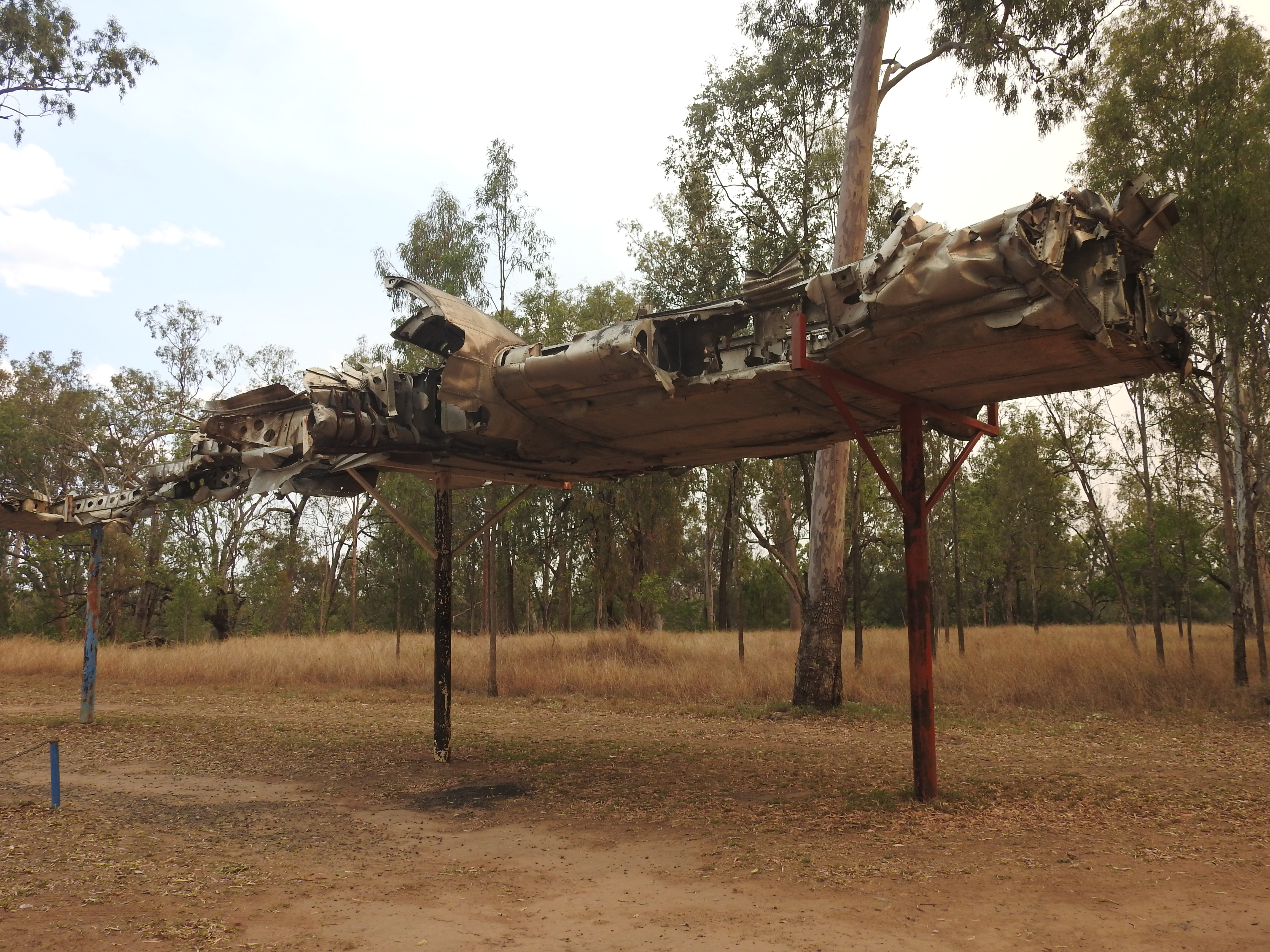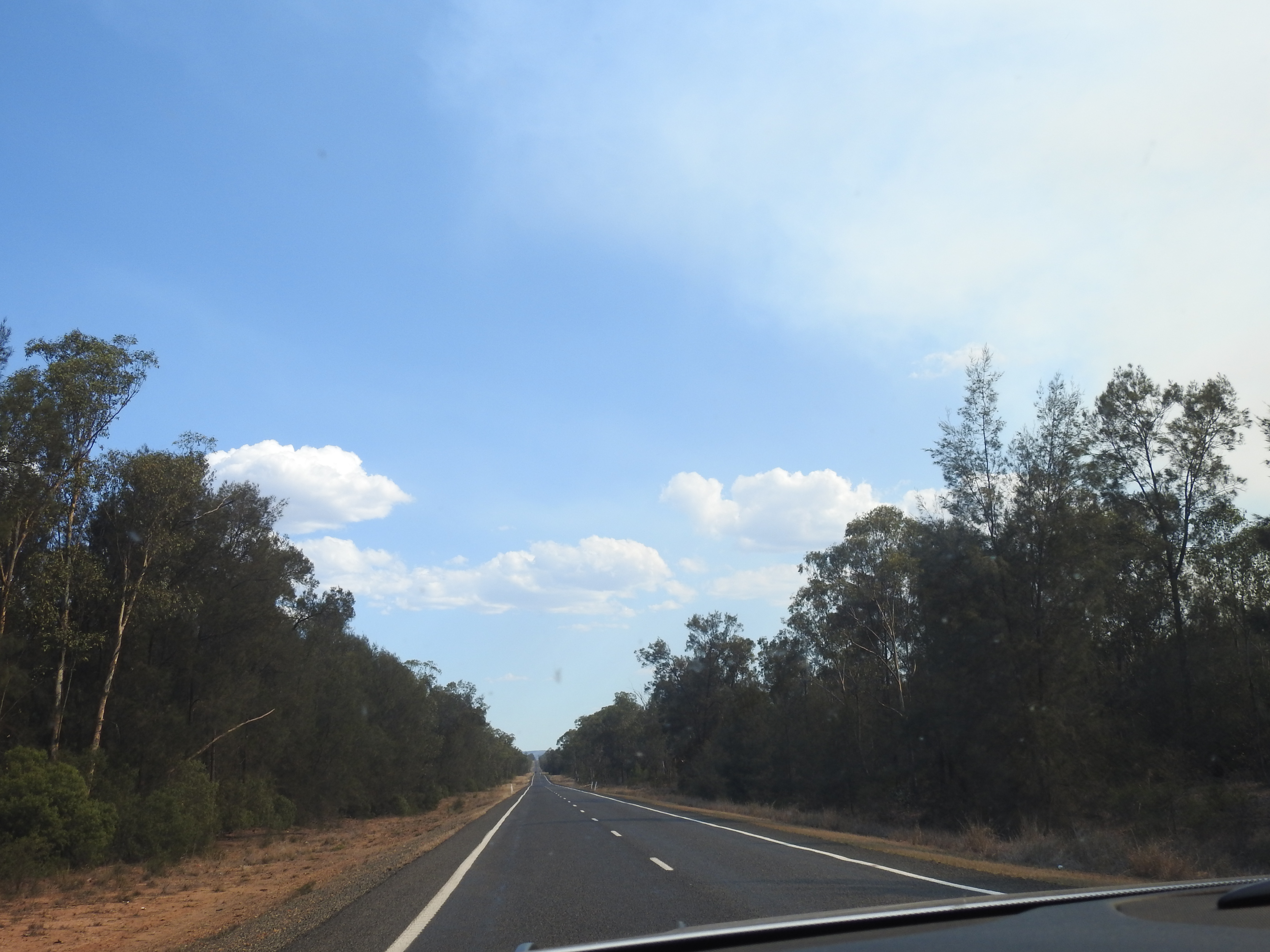 We were away from Biloela around 11am & the drive west is pleasant through the flat farm lands. There are some big paddocks freshly ploughed for cotton & some paddocks full of sticky looking plants that are planted in even rows, we don’t know what it is. The roads are long & straight but very bouncy, there must be lots of big trucks travelling over these roads. We travel at around 90km/hour. There are big storms brewing but we seem to pass under them before they start storming.