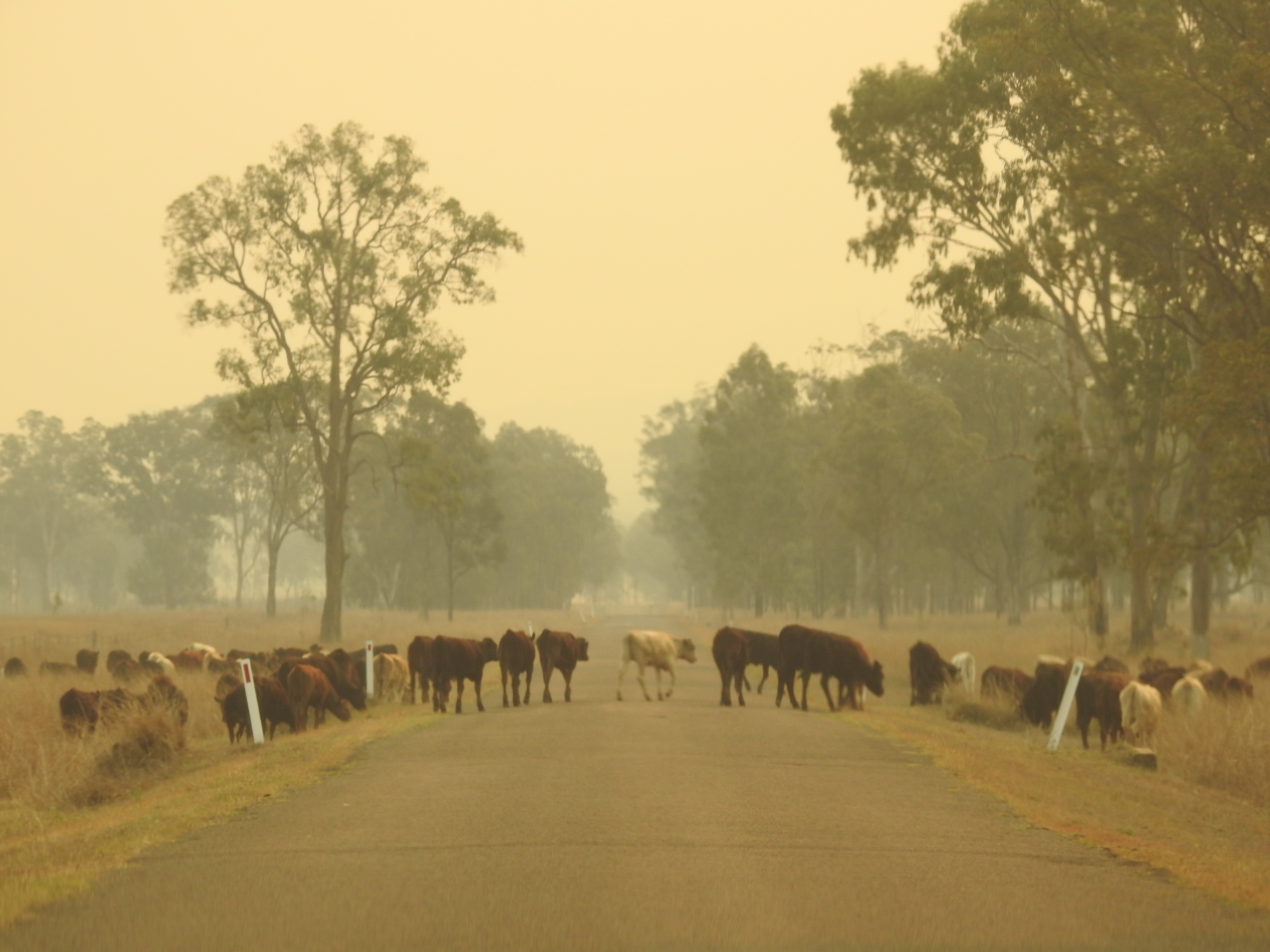 Rolleston is our turning point southwards & is a small rural crossroads town with not much going for it (in our point of view). More long flat roads with bounces, however, these are becoming less the further south we go. The mountains start to get bigger & there is lots of smoke around from burning off on some of the farms. The temperature is now 36 Centigrade. Around 80km south of Rolleston we turn off towards Carnarvon Gorge, a further 40 km in. To our surprise the road is bitumen, eleven years ago it was dirt. We are now driving through unfenced farms & after we pass a few ploughed cotton fields we come into cattle country with some cattle wandering down the centre of the road. The smoke gets thicker & we wonder if the National Park is burning.