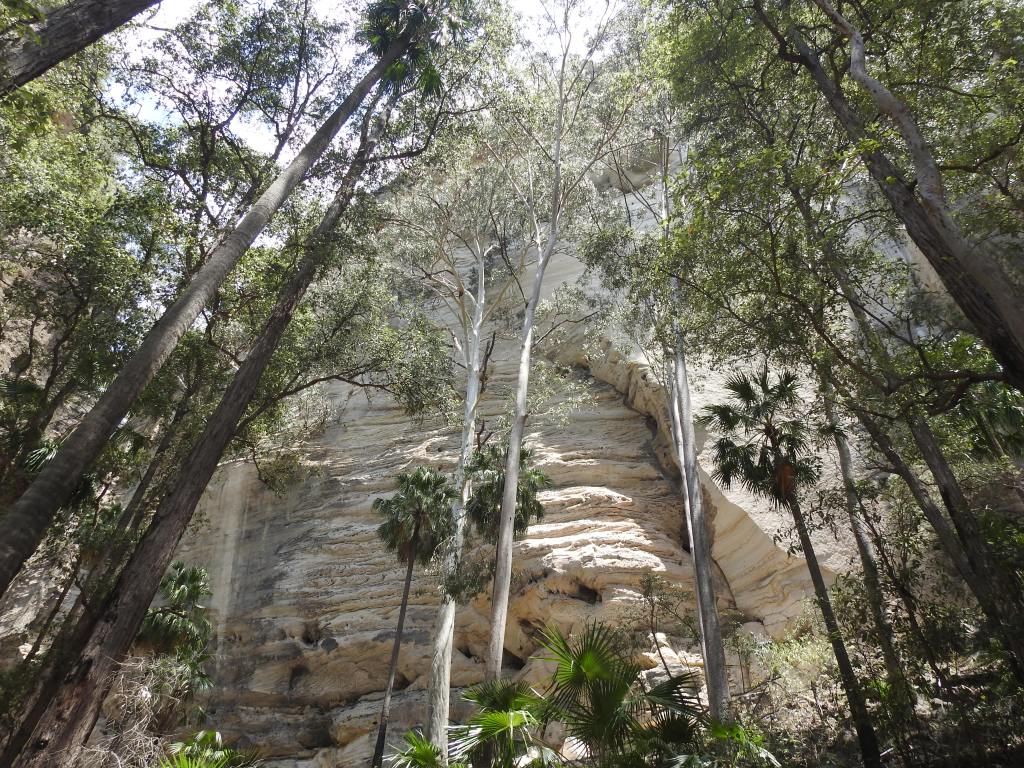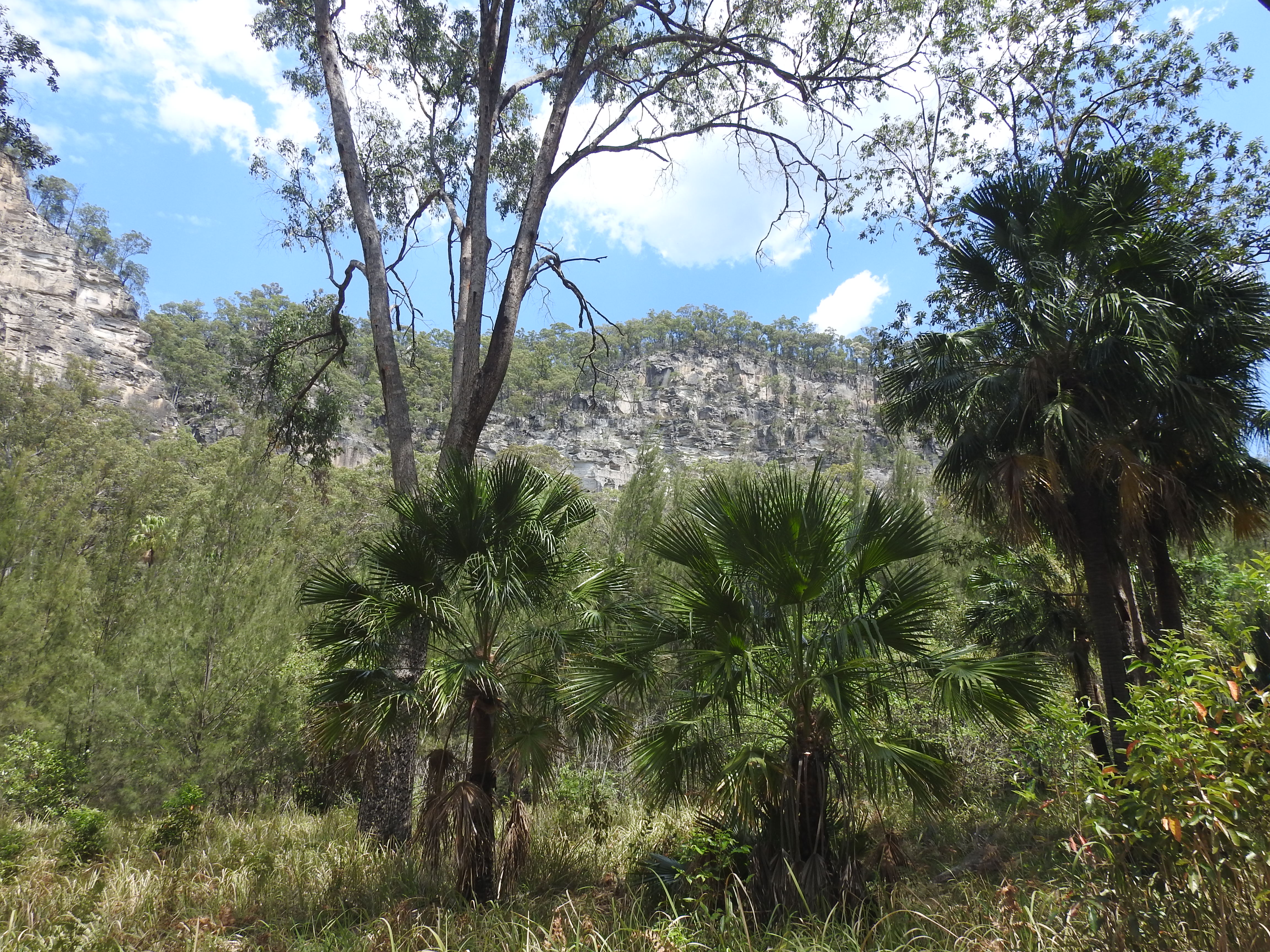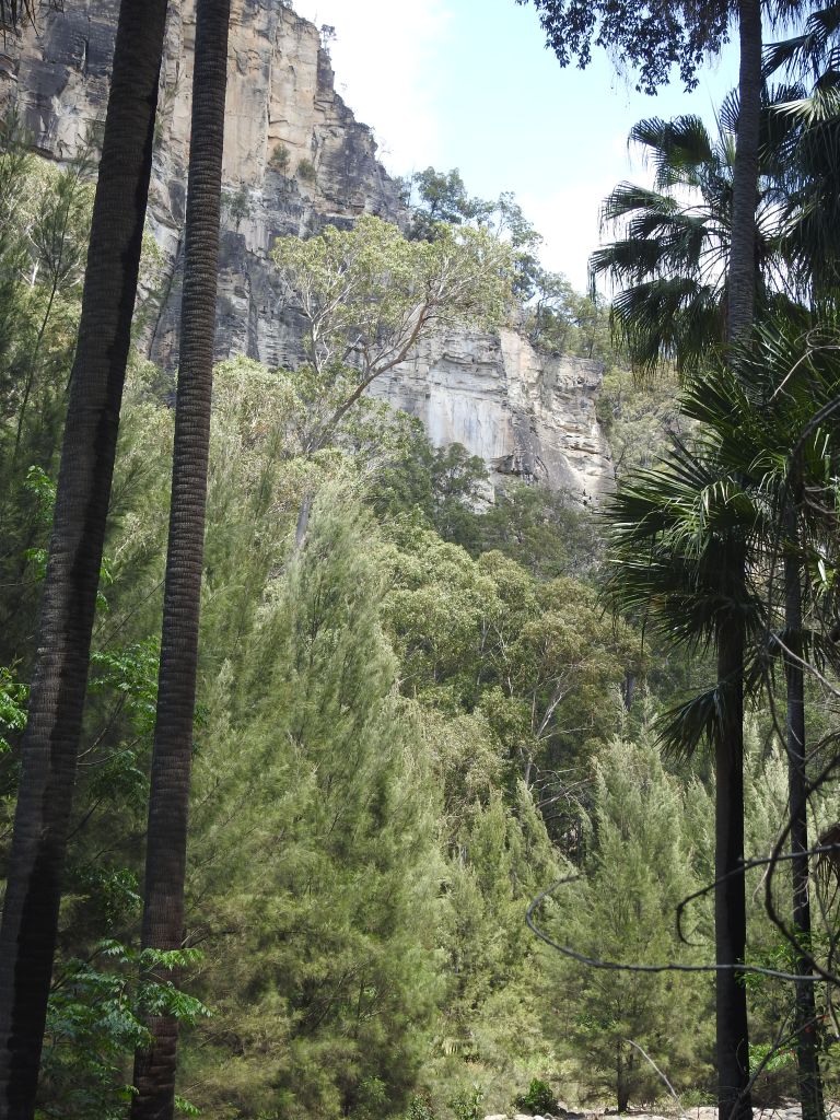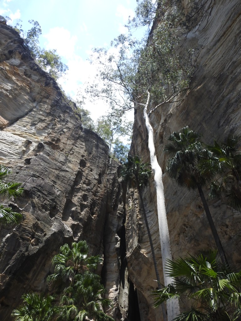 We cross the Carnarvon Creek over the dozen stepping stones full of excitement for the scenery that we knew lay ahead. The track has changed since we were last here with lots of steps put in along the track. We can understand why, the track is so worn in places from the huge amount of foot traffic. This is a very popular park, understandably so. There are a few walkers that overtake us as we are walking along slowly & taking our time. The scenery is just as beautiful as we remember it with the giant sandstone cliffs closing in on either side & giant gum trees & palm trees reaching to the sky. In places we can see that a fire has burned through here within the last year.