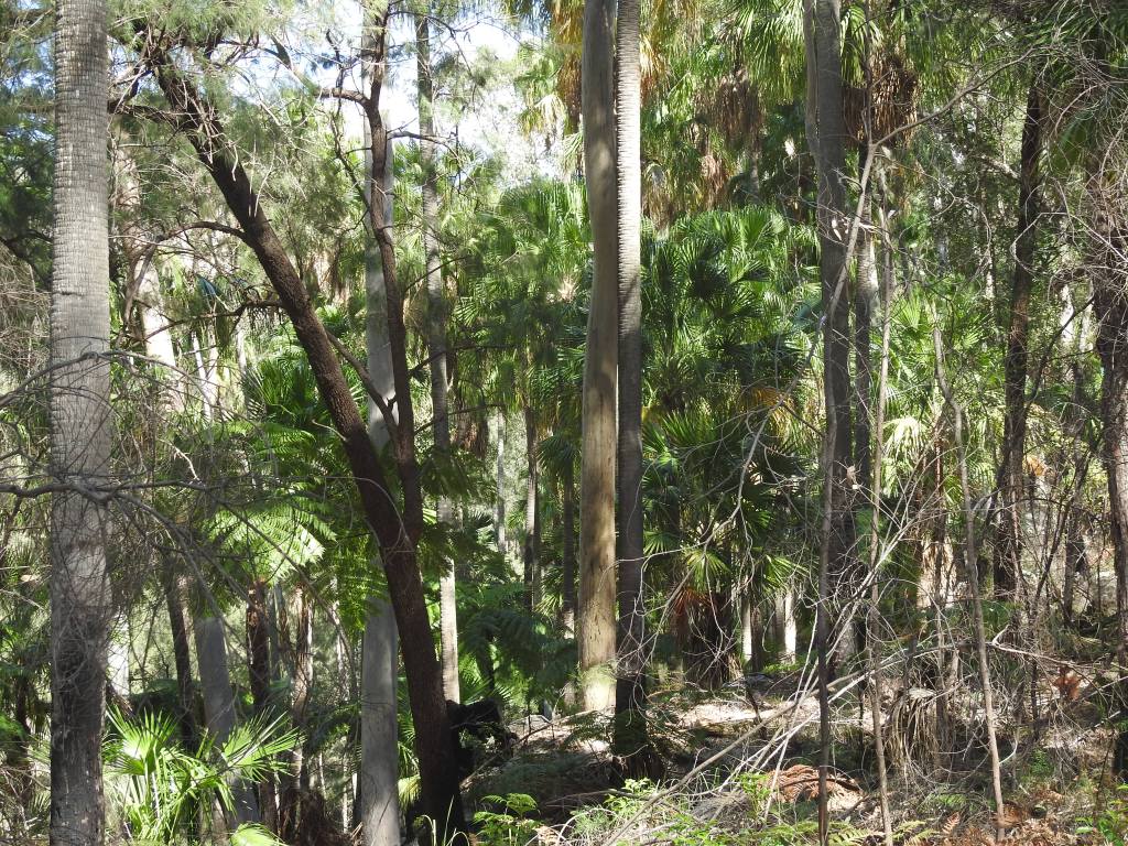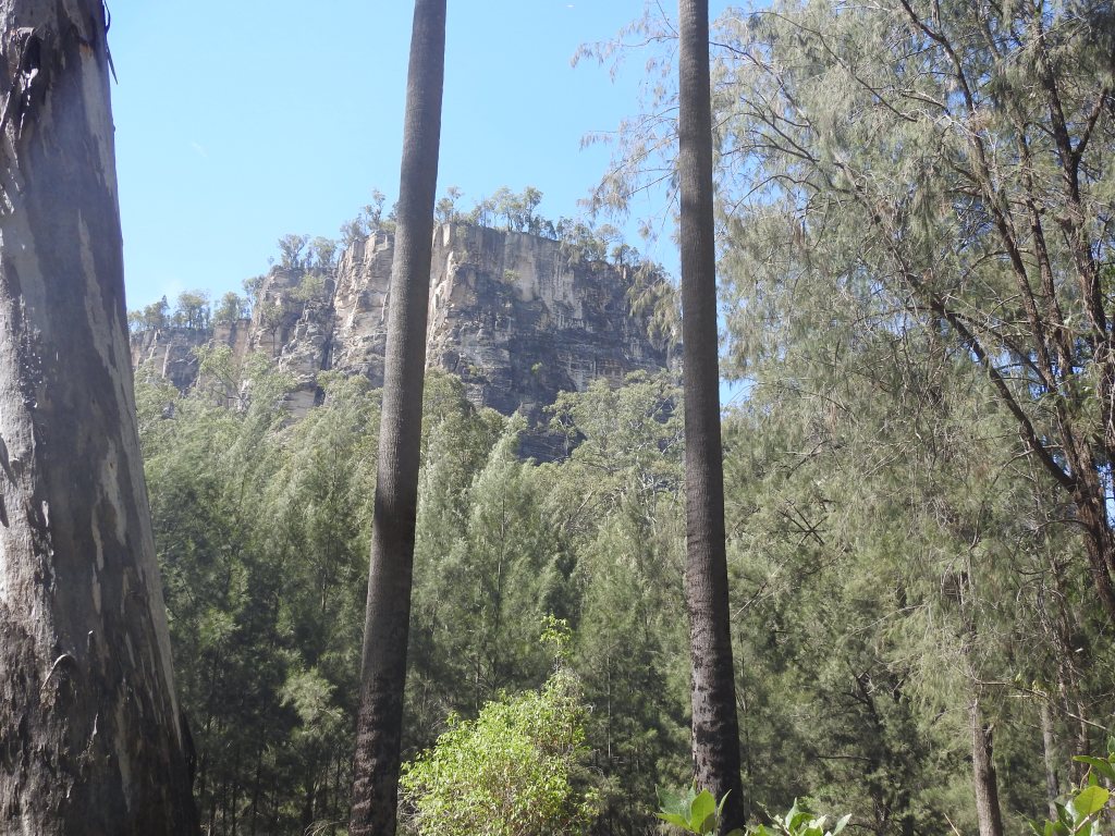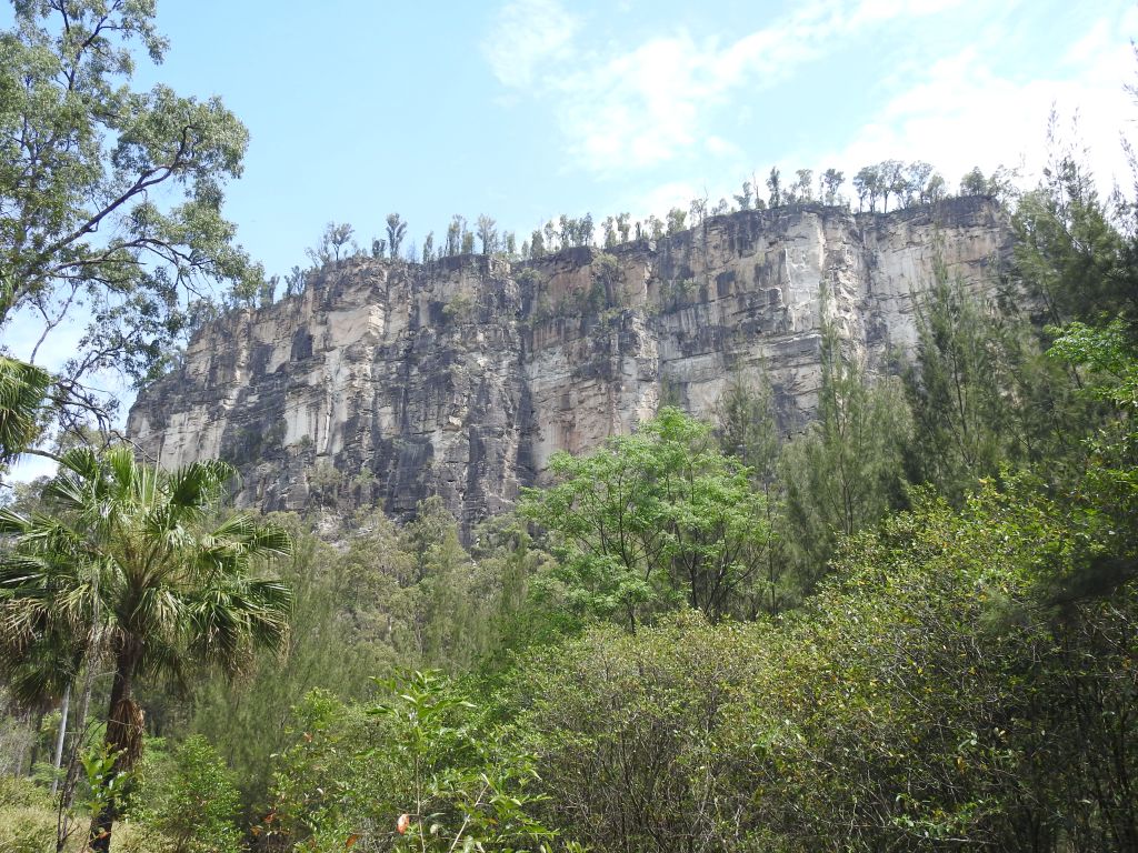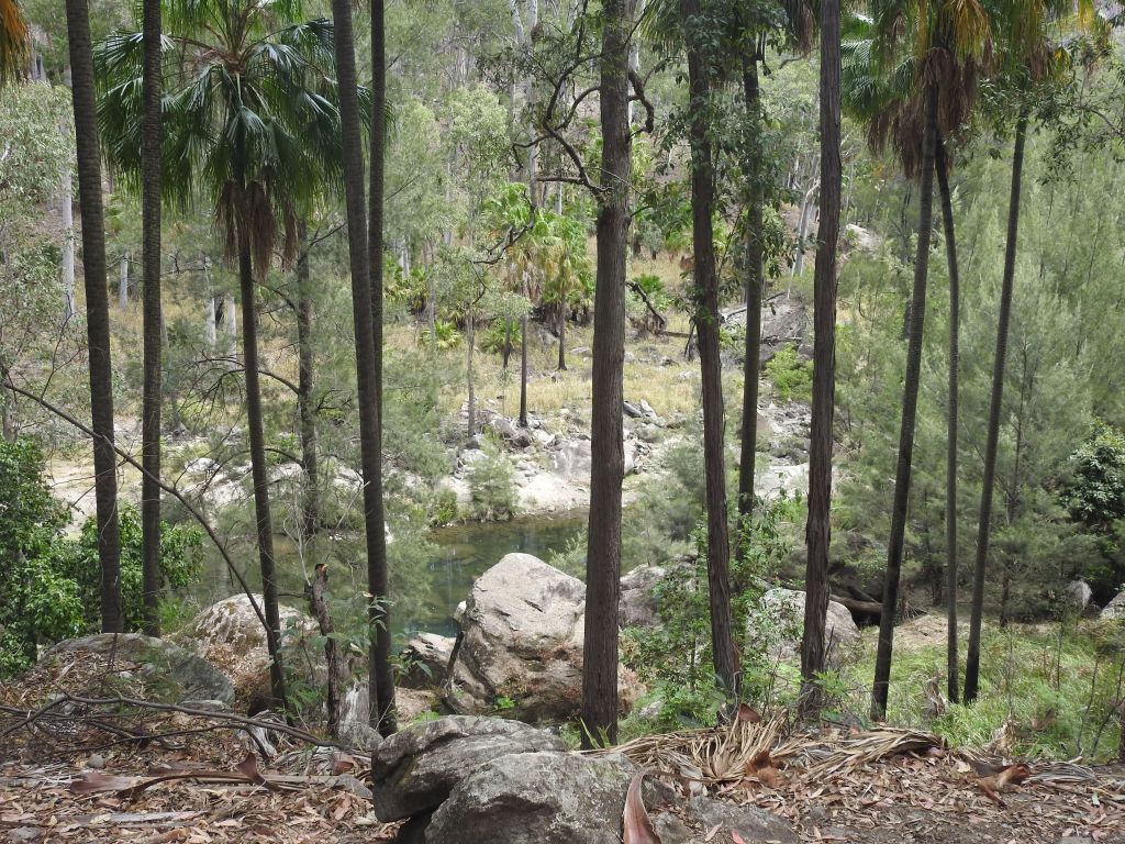 We cross the Carnarvon Creek over the dozen stepping stones full of excitement for the scenery that we knew lay ahead. The track has changed since we were last here with lots of steps put in along the track. We can understand why, the track is so worn in places from the huge amount of foot traffic. This is a very popular park, understandably so. There are a few walkers that overtake us as we are walking along slowly & taking our time. The scenery is just as beautiful as we remember it with the giant sandstone cliffs closing in on either side & giant gum trees & palm trees reaching to the sky. In places we can see that a fire has burned through here within the last year.