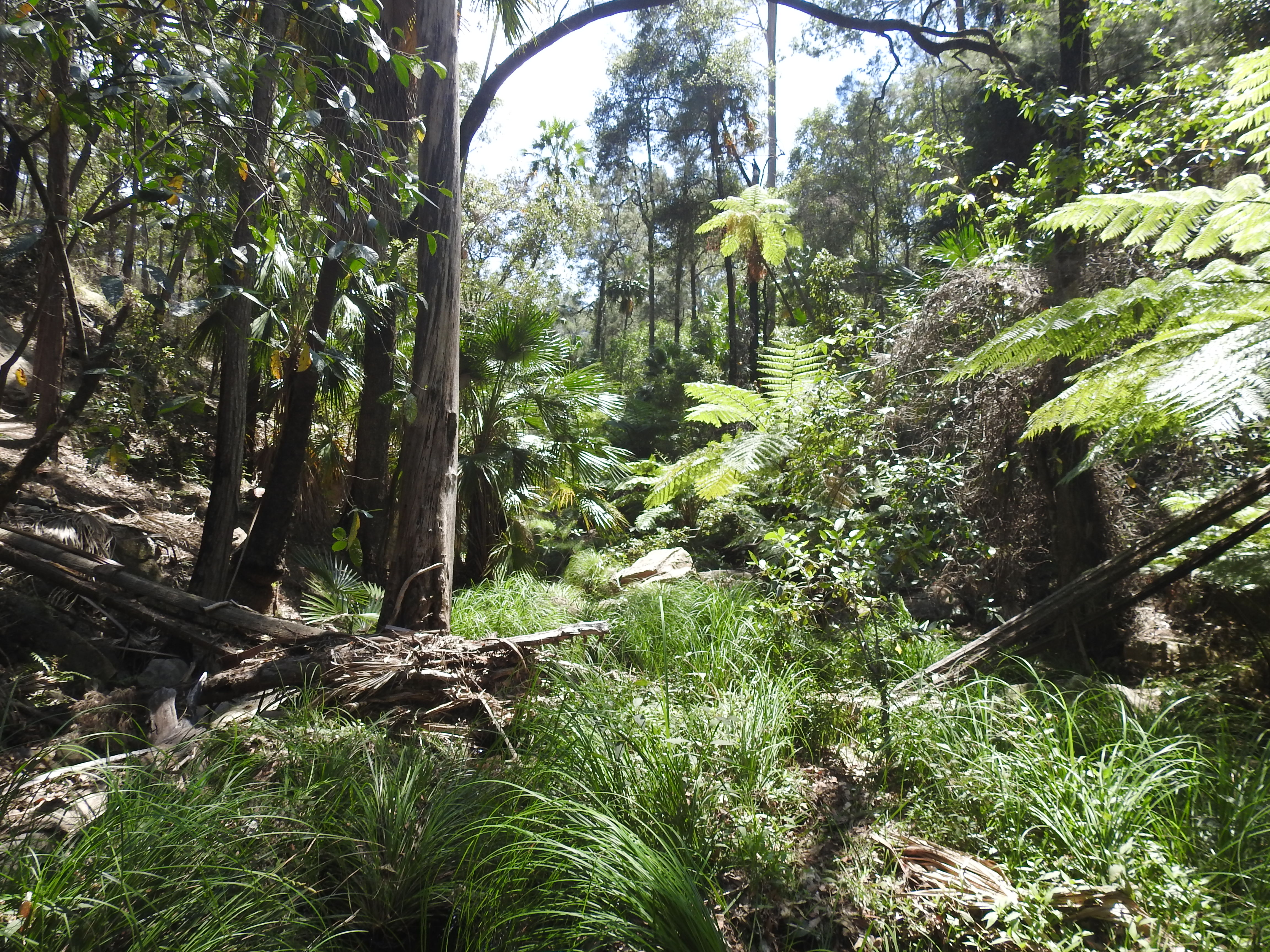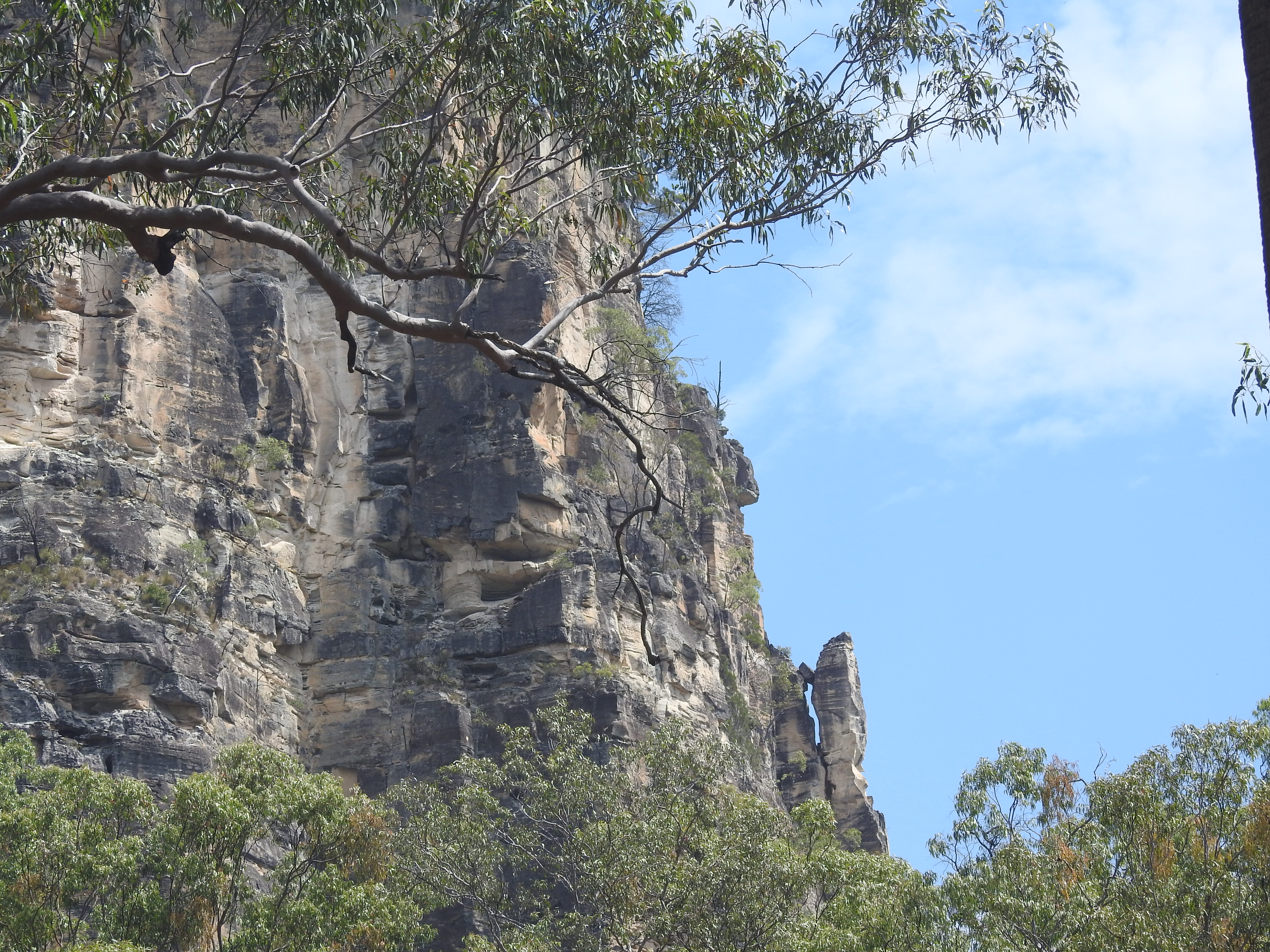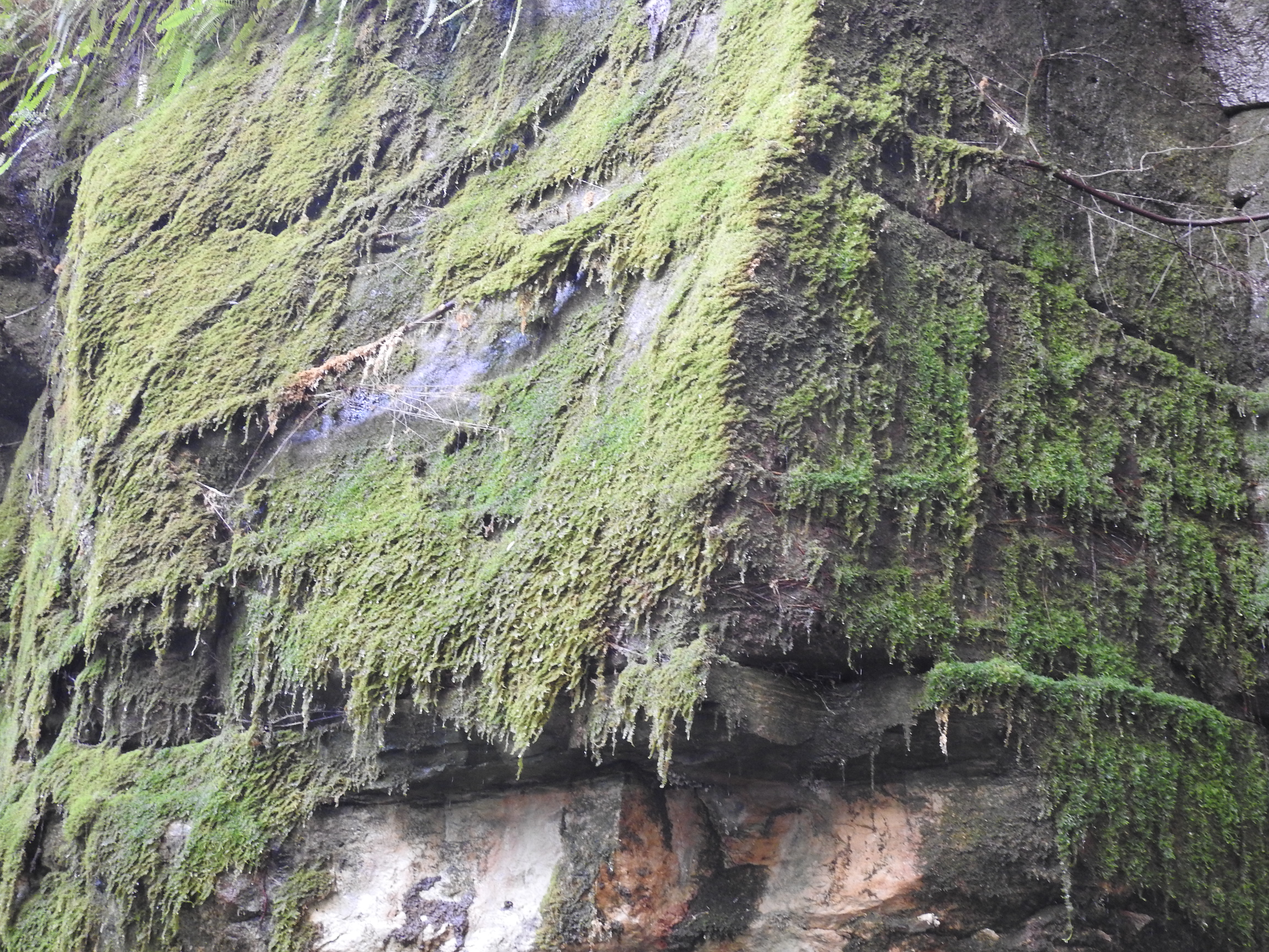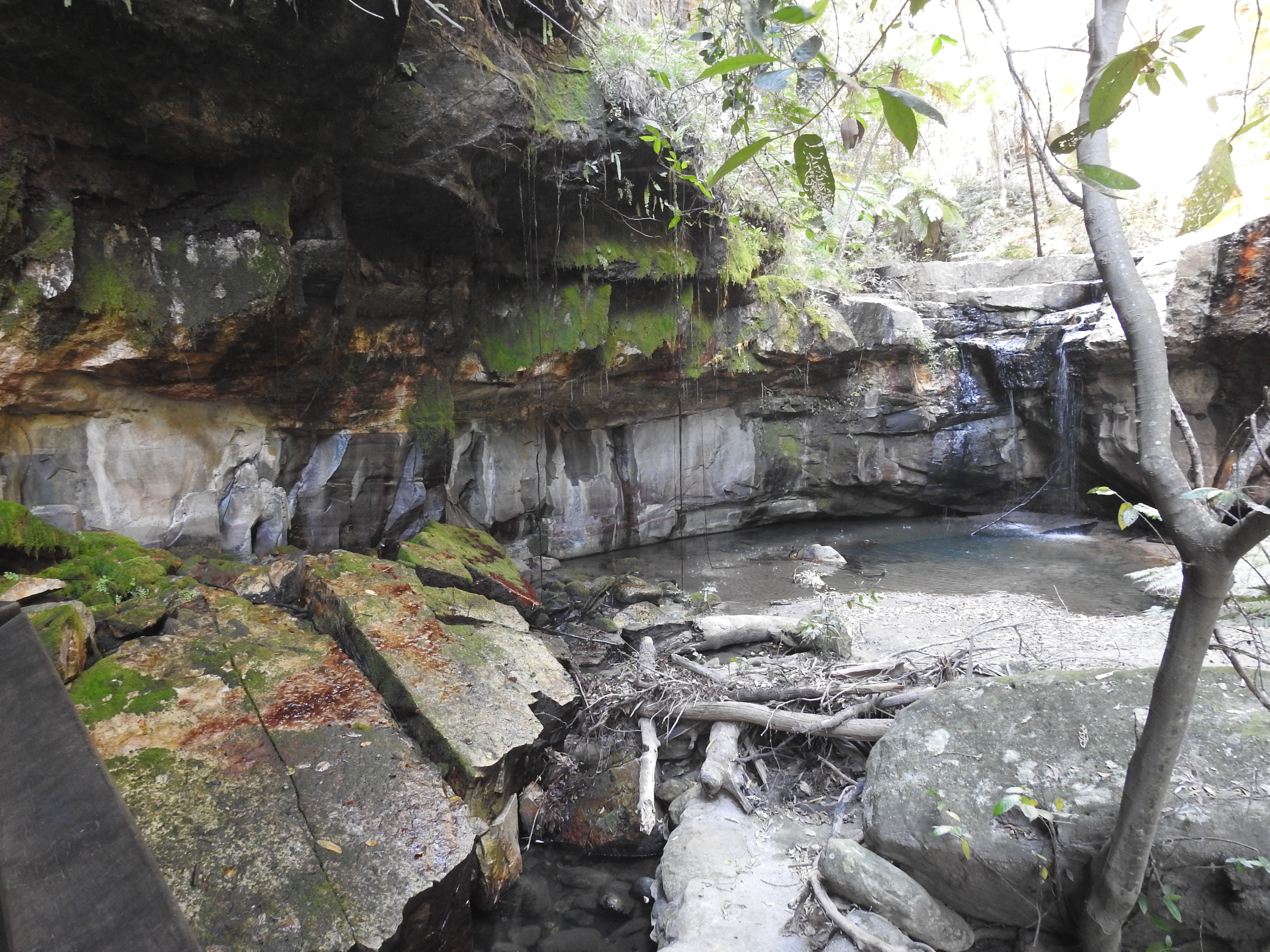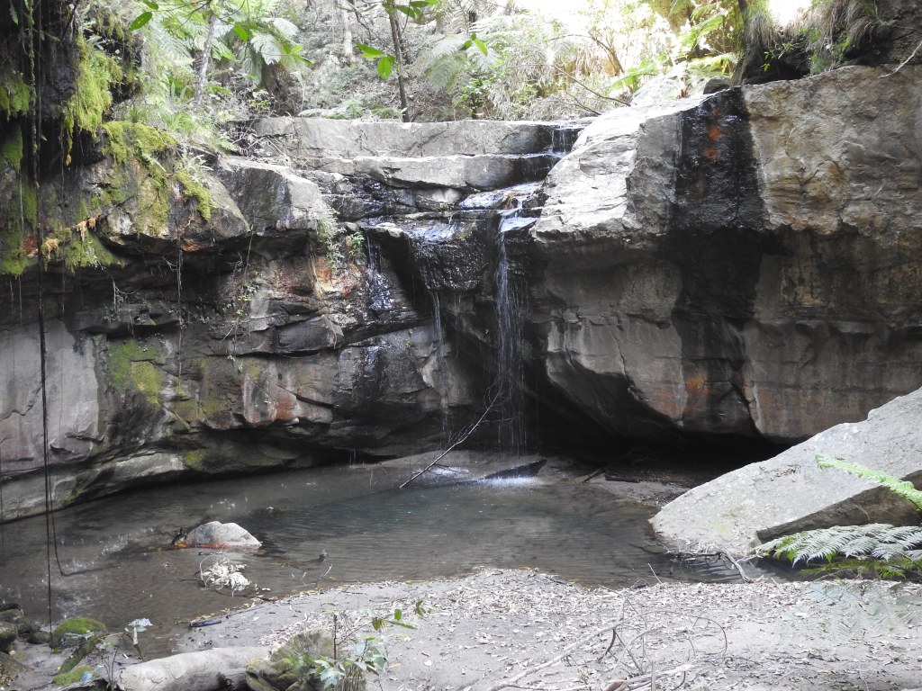 As the time passes there are lots more people that walk past us, some stop for a chat. The turn off to the Moss Garden is a bit over 3km along the track & it is a further 600m in & up the side of the gully. It is tough walking with lots of rough steps up & down crossing a few small creek beds. There is a new board walk & seats here but the moss gardens are just as beautiful with the small waterfall & all the moss growing on the rocks with water dripping out of it. It is also very wonderfully cool in here as the day is starting to really warm up. We sit & have our morning tea & wash it down with some of the cold water we brought. The colours here are amazing as the sandstone is sitting on top of an impervious layer of shale & the contrast in colours from the shale to the sandstone to the mosses & ferns is very pretty.