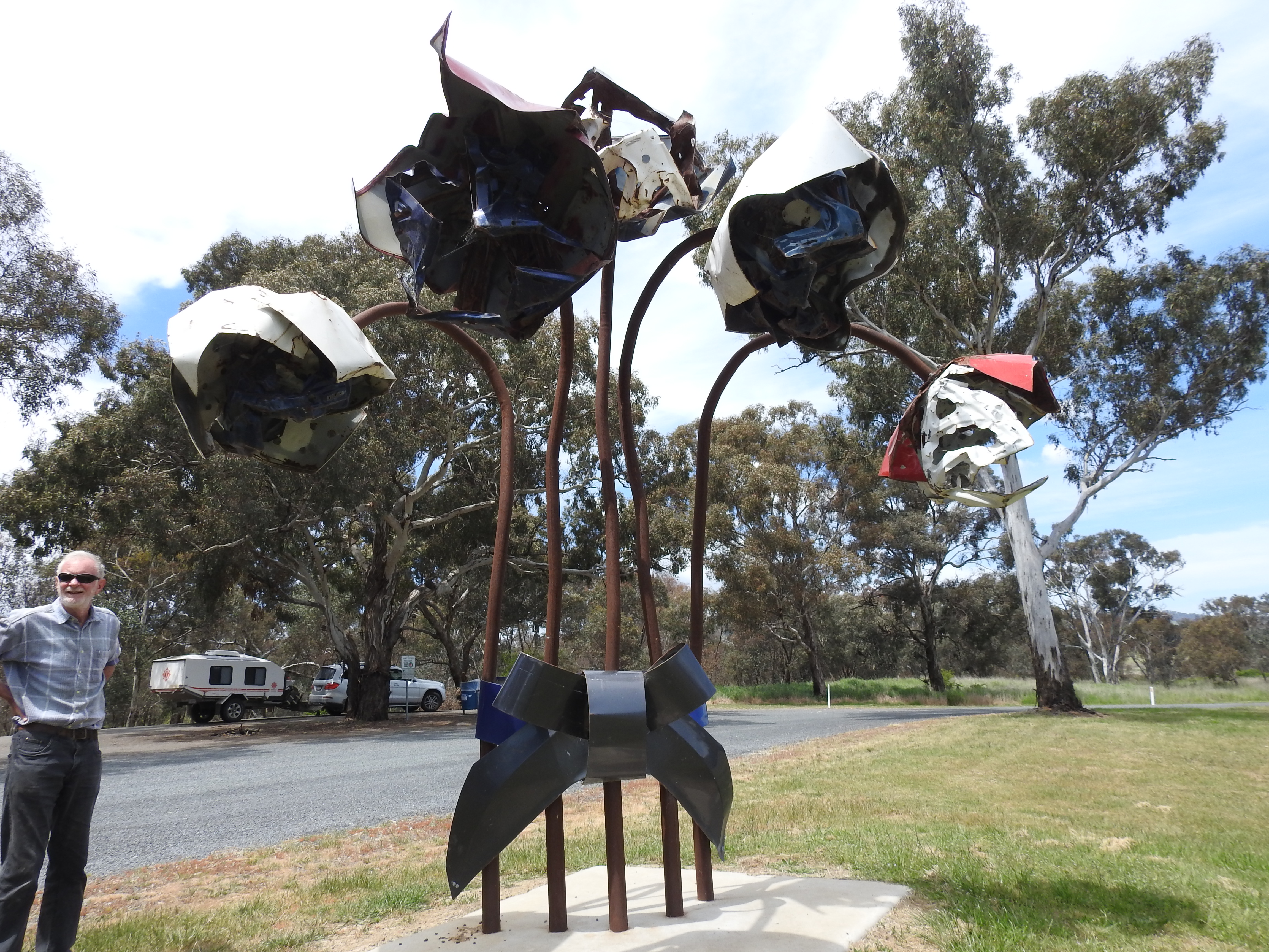 We were up at daylight & started organising & packing the van. There was ice on the car windscreen, we are not used to it being cold, we haven’t been this cold since we left Canberra in July. It is hard to believe we will be home today. The drive out from the farm on the dirt road was very slow, I don’t want to risk another puncture as we only have a skinny spare now.  There is not a lot of traffic on the road all the way to Canberra. The fields are all green and the crops all look very lush. We stop just outside of Hall to stretch our legs & look at an interesting sculpture at the rest stop, it is made from parts of wrecked cars & was made to remind people about the tragic loss associated with road accidents.