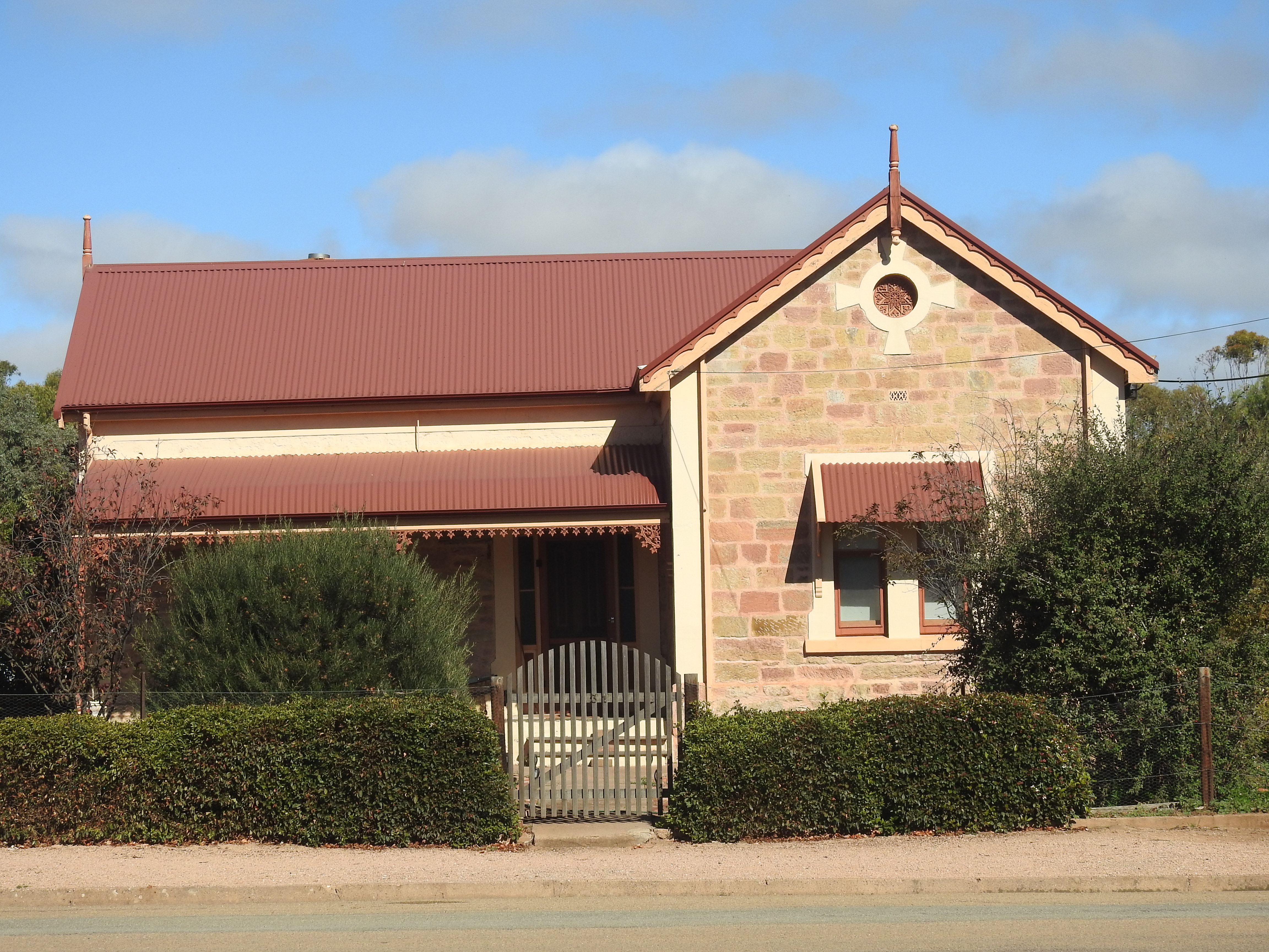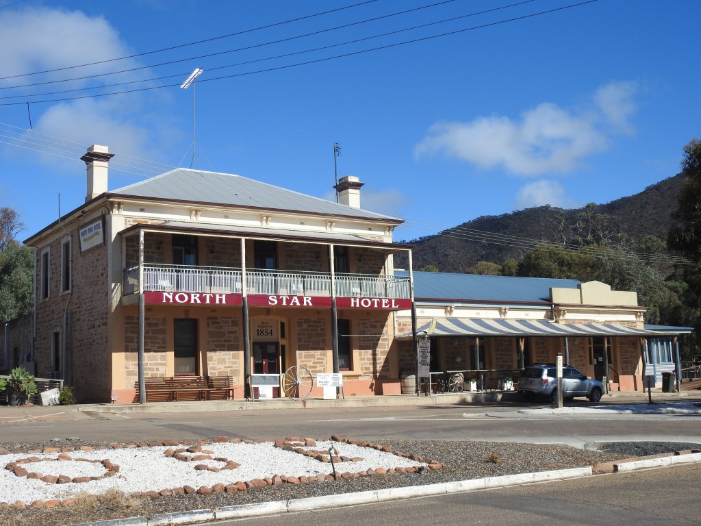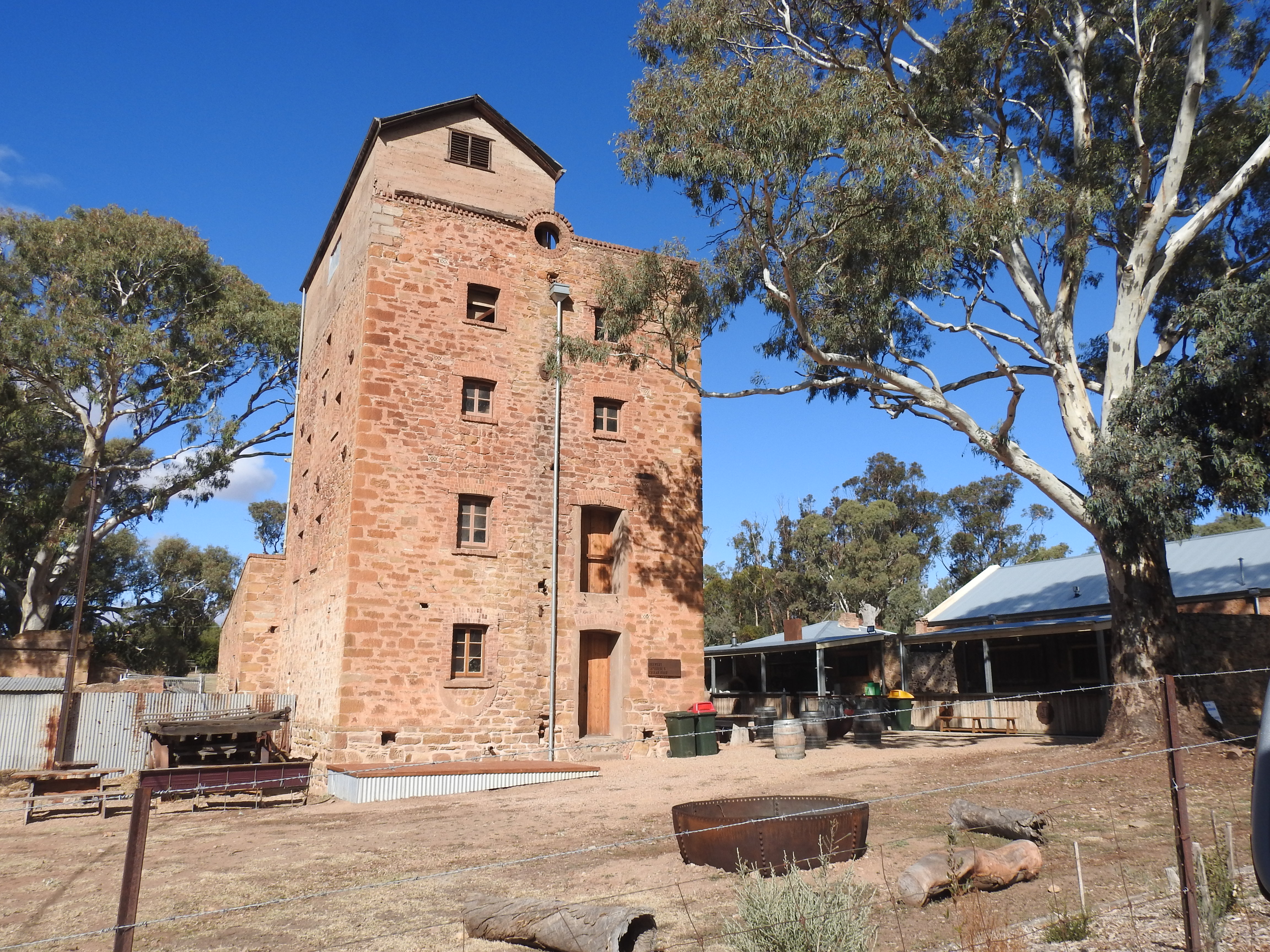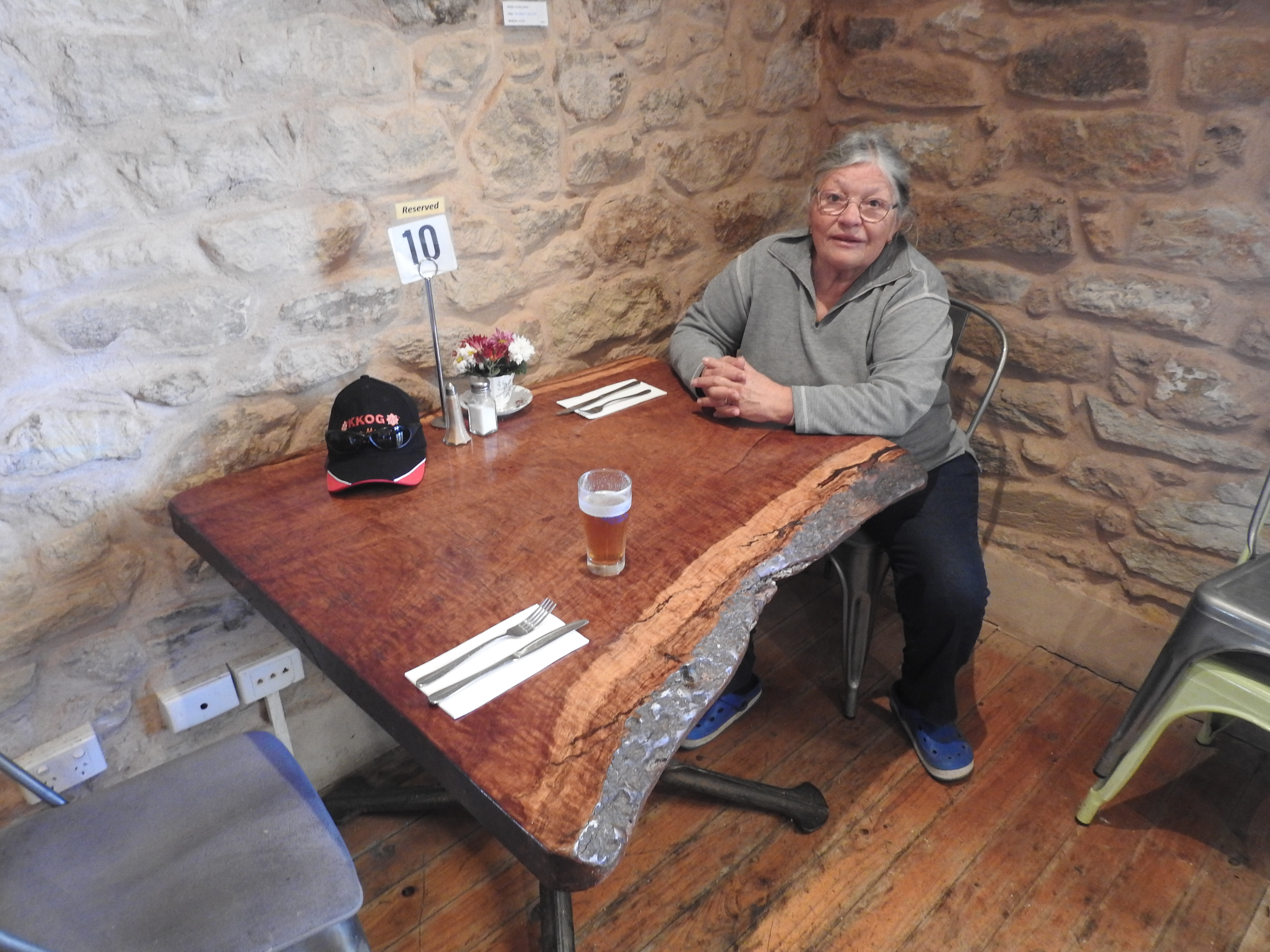 We slept well, lovely & cosy under our eiderdown doona but woke to a cold foggy morning. After breakfast I wander over to register & pay. The day is a beautiful sunny 19C by now. We drive into town & have a walk around looking at the beautiful old stone houses. We found the one & only grocery store where we bought a loaf of bread & some fruit. We have a delicious lunch in the old stone North Star Hotel which was built in 1854. Inside the building it has very high ceilings with old wool bags lining it and stone walls, the tables were slabs of redgum. A rustic charming place. We drive around town, though we could have walked as the town is very small, to admire the few old buildings, the Jacka Brewery is a standout, around 4 stories high & a lovingly restored former flour mill. An unusual sight outside the Anglican Church in Church Street is a massive old tree with one lane of the road going around each side of it.