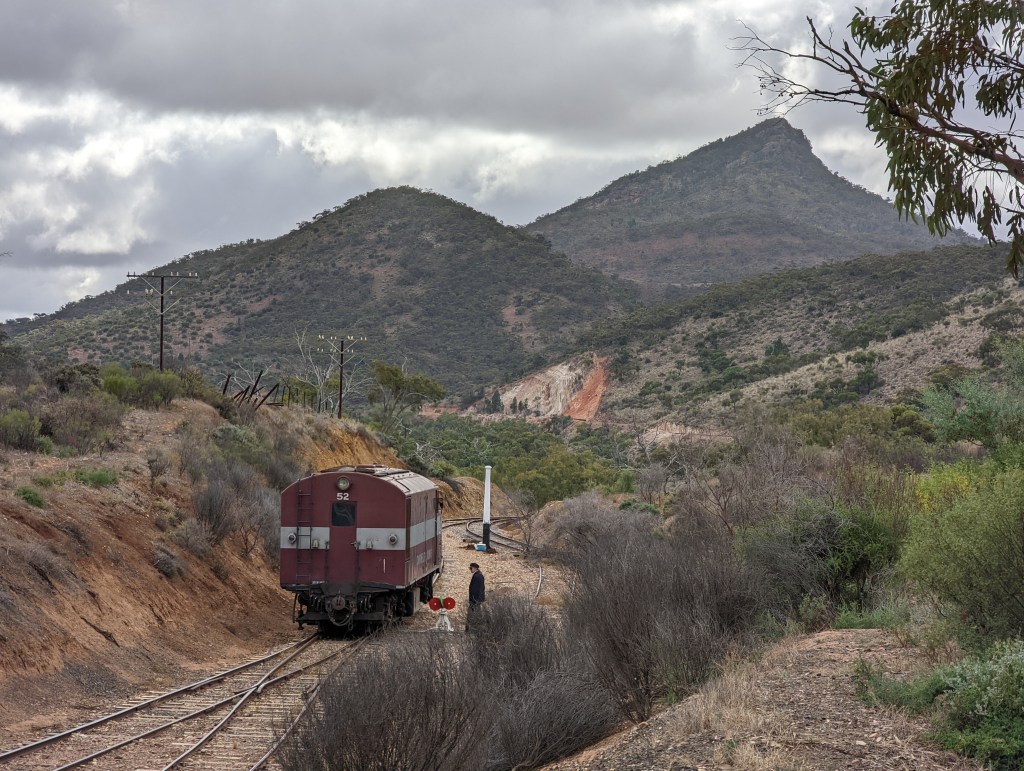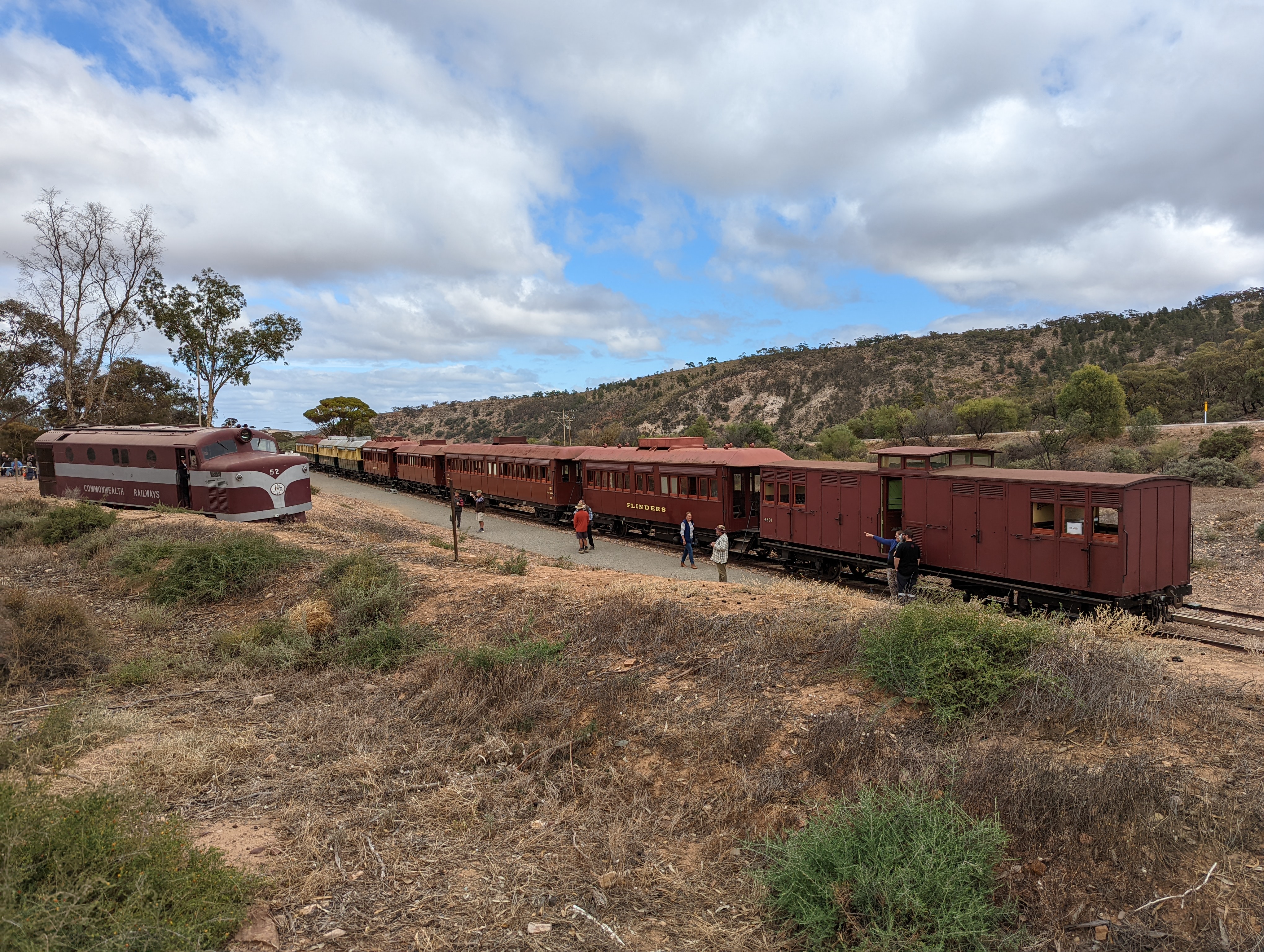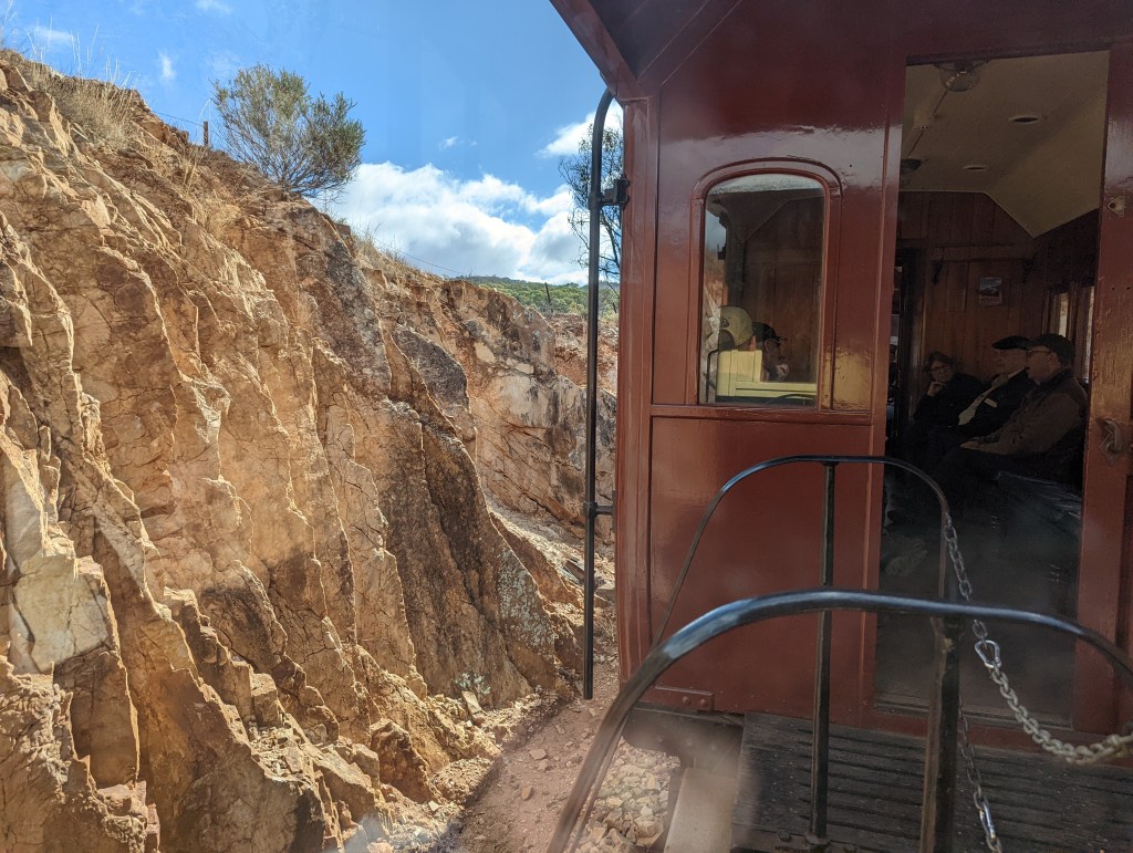 The old narrow gauge line wound through the hills & slowly climbed to an old siding called The Summit before winding slowly down through the Pitchi Ritchi Gorge & ending at Woolshed Flat. We stop & wander around, look at another small museum & have morning tea while the engine is uncoupled & shunted around to the front of the train for the return journey. We had nice chats with the other people in our carriage & a few nice chats with the conductor as he came & sat with us for a while. The trip back was also slow, the countryside is interesting & we get another perspective of a landscape feature called Devil’s Peak, very distinctive. The countryside is very dry, with lots of spinifex & bare dirt.