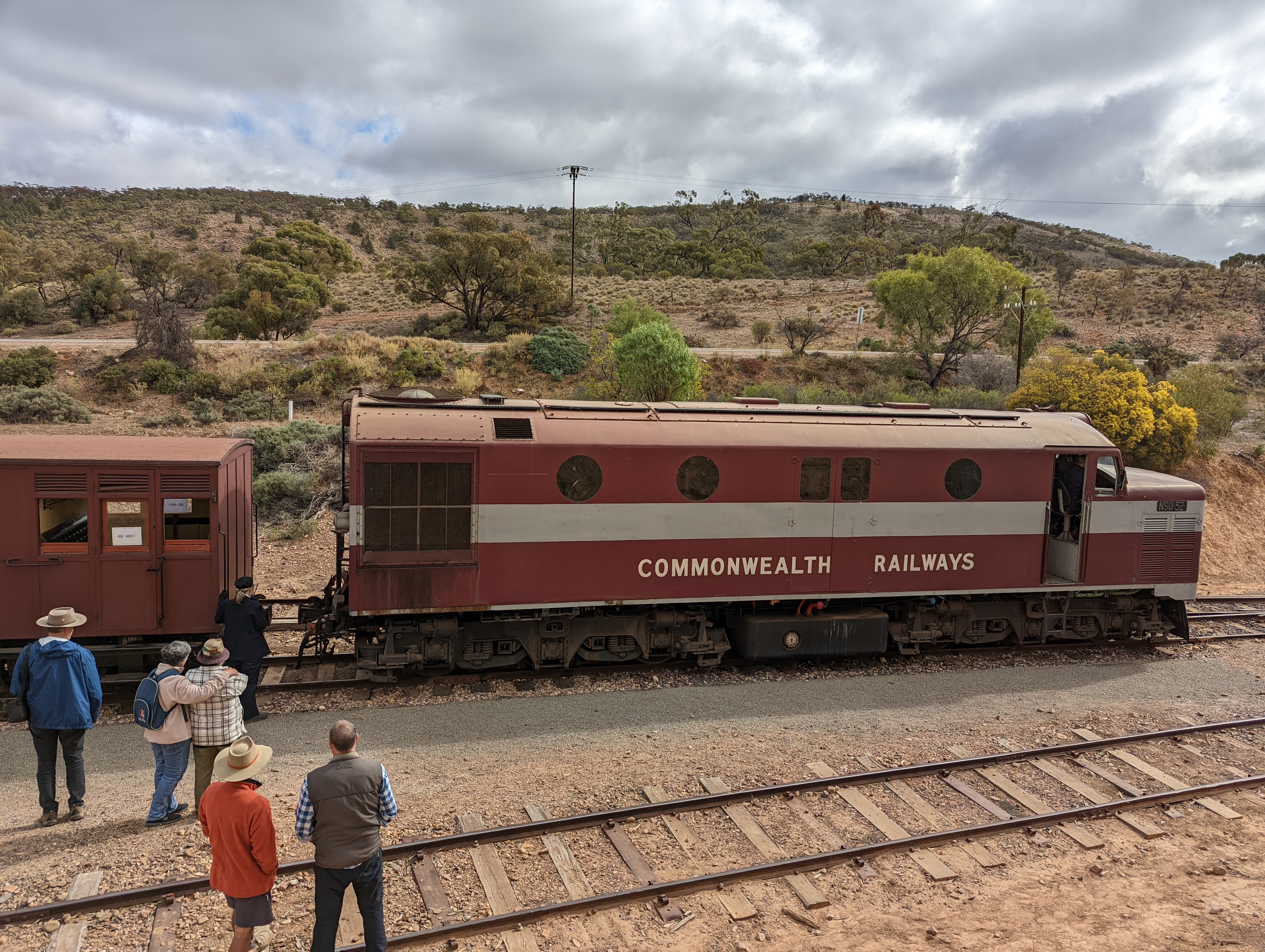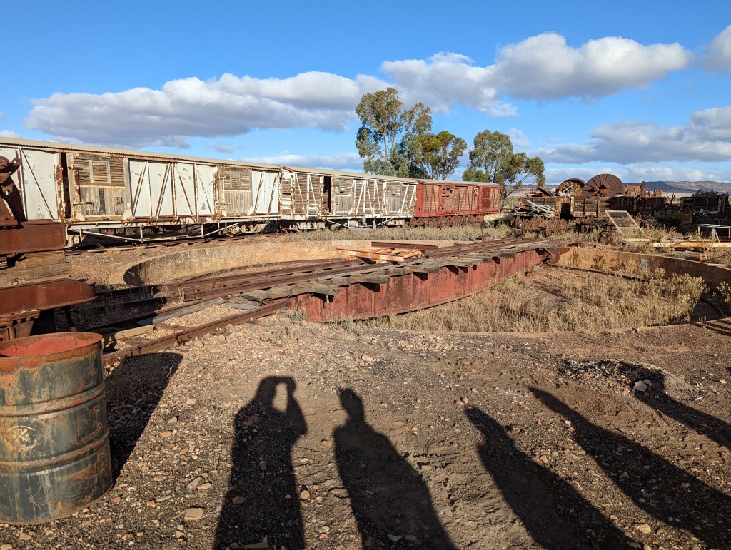 This morning we are off to Quorn, 62km away, for a ride on the Pitchi Ritchi Railway from the old Quorn Railway Station. We arrive in plenty of time & have a look around the station & chat. Unfortunately the steam engine we were to have pulling the carriages blew a steam gasket & had to be replaced with an old diesel, older than the steam engine. We departed on time at 10.30am in old restored railway carriages, a real rattler but a treat with 100 plus other Kimberley owners. We had the train to ourselves.
