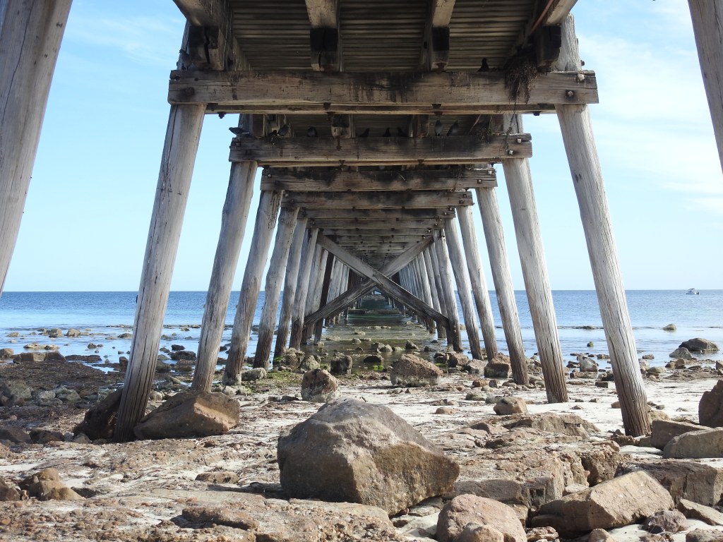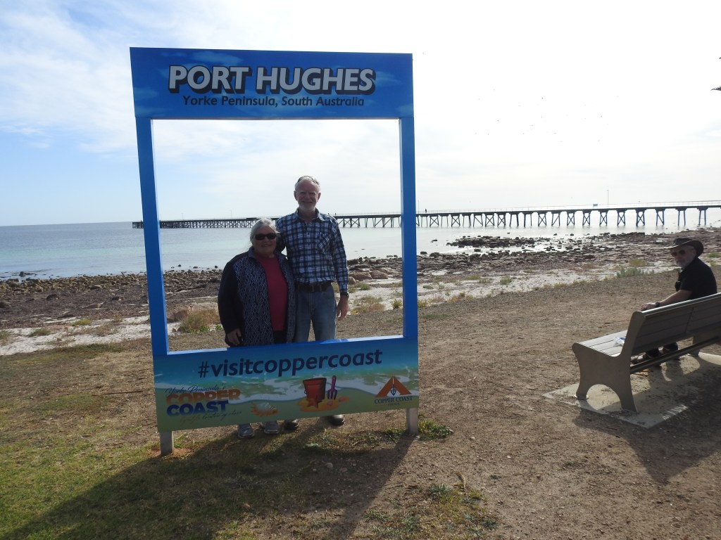 Moonta Bay is our next destination. The local council decided to do road maintenance & closed the roads that would lead us to the bay. After some driving around some streets we ended up at Port Hughes. A real treasure. There is a long jetty, if there is a jetty we have to walk out on it. There are a few people out fishing but it seems that only the Chinese family are lucky, they caught some red looking fish, we are not sure what they are, but they are excited. This jetty is apparently a mecca for catching squid, the evidence of ink stains are all over the jetty. We walked back to the Port Hughes café on the beach & for lunch sampled their freshly caught squid. Yum, it is delicious. When we are anywhere near the sea we mainly eat seafood – it is healthy, the only problem is that they always serve it with chips. Potatoes are potassium rich, so they are healthy too.
