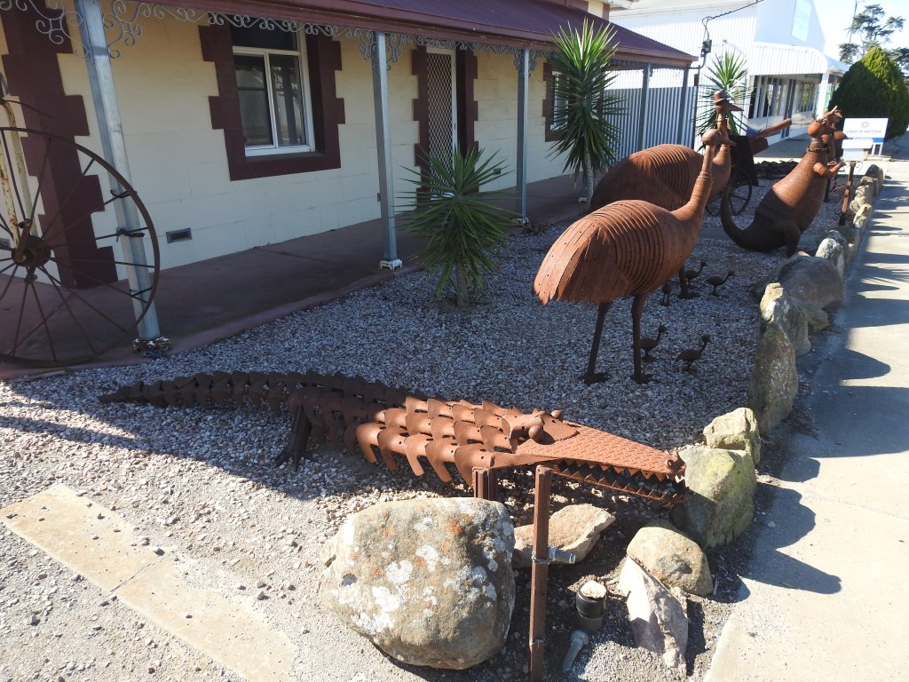 Off up the rest of the main street looking at shop windows (very few) before crossing at the nursing home & walking back down the other side, past the council chambers, in an old movie theatre building. The locals are all voting in the federal election & there are people accosting the voters on the street with the how-to-vote leaflets. Again there are some beautiful old buildings, some past their prime & others lovingly restored. Some people are proud of their gardens, others not so, it is very dry here. There is this wonderful big craft shop with lots of clever, beautiful & unusual items created by talented people from the district.