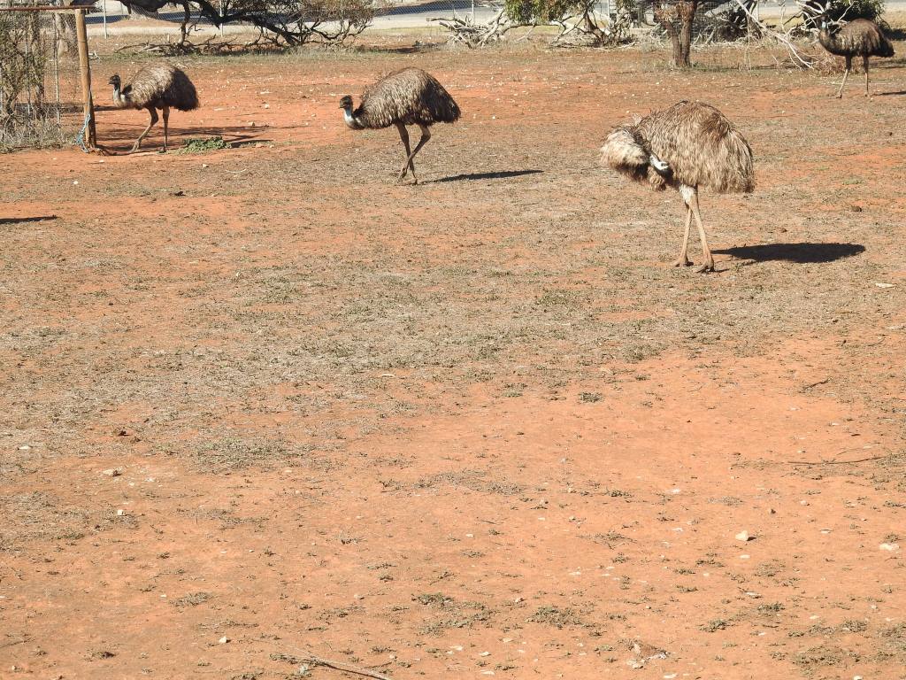 Back to camp for a nice lunch then we walk over the road to the town conservation park for a walk around & it has a gaggle of very curious emus & half a dozen kangaroos lazing in the sun. We don’t see any other animals in the compound.