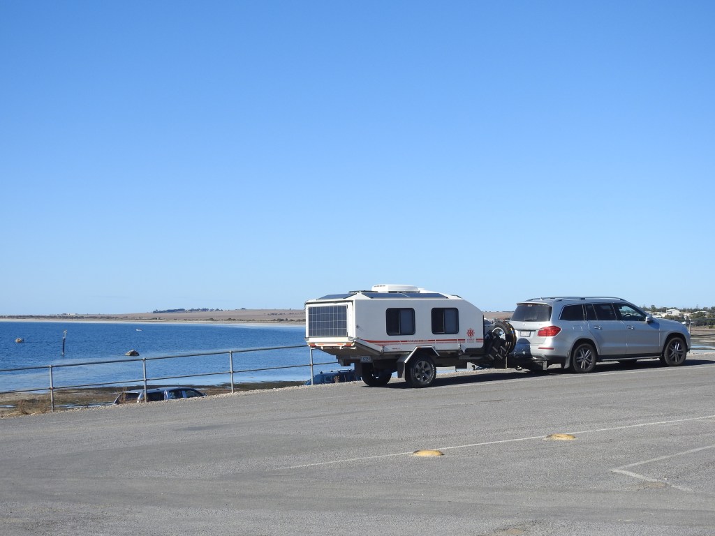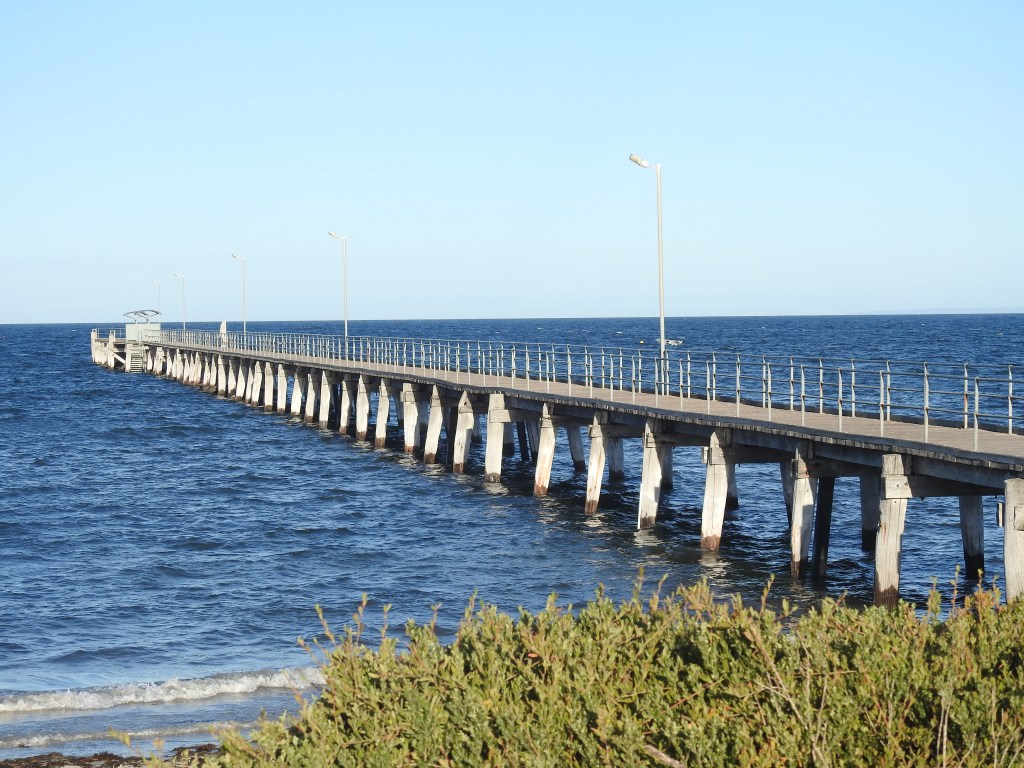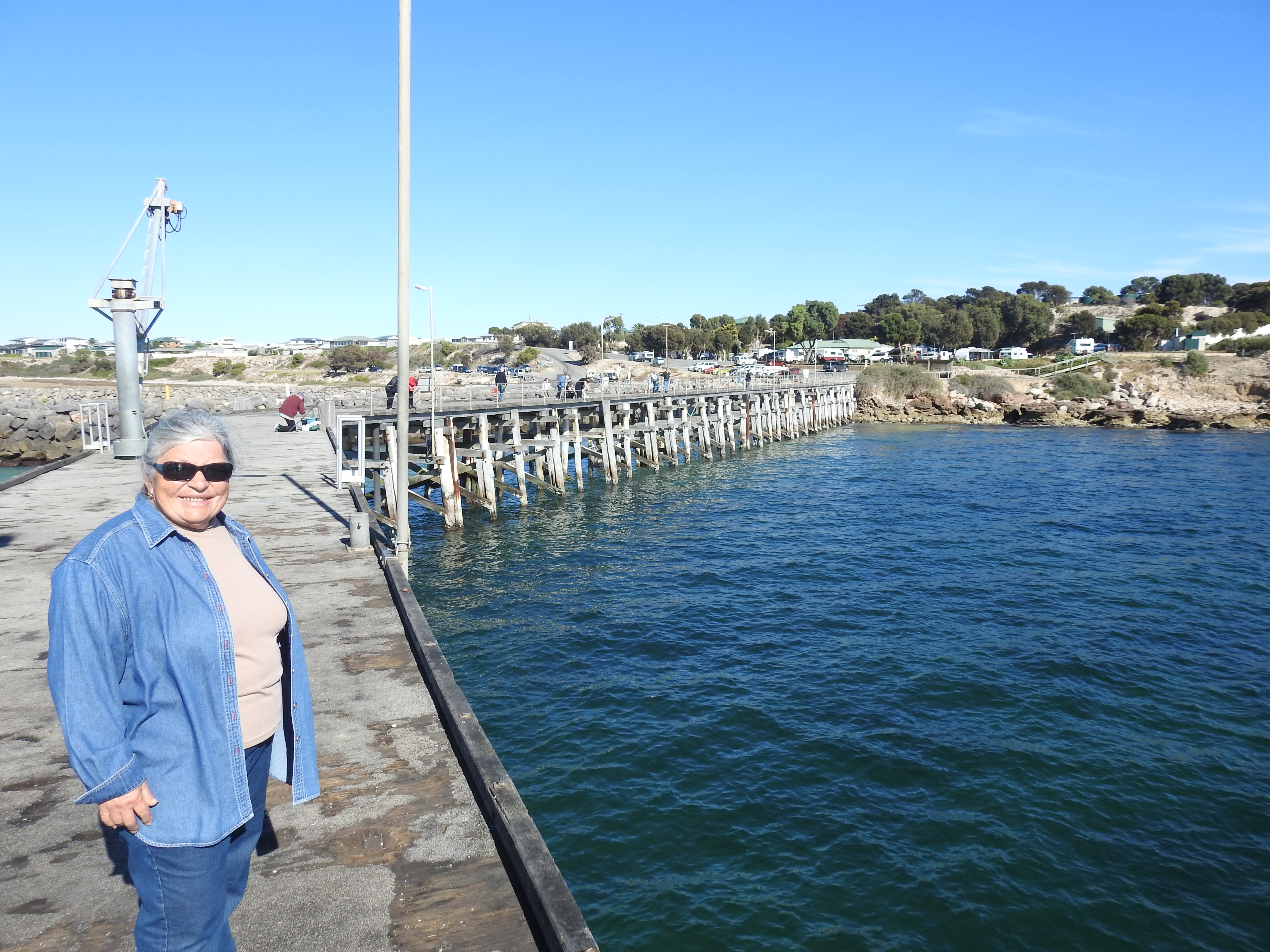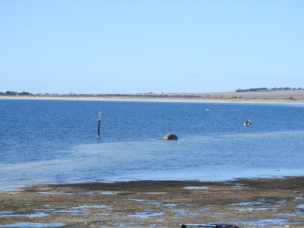 Driving south from Minlaton we took it easy, around 80km/hr along very straight & good roads. On either side vast empty paddocks, that (hopeful) will soon have barley or wheat growing in them. It is very dry here, could do with some of the rain from the East coast. It is a pleasant drive & before long we reach Point Turton, a beautiful little town (I mean very small). We drive along the ocean front road with great views out over Spencer Gulf. As we pull up at the Point Turton wharf we spot Peter & Di setting up the van in the caravan park next door so we wander over & have a brief chat & Garth is there as well, set up in a prime position looking out over the sea. Next we walk down to the wharf & walk out along it, chatting to the fishermen & fisherwomen as we walk, they are having mixed success. We are surprised at the number of houses in this small locality, most with great ocean views.