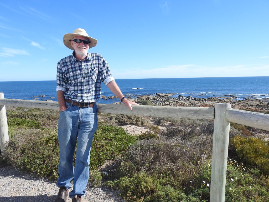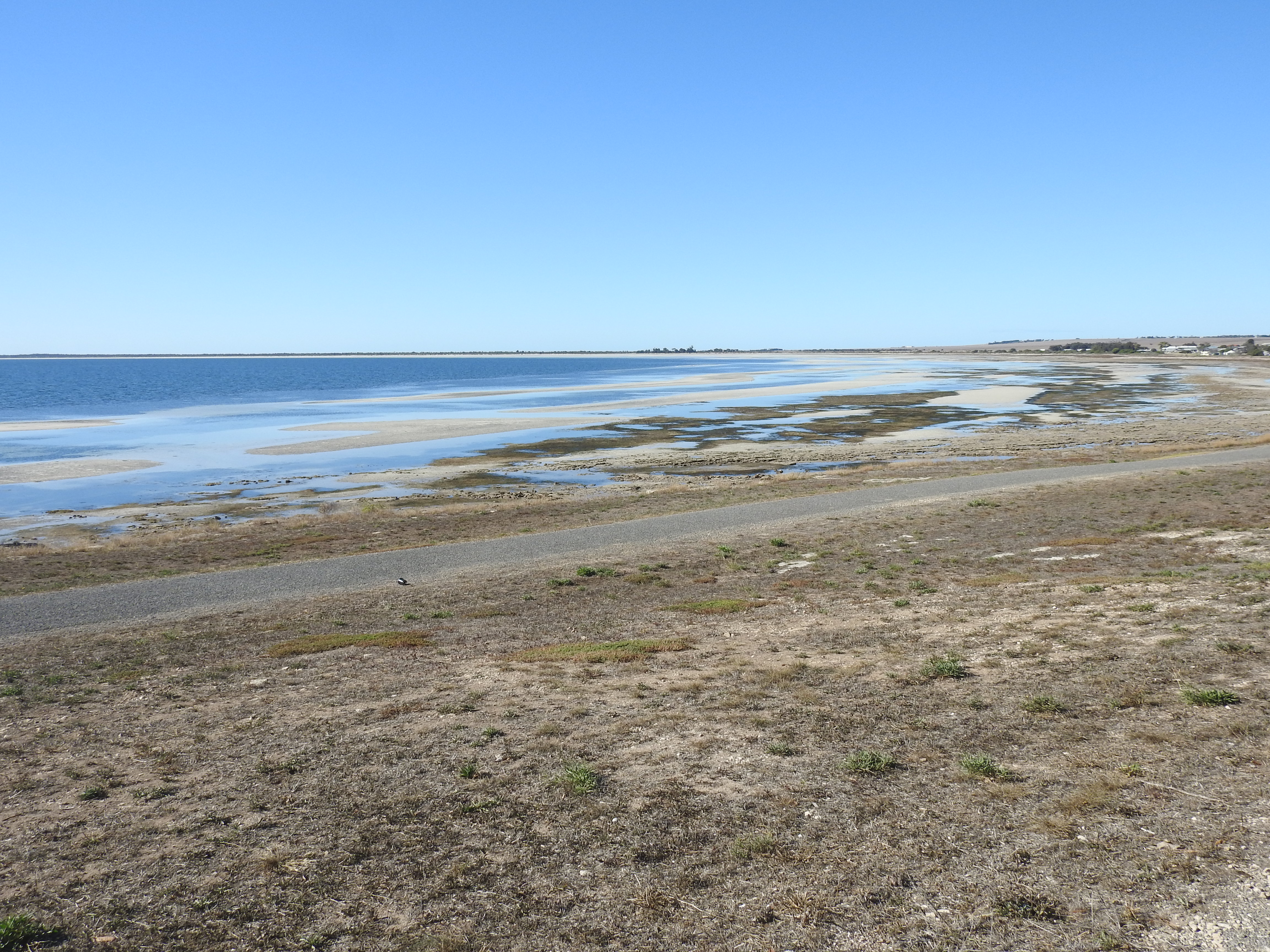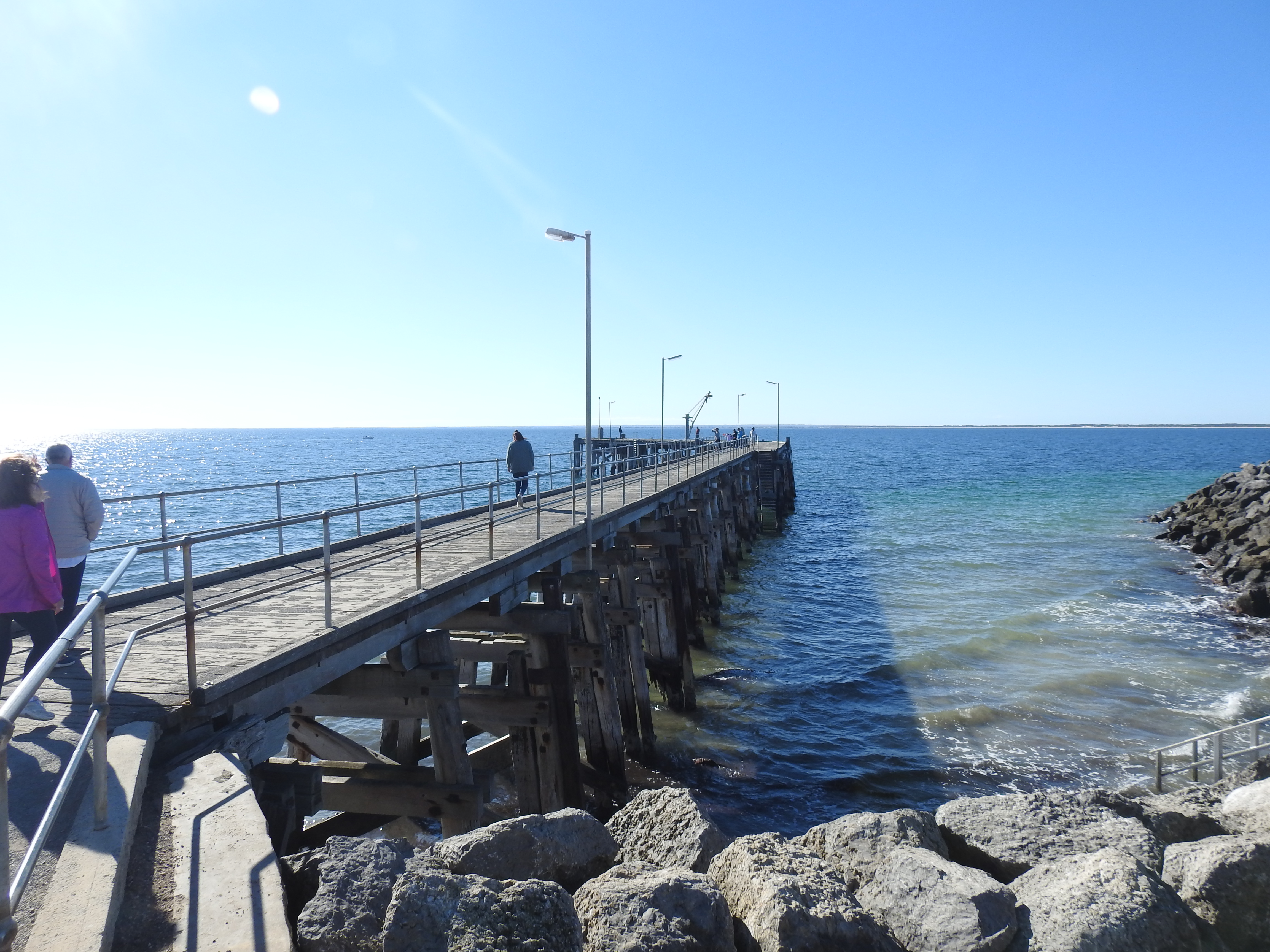 Driving south from Minlaton we took it easy, around 80km/hr along very straight & good roads. On either side vast empty paddocks, that (hopeful) will soon have barley or wheat growing in them. It is very dry here, could do with some of the rain from the East coast. It is a pleasant drive & before long we reach Point Turton, a beautiful little town (I mean very small). We drive along the ocean front road with great views out over Spencer Gulf. As we pull up at the Point Turton wharf we spot Peter & Di setting up the van in the caravan park next door so we wander over & have a brief chat & Garth is there as well, set up in a prime position looking out over the sea. Next we walk down to the wharf & walk out along it, chatting to the fishermen & fisherwomen as we walk, they are having mixed success. We are surprised at the number of houses in this small locality, most with great ocean views.