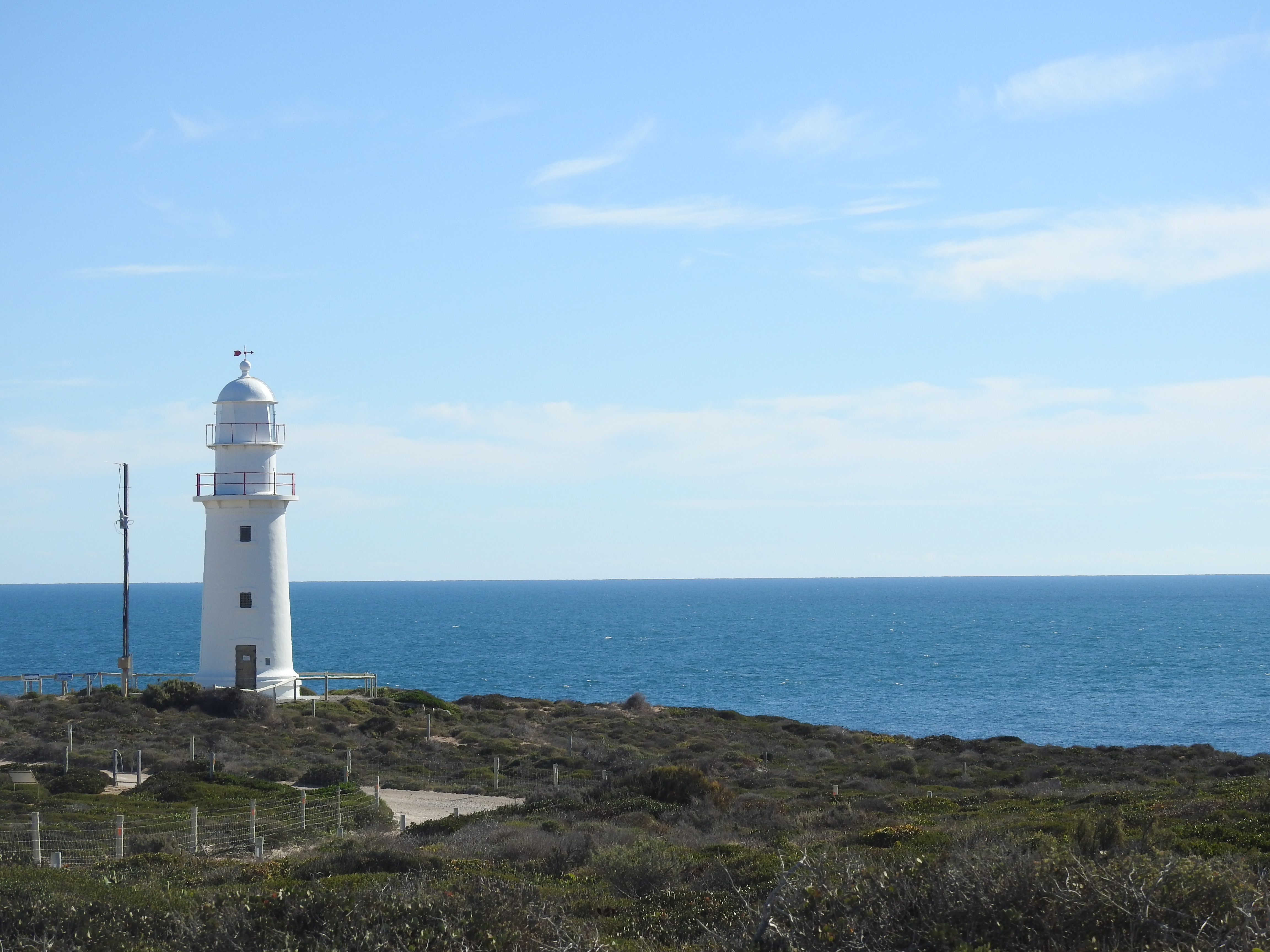 We then follow the coast on a dirt road through Point Soutar & along to Corny Point, more vast plains of cultivation on the inland side & great ocean views the other, with hardly a vehicle & with the road in good condition. From Corny Point settlement we drive out to Corny Point & the lighthouse, a silent sentinel looking out over some nearby rocky shoals. We park at the side of the road & walk out to the lighthouse about 200 metres, there must be a lot of strong winds here as a pine tree planted in the 1890s is growing very low & parallel to the ground. All the vegetation is low shrubs. The views up & down the coastline are pretty, with cliff faces as we look south & low rocky beachfronts as we look east.