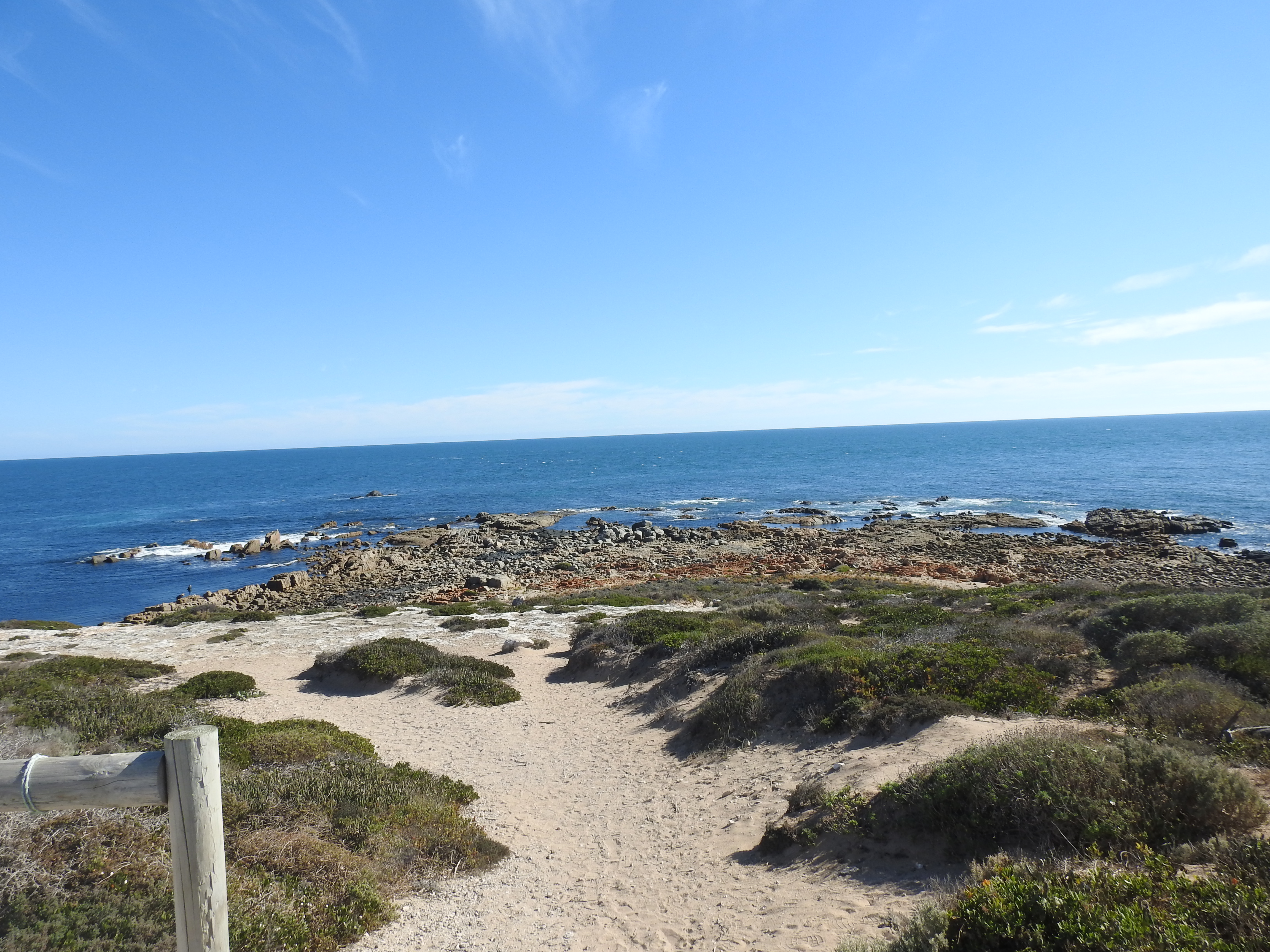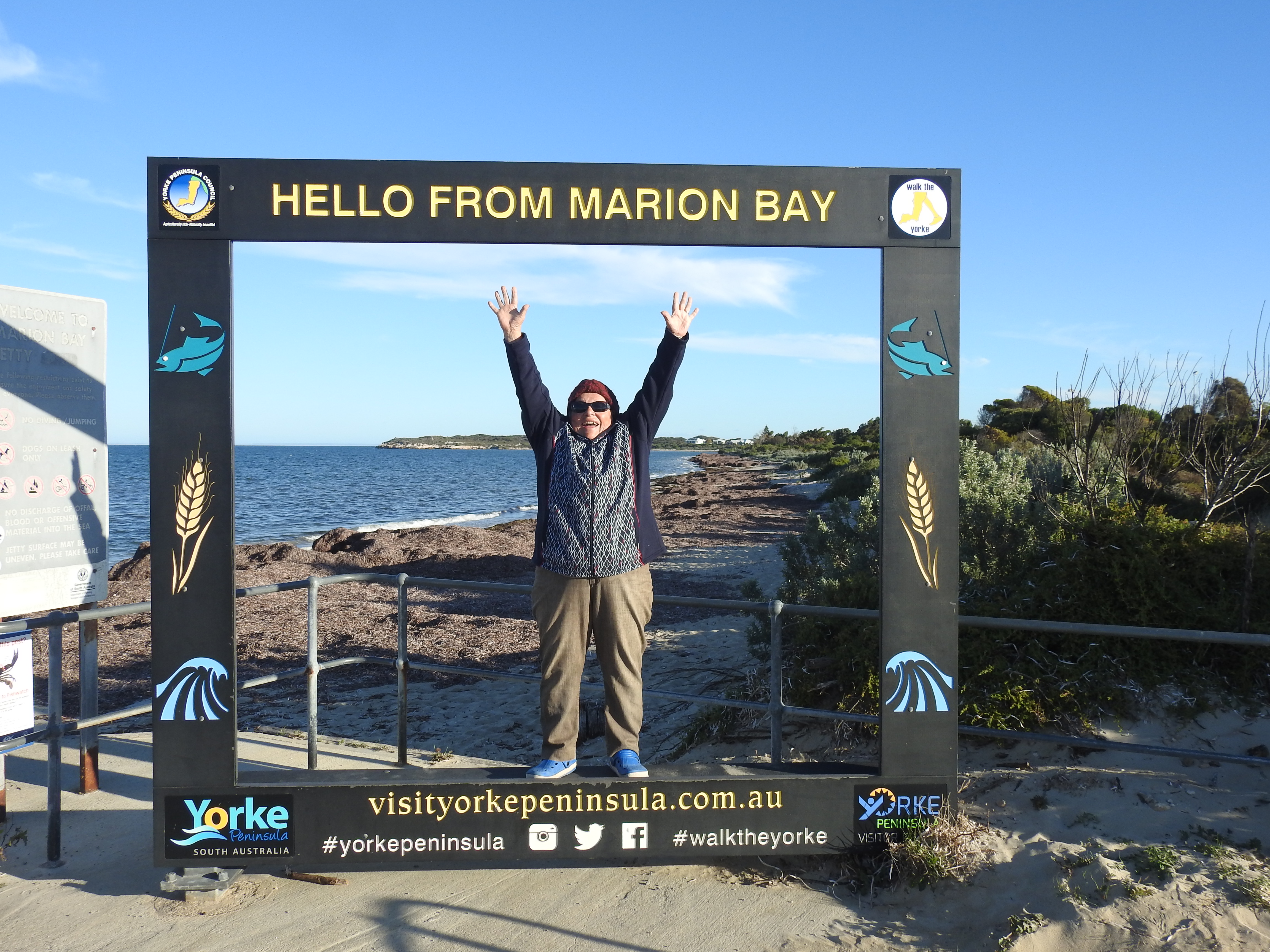 The drive to Marion Bay is on bitumen with empty cultivation fields again stretching away from both sides of the road. It doesn’t take long to reach our destination & find the van park where we set up near another Kimberely Karavan. As we are starting to set up a couple started chatting with us as they are interested in an off-road van so we showed them how it is set up & then showed them inside. Afterwards it is clothes washing time & we take a short walk over to the beach, it is cold so we head back & hang the washing out. Next we take a drive around this small town & end up at the jetty where we put our coats on & walk out to the end of the Marion Bay Wharf. There are huge piles of seaweed heaped on the shore, more than a metre high, as far as we can see in both directions along the beach. There must have been very strong winds recently.