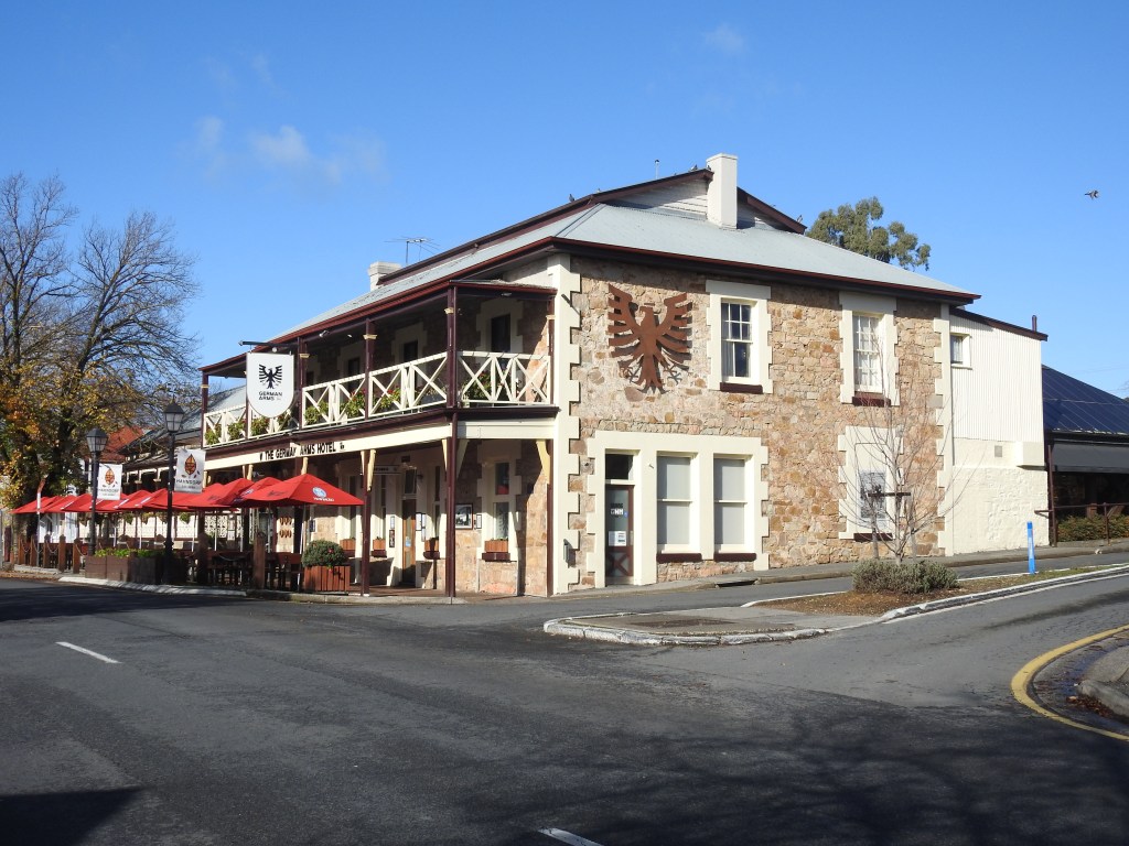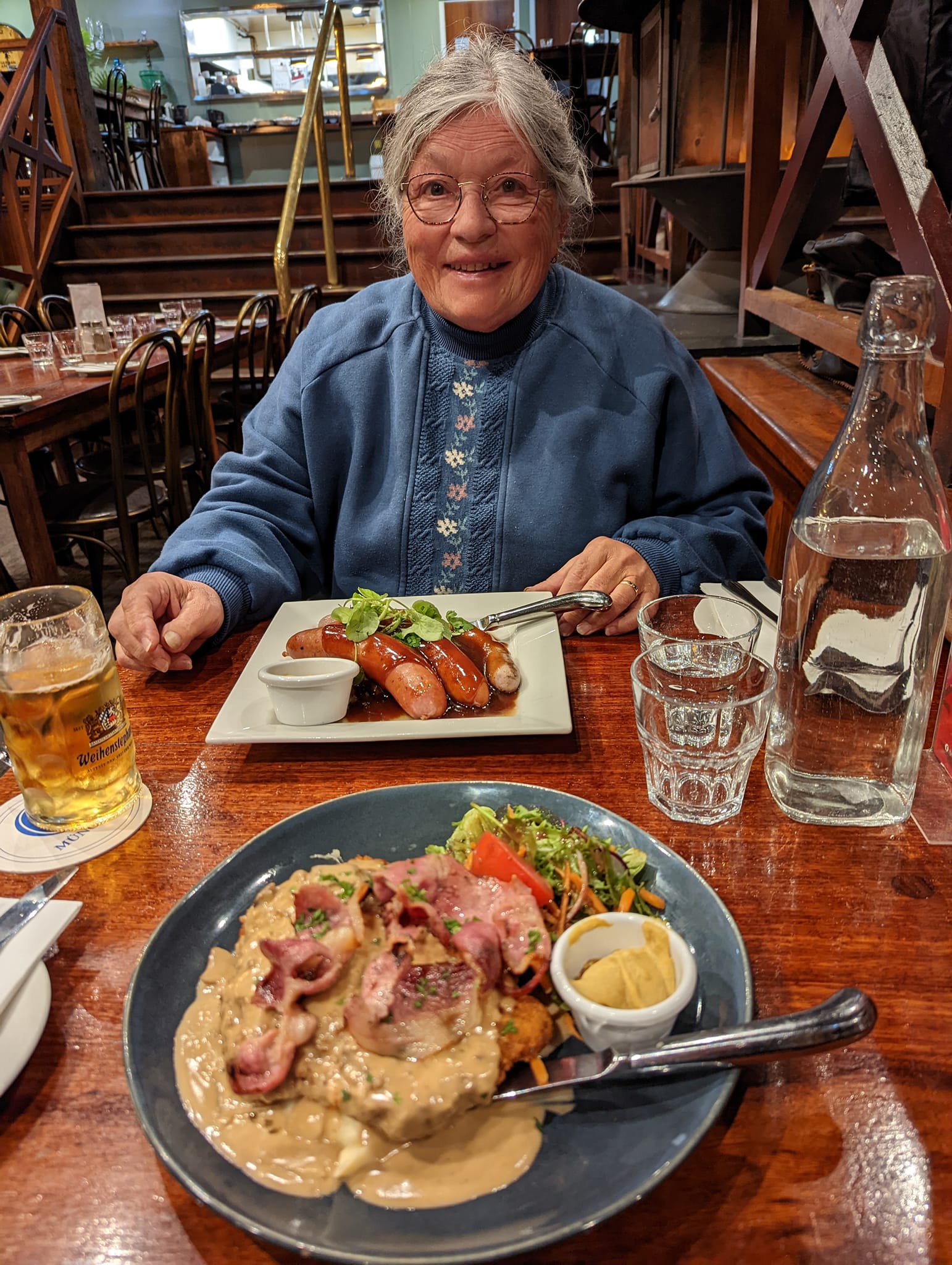 Back to Hahndorf enjoying the drive through the countryside again. I had a video conference again. Afterwards it was time for dinner at the old German Arms Hotel & some German style meals washed down with a beer from Munich in Germany. Tereza had a selection of German sausages with sauerkraut & I had pork Jaeger schnitzel with sauerkraut, both very nice & very filling. Back to camp after another great day.