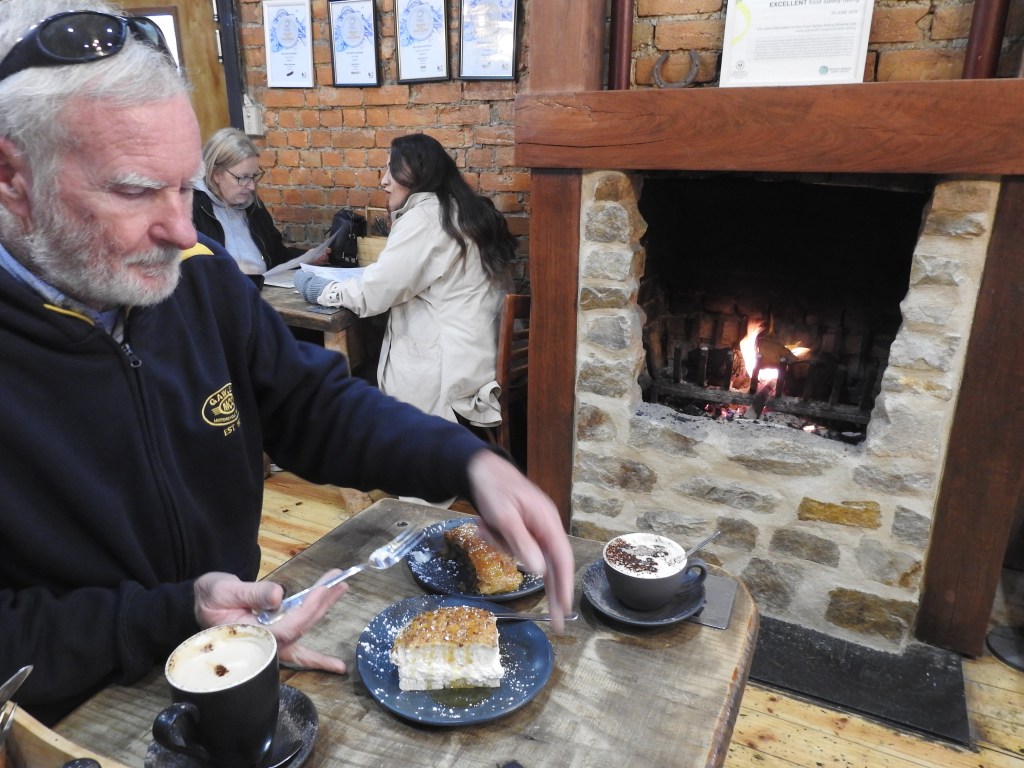It was cool & sunny with blue skies first up for our walk around Hahndorf village. The old town is built along the road & it is a fair walk from one end to the other with many old stone buildings converted to shops, cafes, bars, restaurants, boutique accommodation etc. There is a real eclectic mix of businesses. The old buildings are mostly well looked after & restored, with a real old German look. After our walk we have morning tea & warm up next to the fire with a German Beesting & apple strudel.