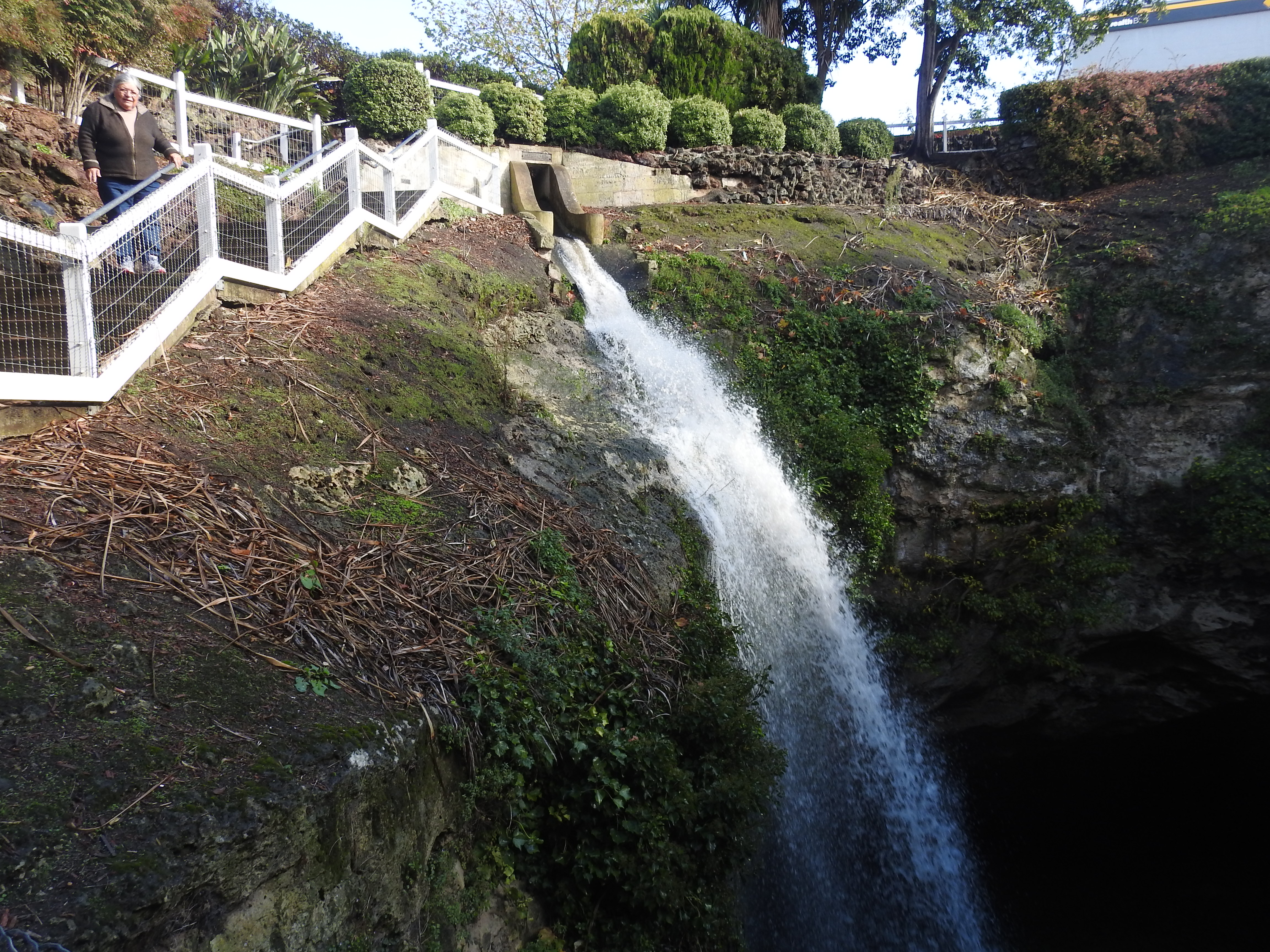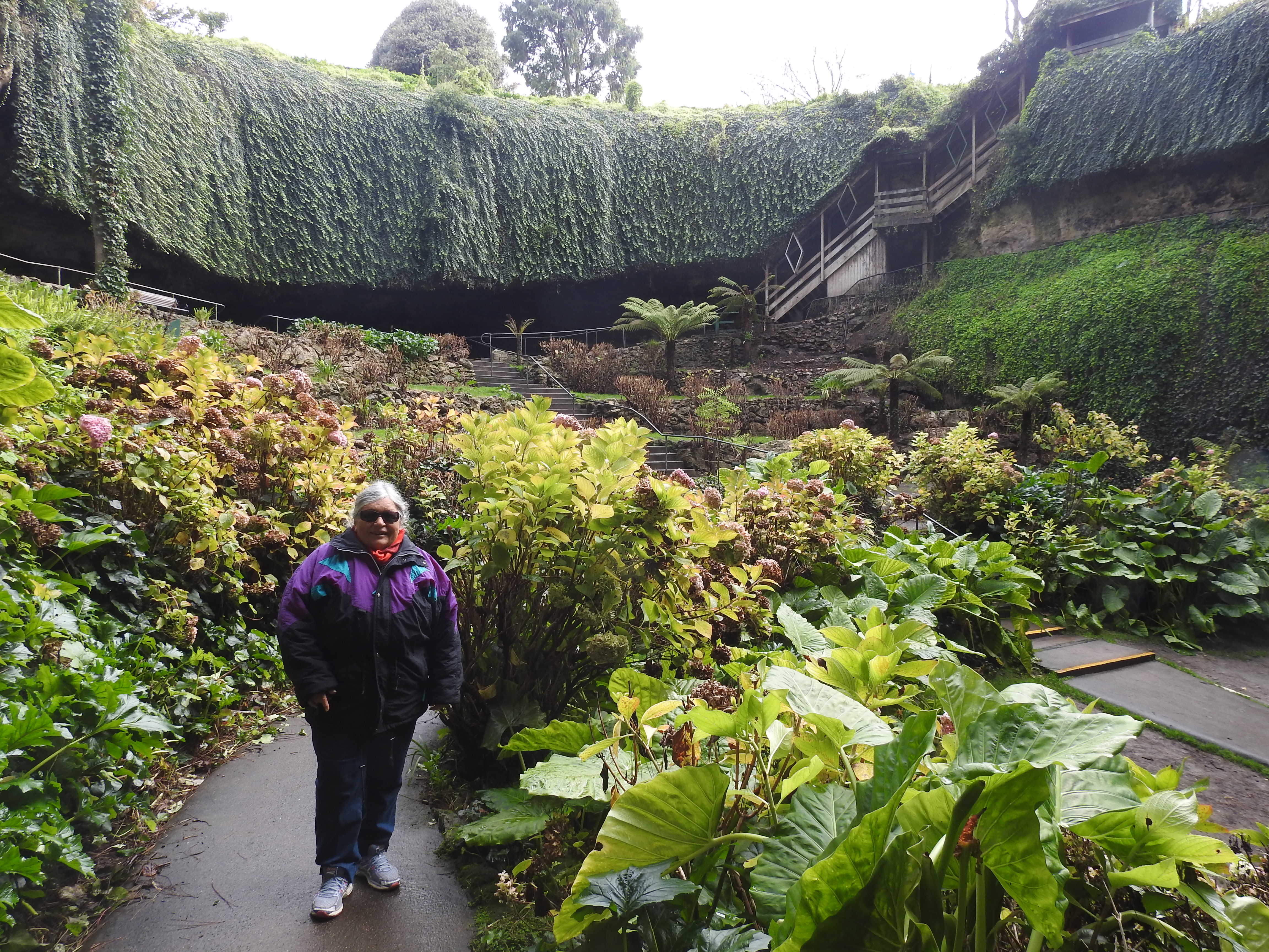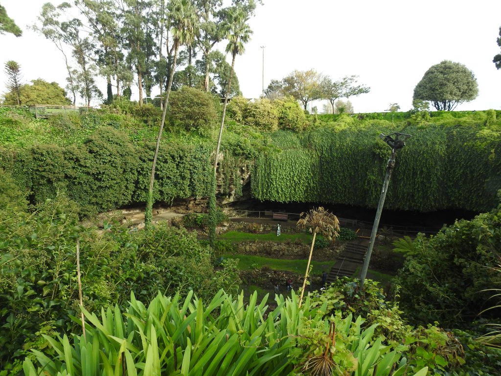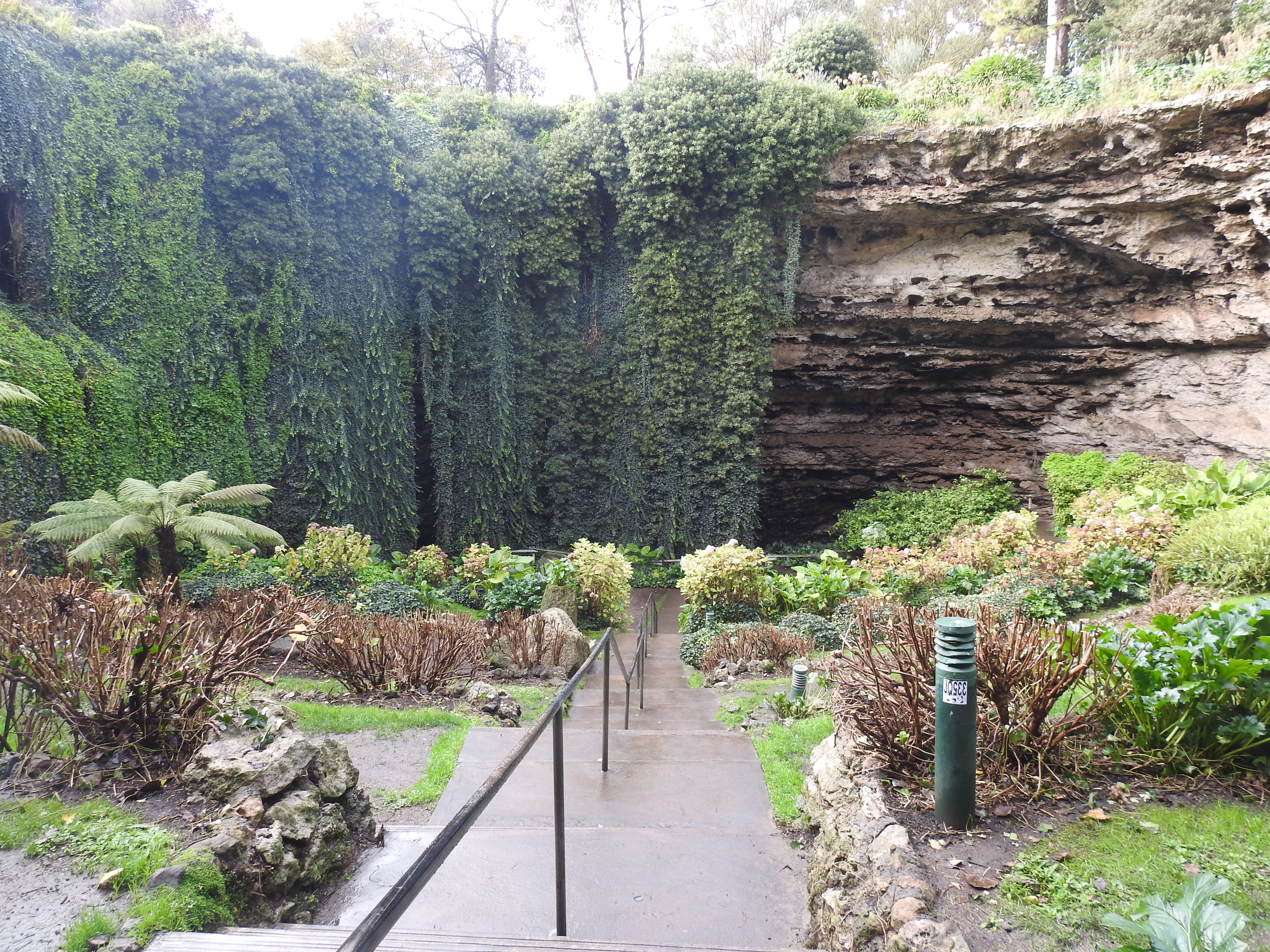 The Umpherston Sinkhole in Mount Gambier is a large limestone sinkhole that has been made into a garden, initially in 1886. The sinkhole has a lot of steps down into it & is terraced at the bottom. Thankfully the sun is out & the rain has stopped when we get there so it is a more pleasant experience. It is winter so there are no flowers & the plants have recently been pruned, we can only imagine what it would look like in flower in summer. There are masses of ivy hanging down from the sinkhole edges providing a green curtain for the sinkhole walls. We spend a good hour looking over the Umpherston sinkhole before moving on.