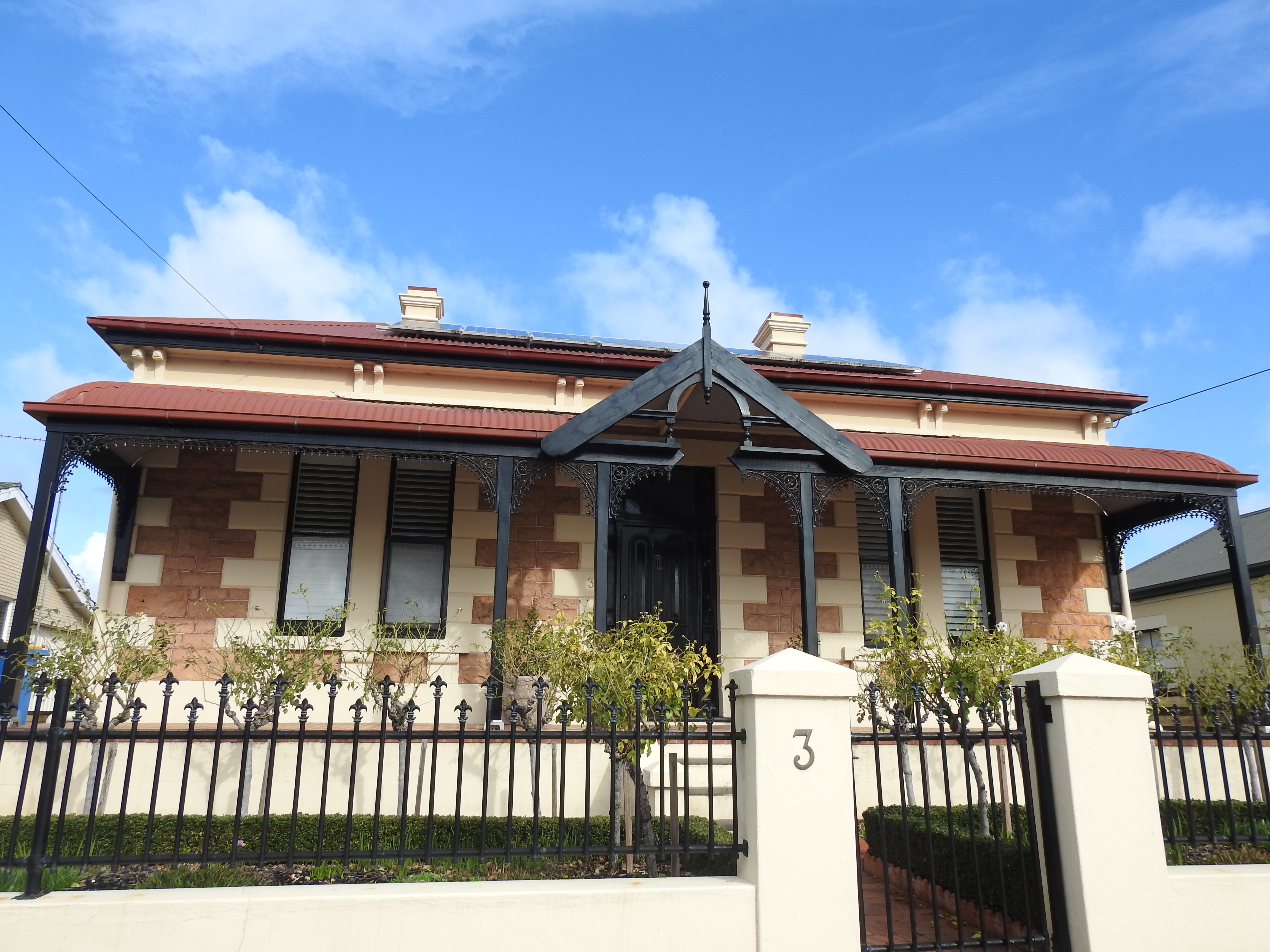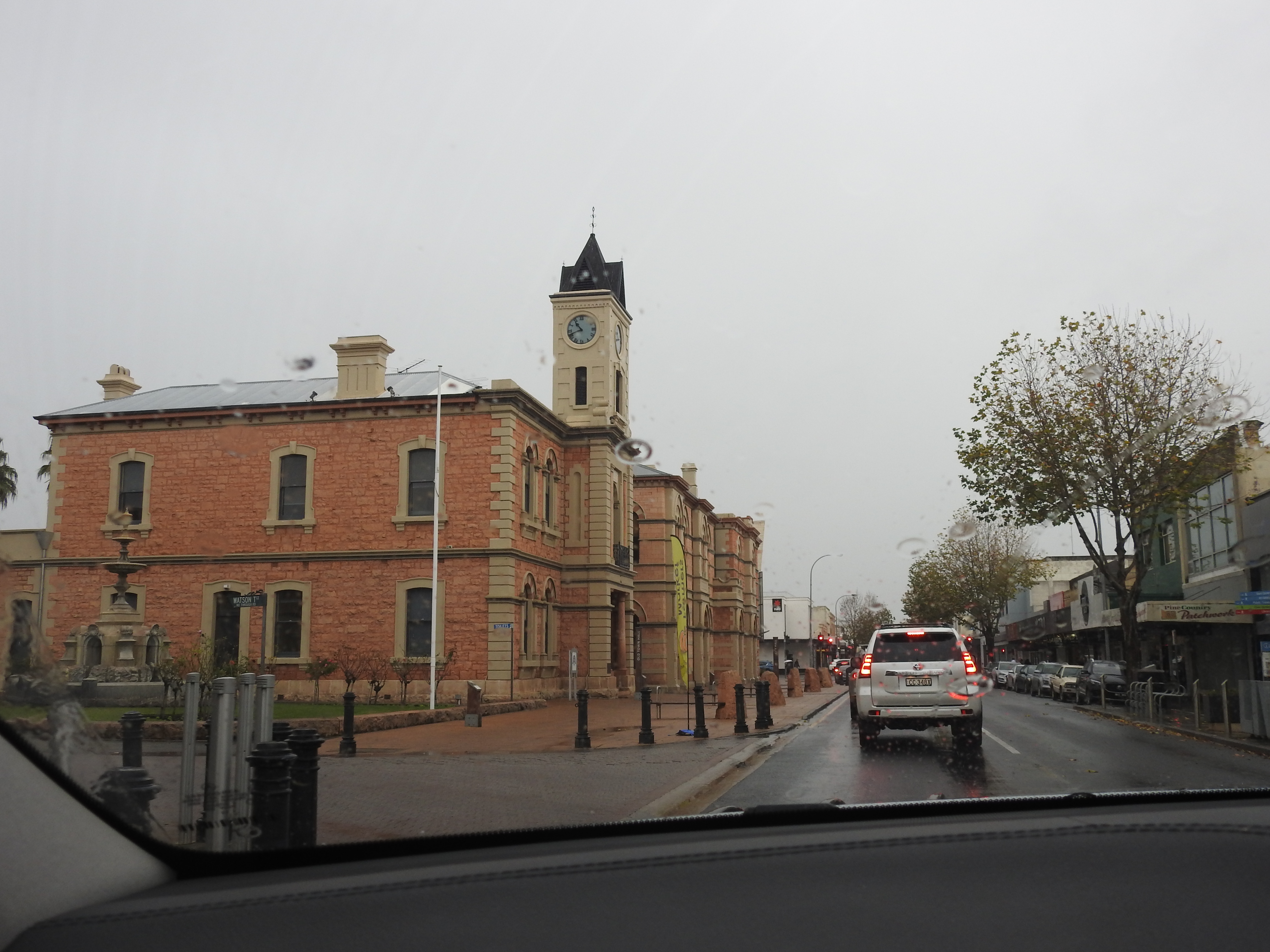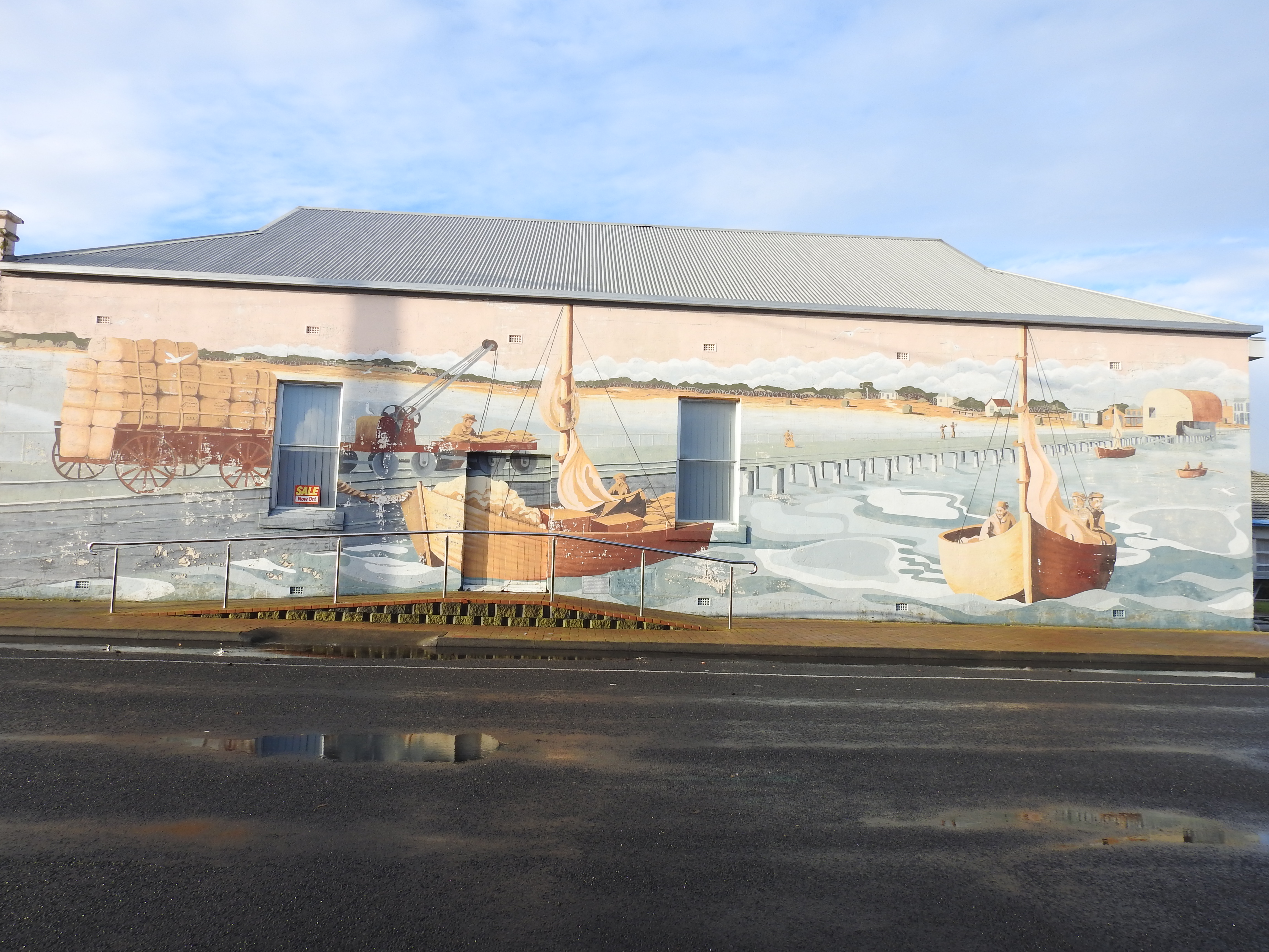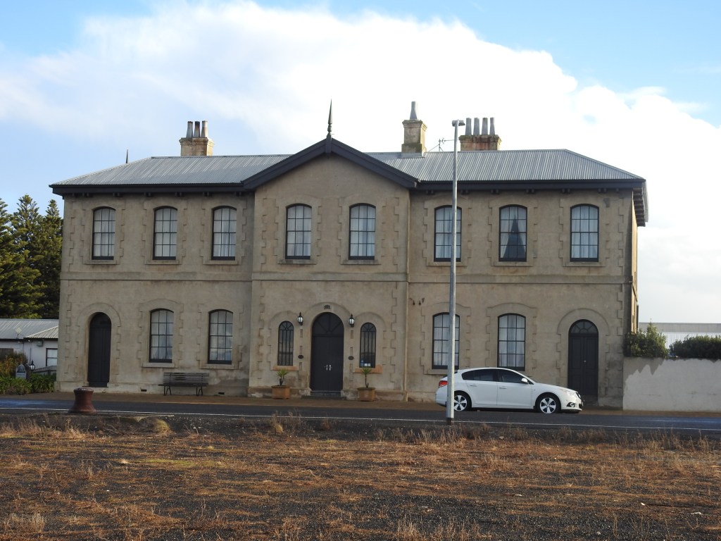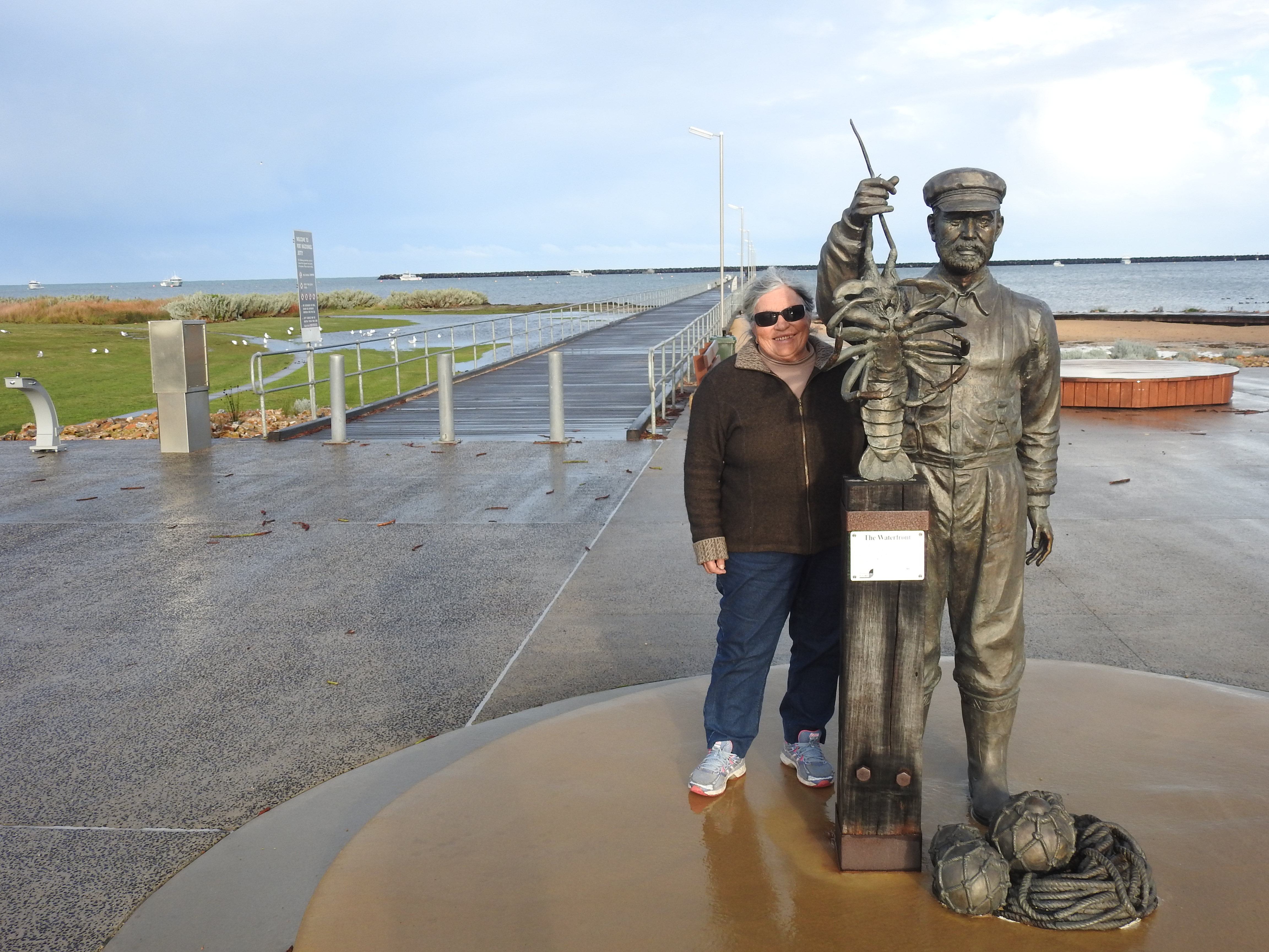 Back in town we get out & have a look at the jetty & read some of the town history up on billboards under the picnic shelter, the tide is in as the water is right up to the boards on the jetty. We decide not to walk out on it, we are cold enough as it is. There is a good sculpture of a cray fisherman at the start of the jetty. The main street of the town is small, though the combined old police station, courthouse, post office, gaol & customs house built in 1863 is very impressive.