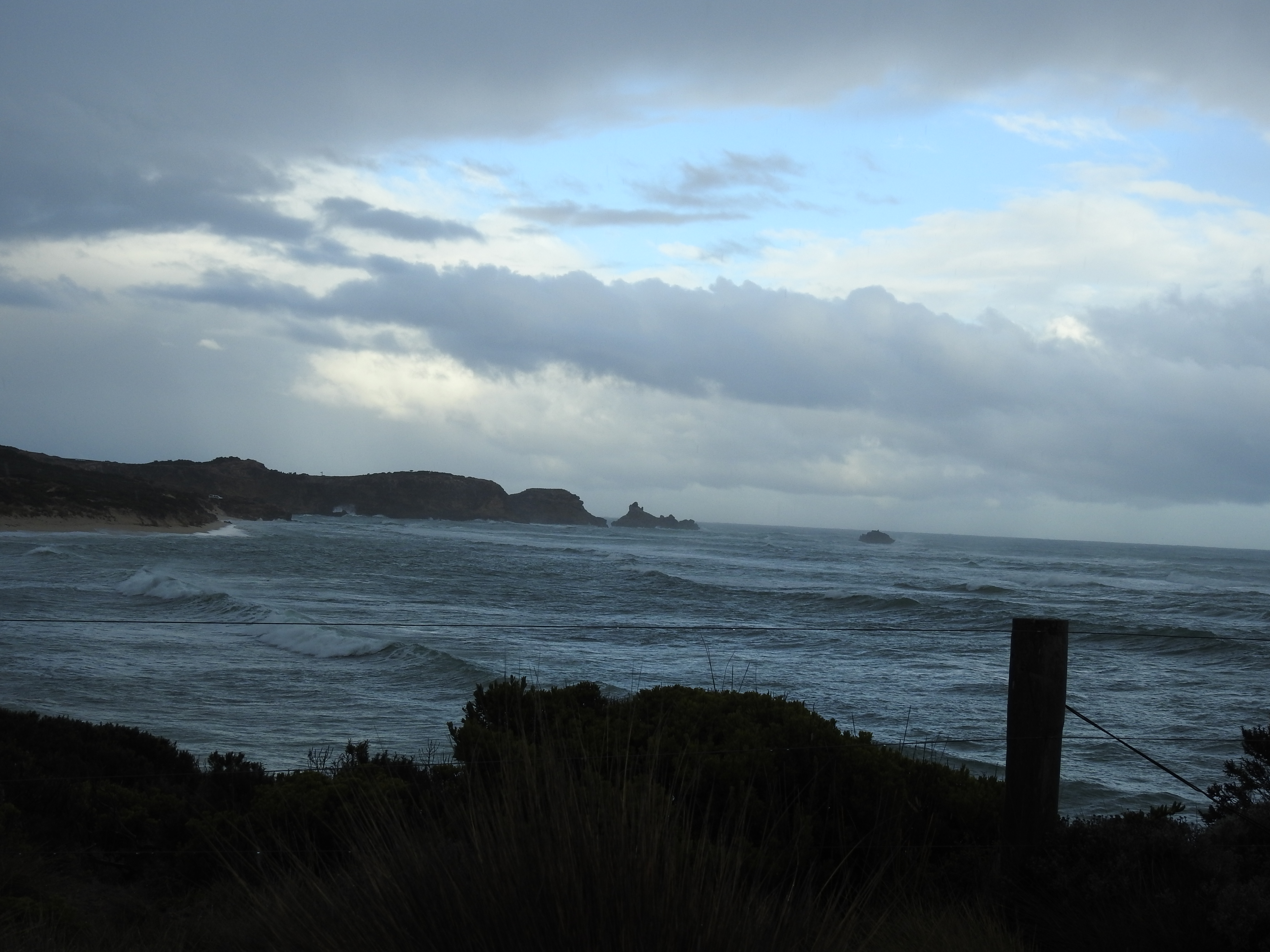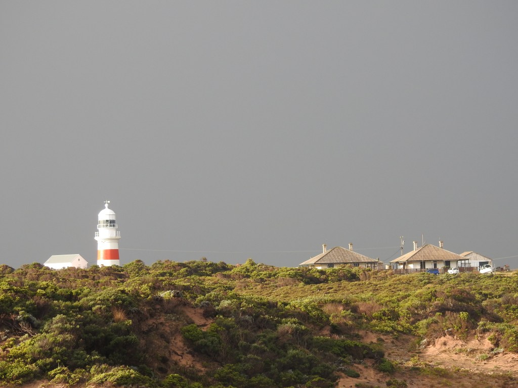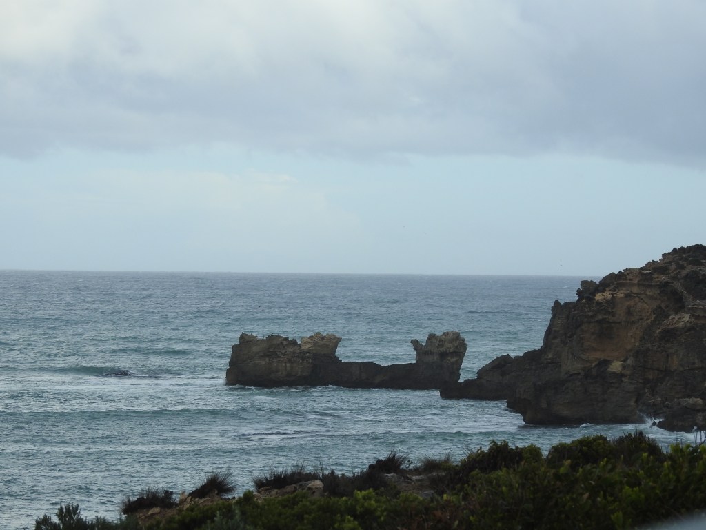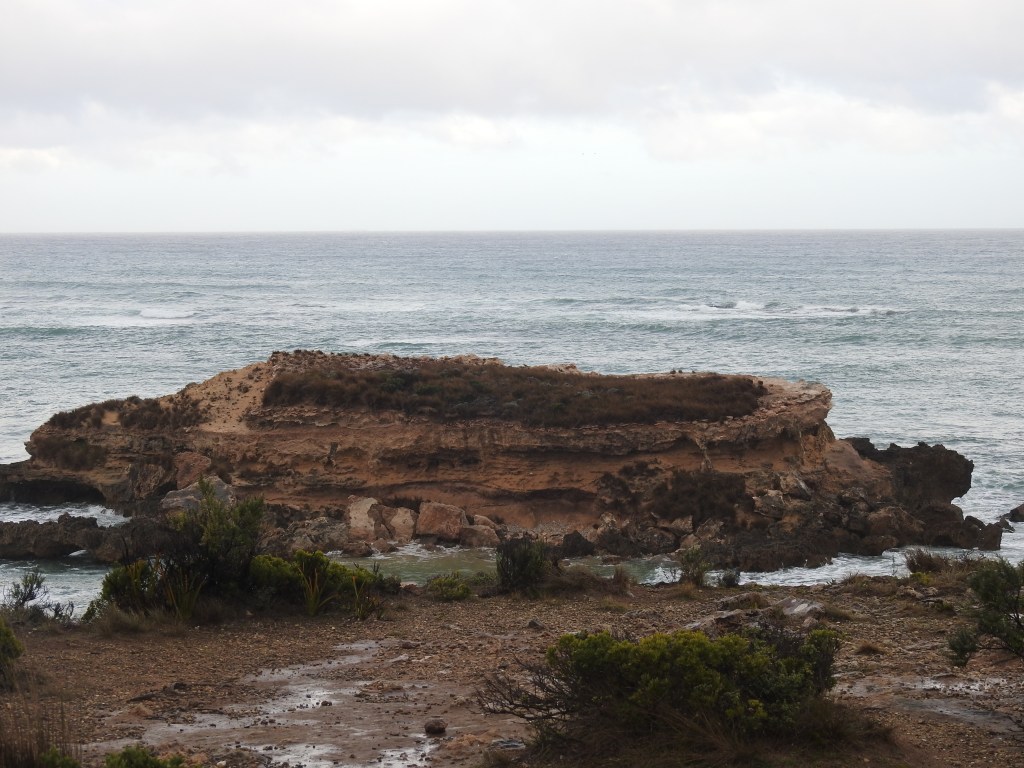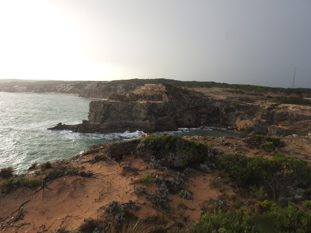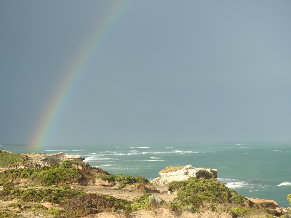 It starts to rain again as we drive south to Port Macdonnell & we stop at Mount Schank for a look, this is another volcanic crater mountain that was formed around the same timeframe as Mount Gambier. It just sticks up out of the surrounding plain. Port Macdonnell is a small fishing town hugging the coastline with a focus on crayfish during the season. We drive north along the coast on the Coastal Scenic Drive & it is very scenic. We are reluctant to get out of the car as it is cold, windy & raining, however, we still manage to soak in a fair amount of the scenery. At Cape Northumberland, the southernmost tip of South Australia I do get out as the rain stops & go up to the lookout. Big mistake, it then started to sleet so I was getting hit in the face by cold & hard sleet that hurt. I ended up wet & cold by the time I managed to get back into the car. As we drive back to Port Macdonnell the sun comes out & we are treated to a rainbow.