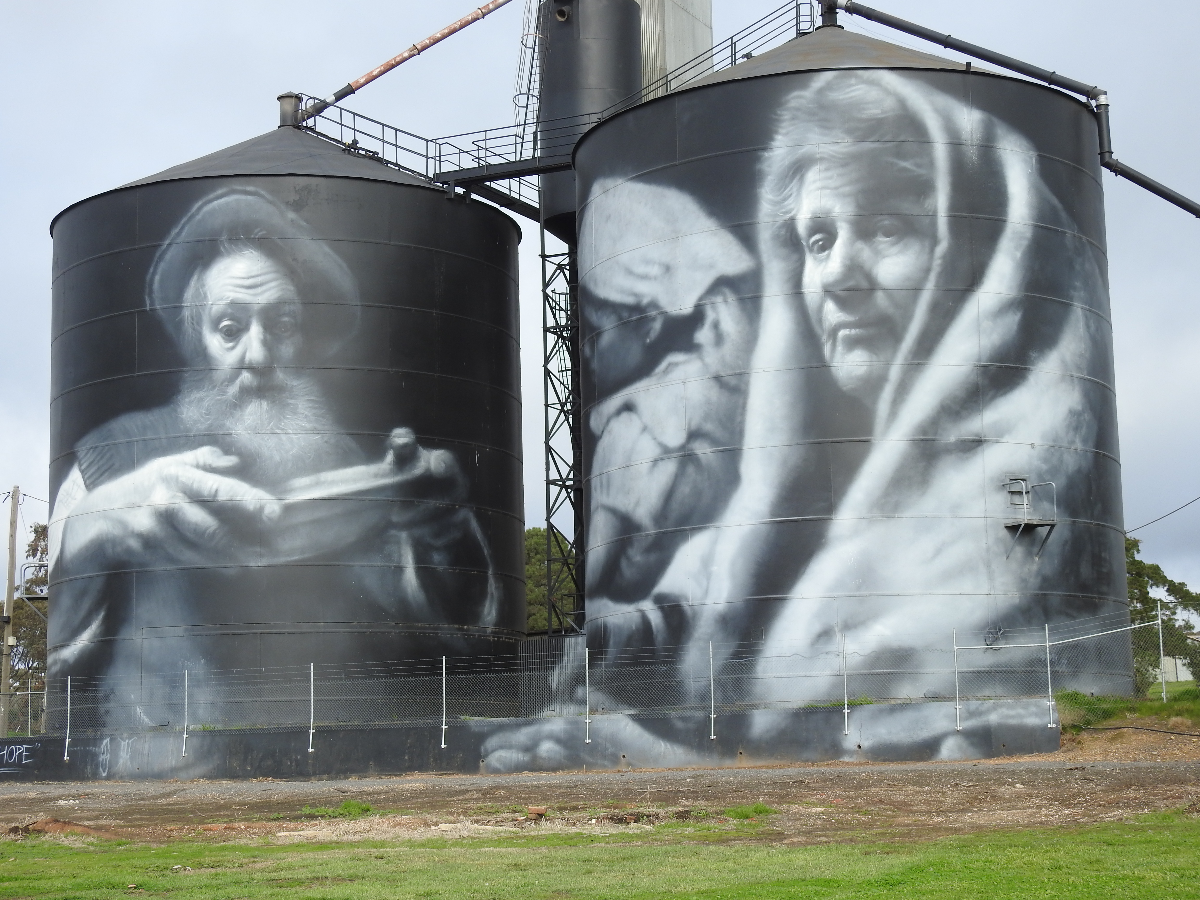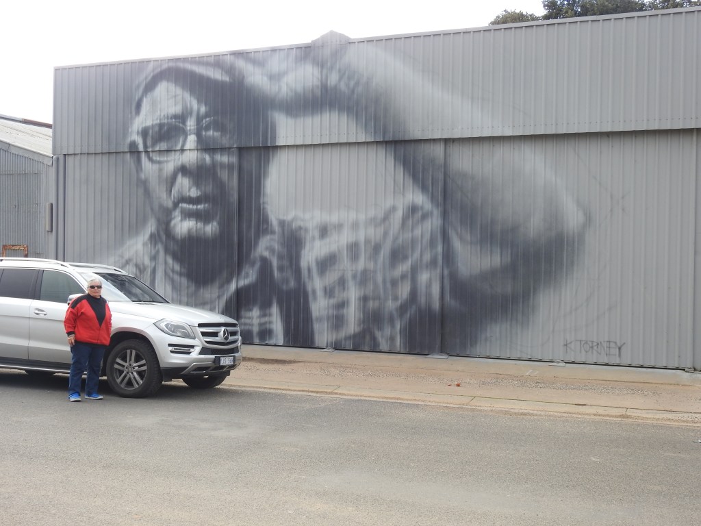 St Arnaud is the next big town & we stop to have a look at the silo mural art, again this is very good, the artists are amazing with their use of spray paint. After Logan we turn off to Inglewood & travel a lot of one lane bitumen road through some very isolated countryside. It is very pretty hilly country that is lightly forested & fortunately we did not meet too many cars coming the other direction as we had wheels off on the dirt on the side of the road when we had to pass each other. After Inglewood the road was narrow again until the turn-off to Serpentine. After Serpentine we travelled on narrow one lane roads again across the backblocks of country Victoria. Thank goodness for GPS. The roads are now flat & very straight with sheep, cattle & crops on both sides.