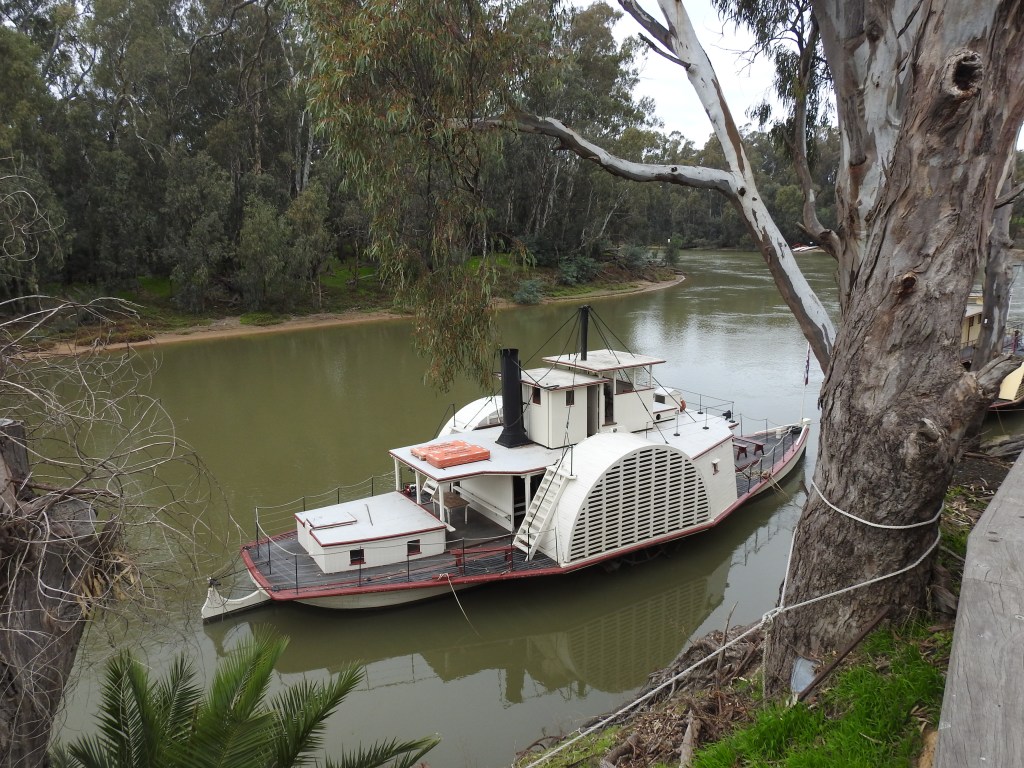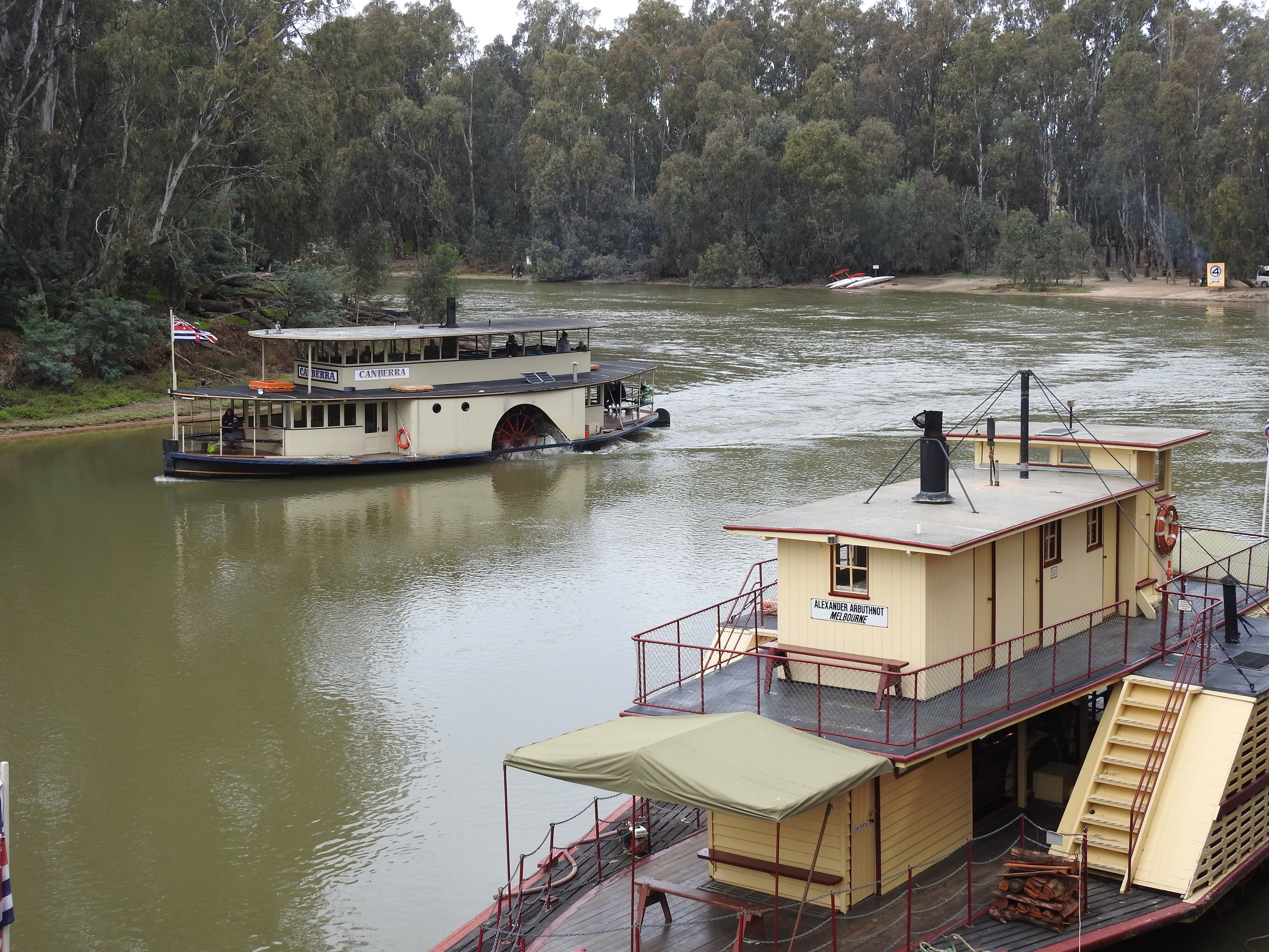 In Echuca we can only stay in the caravan park if we book in for three nights because it is a long week end. We luck it into the Rotary overnight camping spot next to Campaspe River, no electricity or toilet/bathroom facility, but our caravan has it all. We set up then head into town. We park outside the Beechworth Bakery & decide to have a late lunch (once again it is after 2pm) pies & coffee again. After lunch we walk along the old main street & come to the Echuca historical wharf area where the old paddle steamers operate from. We walk through the museum & then out onto the old wharf, where we see the old paddle steamer “Canberra” rounding the bend in the river with the paddles churning the water & the steam engine chugging away. The boat whistle blew a few times as it turned to berth at the wharf. We also had a look at the steam engines on display & operating at the old sawmill site out the back of the museum. Back to camp & I attend to a few bills & Tereza goes for a walk along the banks of the Campaspe River taking a few photos of the river & having a chat with some of the fellow campers. We drive back into town for dinner & find a park outside the Echuca Distillery, they specialise in distilling gin. We had a look at the menu in the window & decide to go in & try even though neither of us drink gin. We order roast duck & also pork belly bites with a taster of 3 types of gin. The food is absolutely delicious & the gin is tasty. We also order an affogato for dessert, again delicious. We are surprised that there are not that many customers. Another great day.