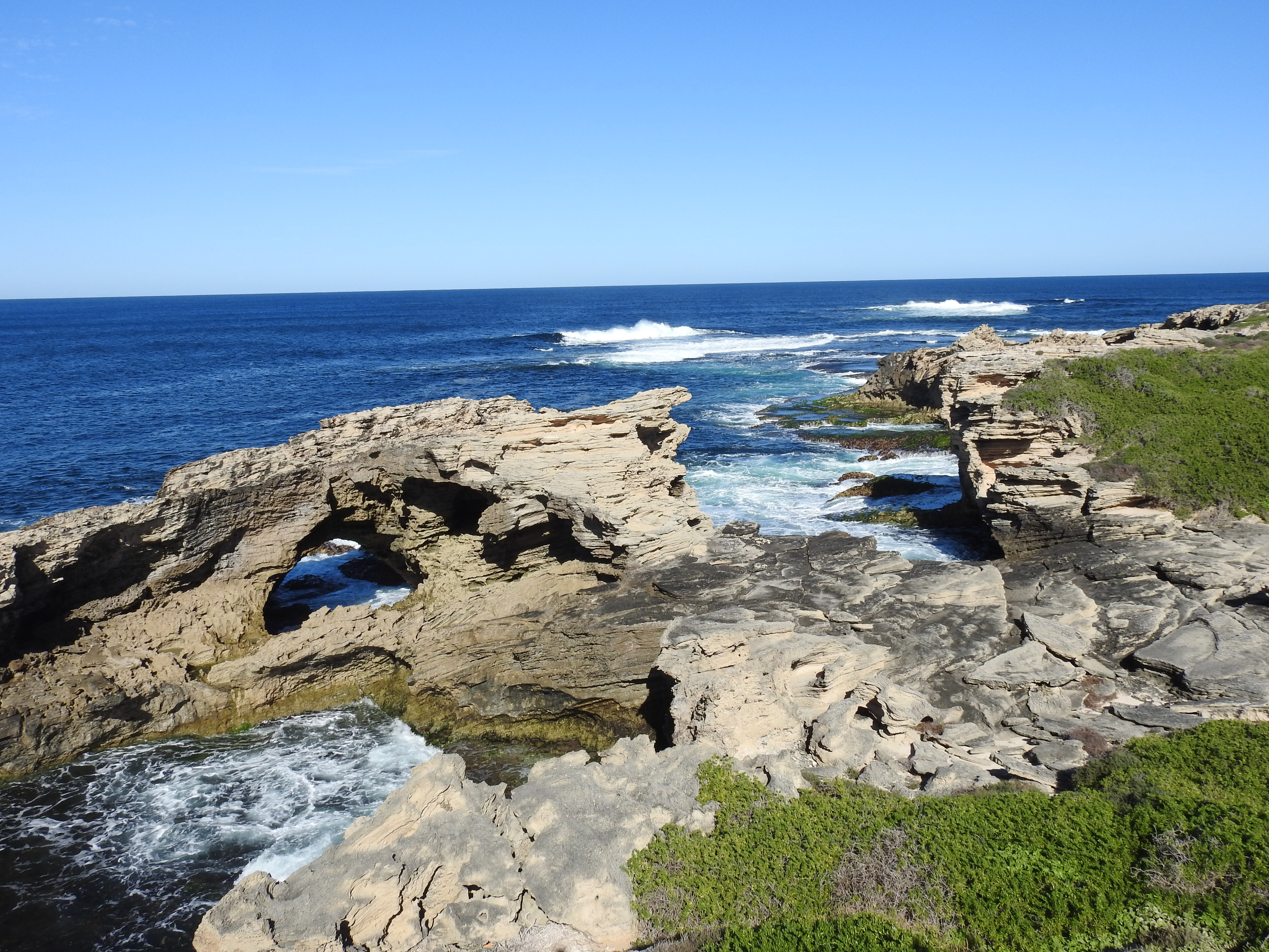 Another early start & breakfast at 7am at the Lontara, part of the Samphire Resort, we enjoy a table in the open air with the sun warming us as we eat. We catch the hop-on hop-off bus at 9am & enjoy the views as we travel the 11km to the West End where we stop for a walk along the boardwalk at Fish Hook Bay at Cape Vlamingh. With the sun out today the scenery has totally changed, the colours of the ocean are amazing & it is very pleasant enjoying the views. At Fish Hook Bay an Osprey has a nest, a large pile of sticks on a rocky outcrop over the ocean. Next to the boardwalk is an anchor from a boat wrecked here in 1984, a Japanese tuna boat, the Kiryo Maru.