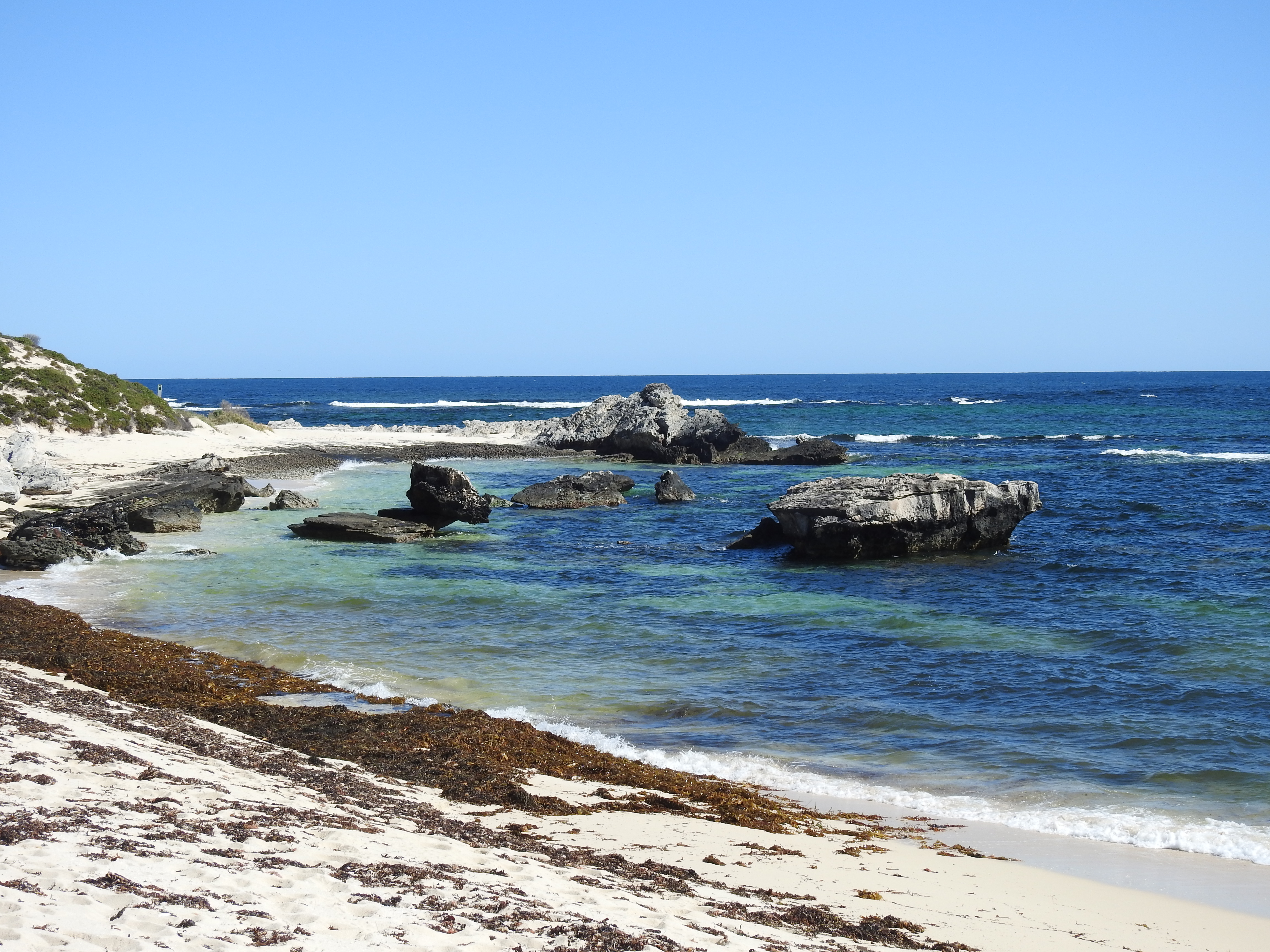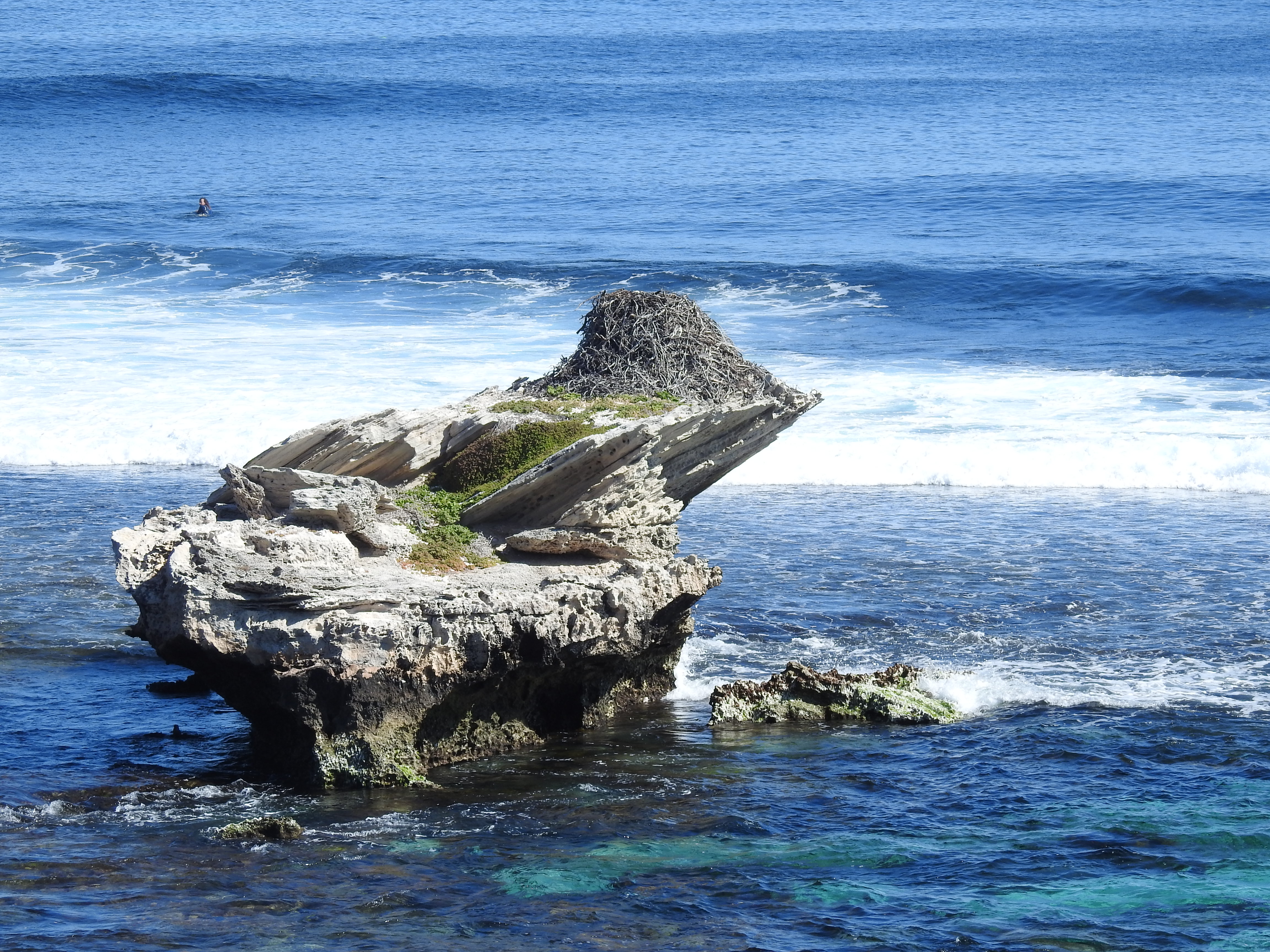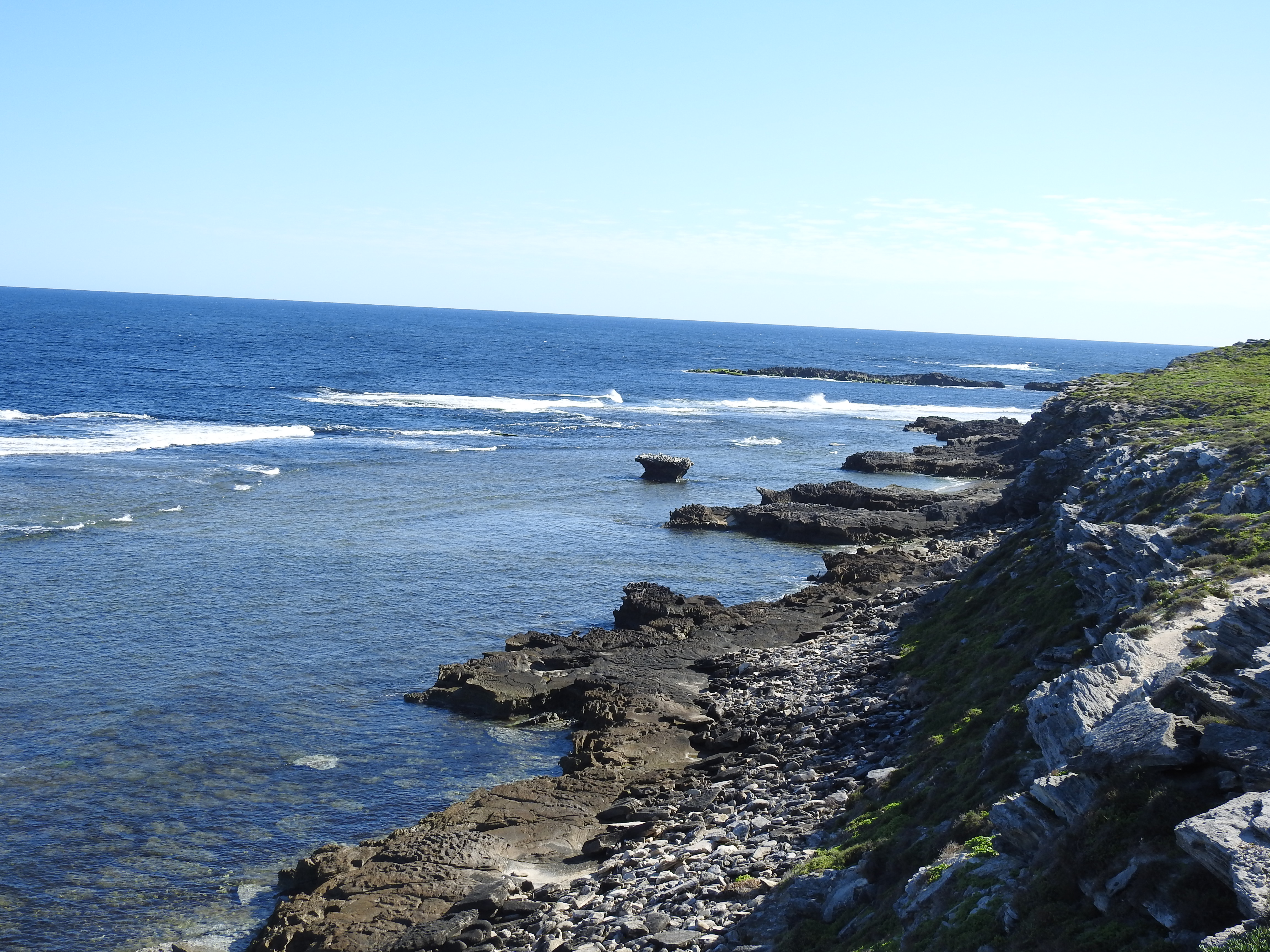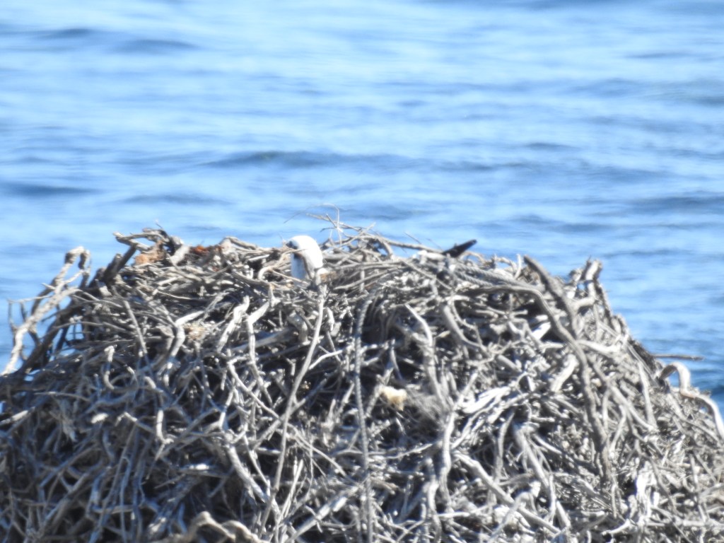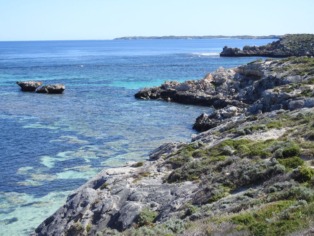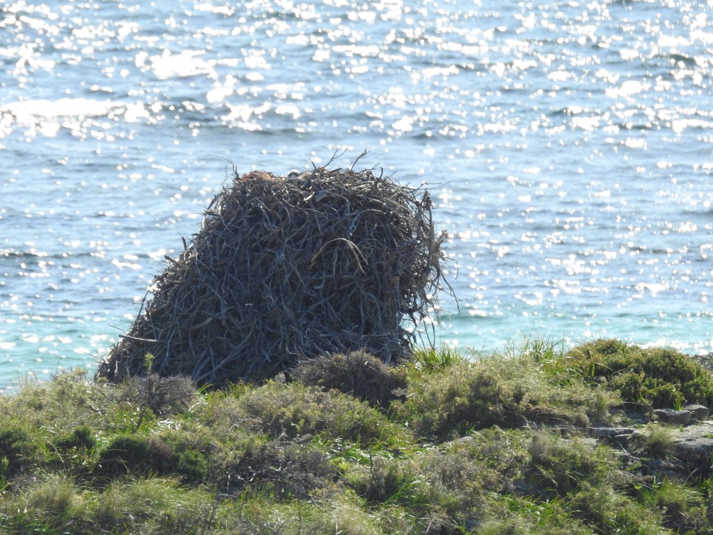 Parker Point is our stop this time & we enjoy the scenery as we walk around to Little Salmon Bay then to Salmon Bay. The day is starting to warm up. There are lots of big King Skinks (lizards) sunning themselves on the bitumen road. AT Salmon Bay there are a few people in having a swim & a snorkel, they say the water is cold. At Salmon Point we spot another Osprey nest perched on a large rock in the water & watch as an osprey brings a fish in its talon for the chick in the nest. From Salmon Bay we get great views down the coast to Cape Vlamingh & also to the Wadjemup Lighthouse.